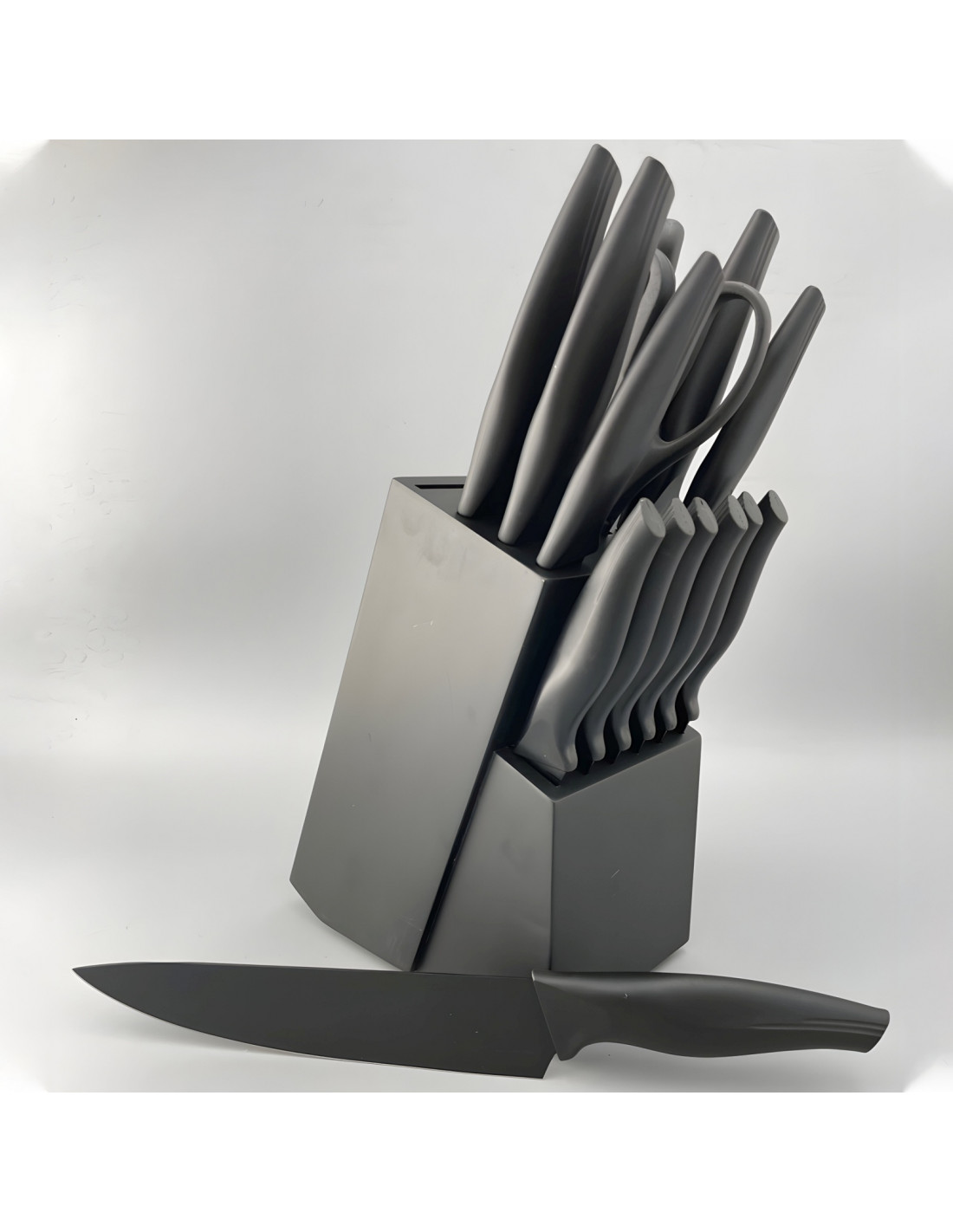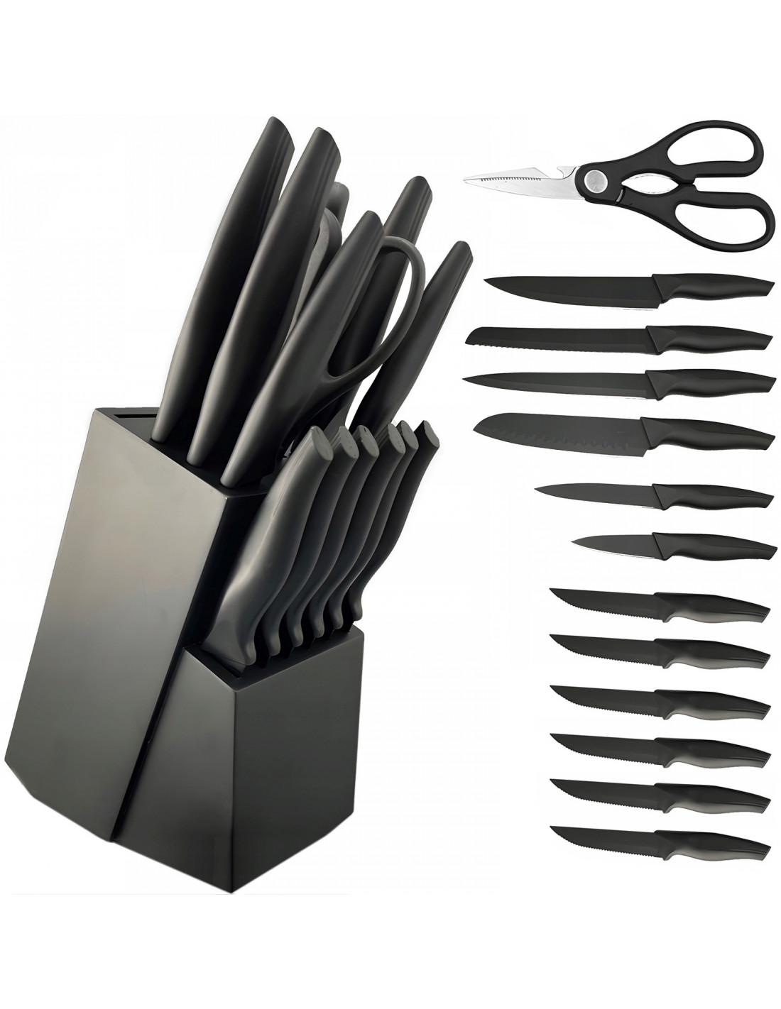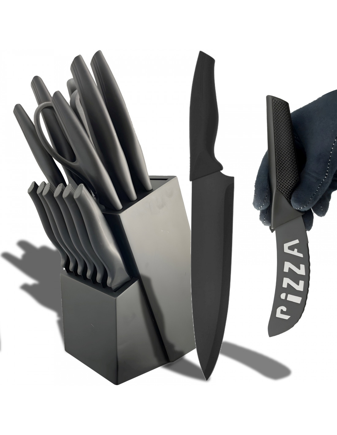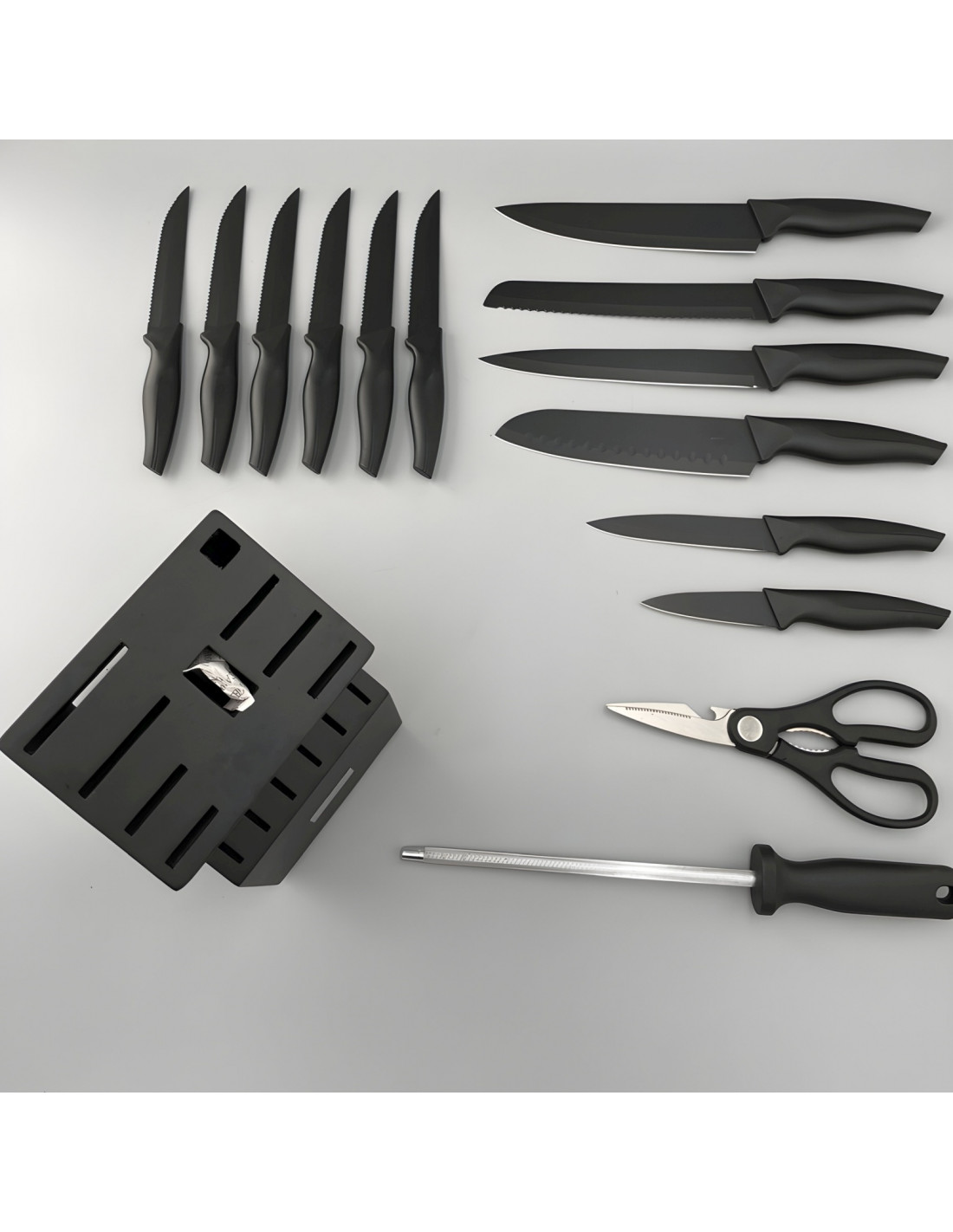 Peilių rinkinys yra būtina bet kurios virtuvės dalis, tinkanti tiek profesionaliems virėjams, tiek mėgėjams. Jis užtikrina tikslumą ir patogumą kasdien gaminant maistą, o elegantiškas juodas rankenų ir bloko dizainas taip pat suteikia jam estetinį patrauklų akcentą bet kurioje virtuvėje. Nerūdijančio plieno ašmenys užtikrina patvarumą ir lengvą valymą.