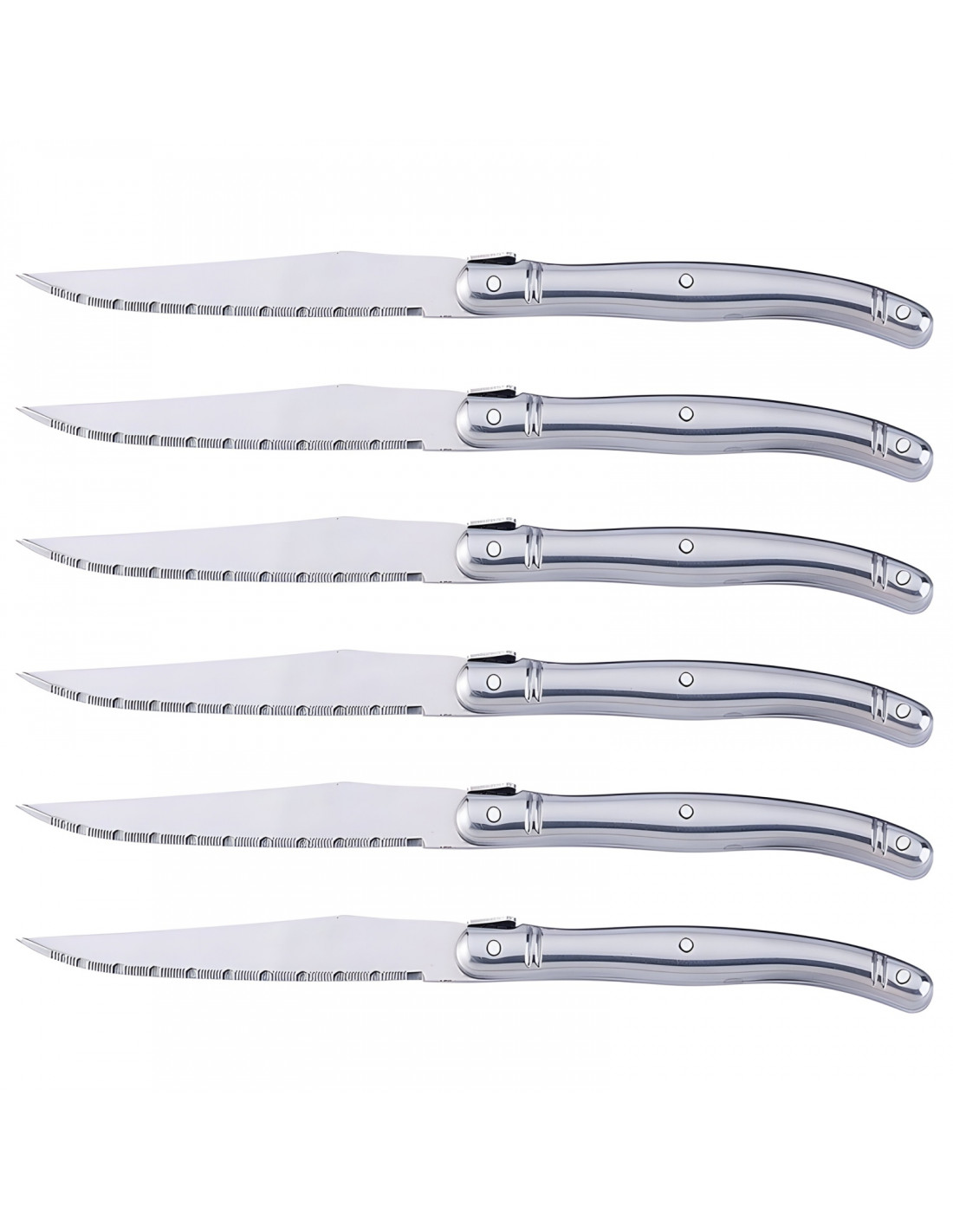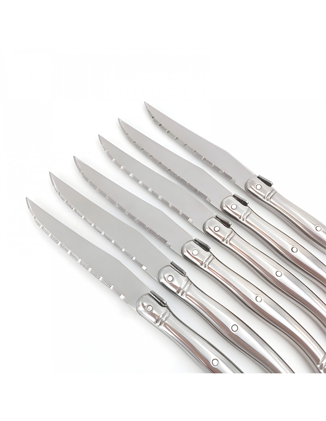 Šis kepsnių peilių rinkinys yra praktiškas ir elegantiškas įrankis, puikiai tinkantis tiek namams, tiek profesionalioms virtuvėms. Pagaminti iš aukštos kokybės nerūdijančio plieno , peiliai yra įdėti į medinį bloką , kad būtų patogu laikyti ir patvarūs. Ergonomiškos rankenos ir dantyti ašmenys leidžia tiksliai pjaustyti mėsą, išsaugant jos sultingumą ir tekstūrą. Sidabrinė spalva ir elegantiškas dizainas paverčia rinkinį stilingu bet kurios virtuvės papildymu.
