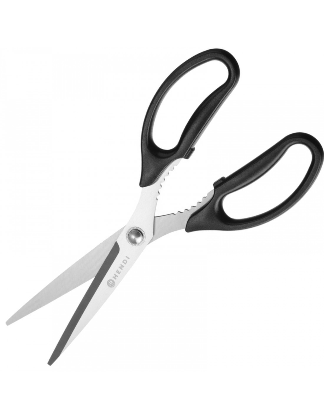 HENDI virtuvinės žirklės sujungia patvarumą ir funkcionalumą. Aštrūs nerūdijančio plieno ašmenys ir dantyti kraštai užtikrina švarų ir kontroliuojamą pjovimą viskam – nuo žolelių iki paukštienos. Simetriška polipropileno rankena patogi tiek dešiniarankiams, tiek kairiarankiams. Jas galima plauti indaplovėje.