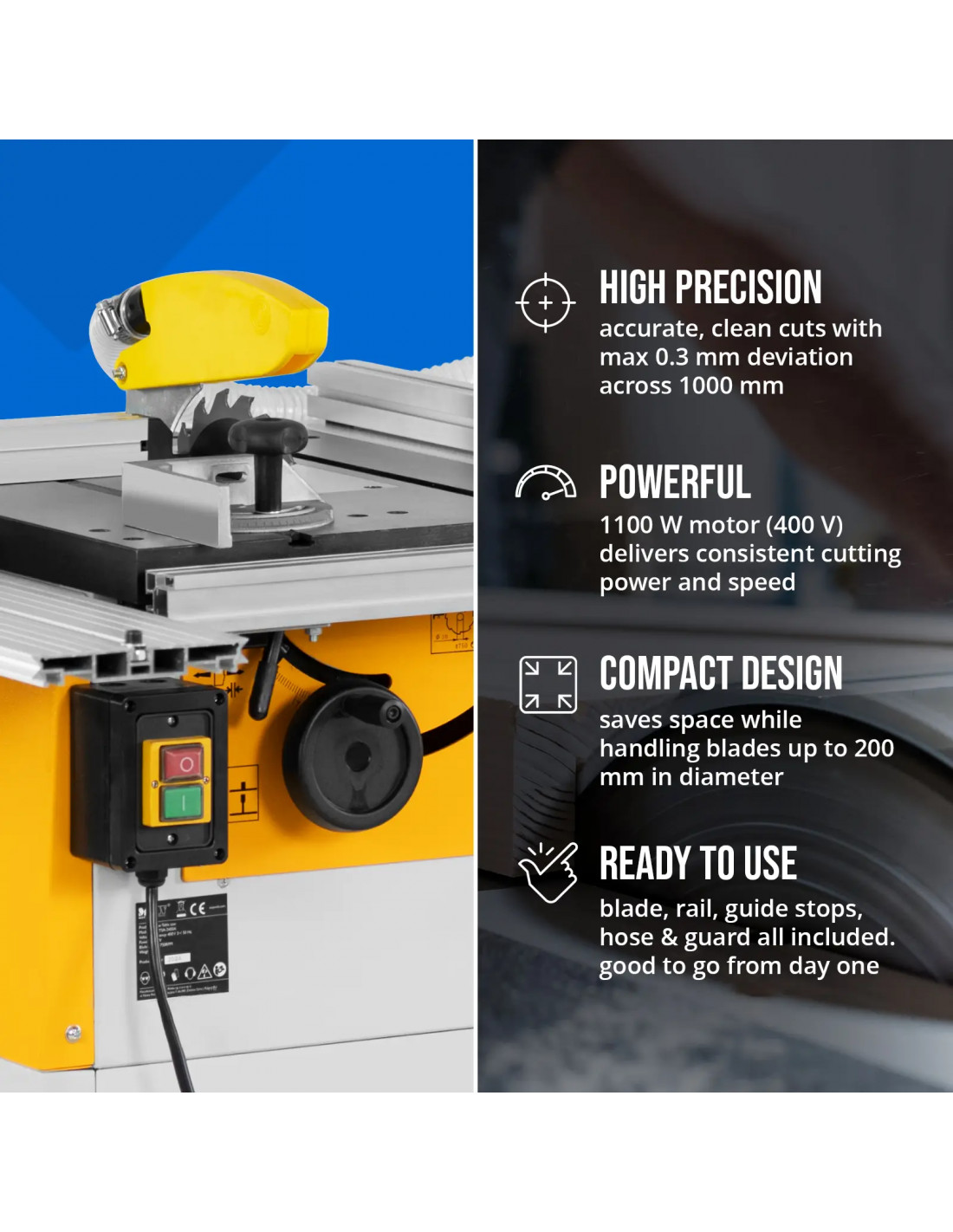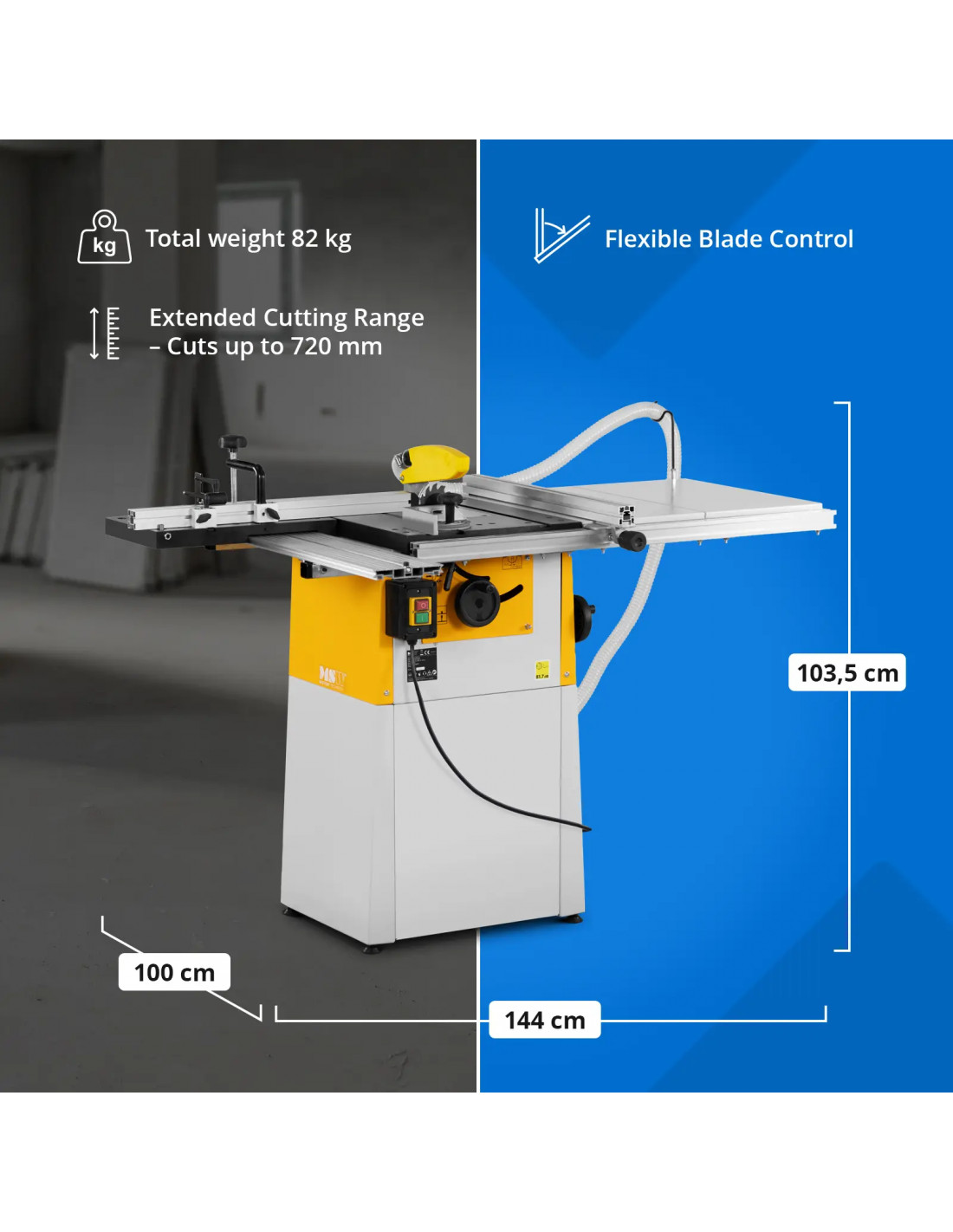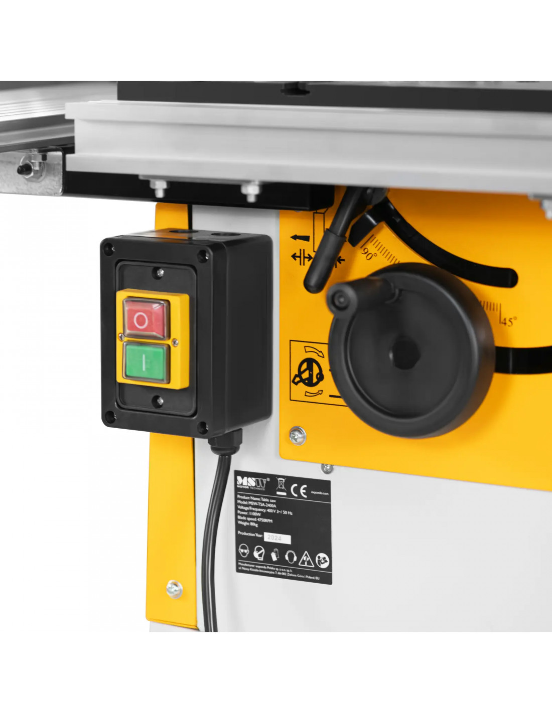 MSW-TSA-2400A stalo pjūklas leidžia apdirbti net didelius ruošinius. Galingas 1,1 kW (400 V) variklis suka 200 mm pjūklo diską 4750 aps./min. greičiu ir garantuoja švarų bei greitą pjūvį iki 60 mm gylio. Padidintas pjovimo plotis iki 720 mm leidžia maksimaliai tiksliai apdirbti lentas ir medžio masyvą. Mažai vibruojanti ketaus konstrukcija ir tiksliai išlygintas stalo paviršius sumažina nepageidaujamą vibraciją. Kartu su stabiliu veleno eiga (tik 0,05 mm koncentriškumo) tai užtikrina maksimalų saugumą ir nuosekliai tikslius pjovimo rezultatus (maks. 0,3 mm nuokrypis per 1000 mm ilgį). Aukštos kokybės kreipiančiosios atrama ir reguliuojamas aukštis bei pakreipimo kampas (45–90 laipsnių) leidžia pritaikyti diskinį pjūklą prie apdorojamos medžiagos. Šios ergonomiškai suprojektuotos stalo pjūklo staklės, kurių darbinis aukštis yra 870 mm, užtikrina patogų naudojimą net ir ilgesnį laiką dirbtuvėse ar statybvietėje. Stabilus slankiojantis vežimėlis pagerina tiek išilginių, tiek skersinių pjūvių tikslumą. Integruotas 100 mm dulkių ištraukimo prievadas ir 3 m ilgio žarna padeda palaikyti švarią ir be dulkių darbo aplinką. Taip pat pridedamas pjūklo diskas, tvorelė ir kiti priedai, užtikrinantys, kad pjūklas būtų nedelsiant paruoštas naudoti.