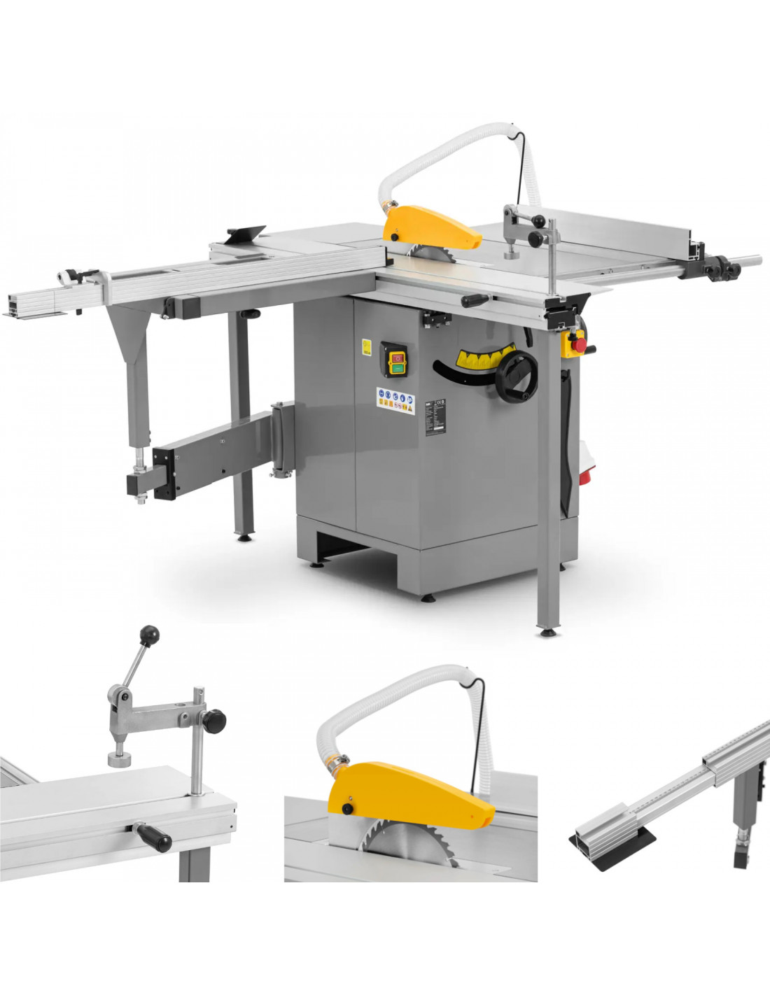 Šios MSW stumdomos stalo pjūklo staklės su slankiojančiu vežimėliu leidžia savarankiškai pjauti dideles medines lentas. 79 x 35 cm darbinis stalas suteikia daug vietos saugiam lentų kreipimui. Du prailginimai suteikia dar didesnę judėjimo laisvę dirbant. Juos galima naudoti darbiniam paviršiui išplėsti 35 x 35 cm ir 79 x 27 cm. Dėl 82 cm darbinio aukščio visada galite dirbti patogioje padėtyje. Tvirta konstrukcija ir plieninis stalviršis užtikrina, kad stalas atlaikytų dideles apkrovas. Turėdami 2000 W galią ir 4000 aps./min. greitį, galite lengvai pjauti iki 80 mm storio lentas. Stalo pjūklo 254 mm pjovimo gylis patogiai reguliuojamas alkūnine rankena. Diską galima pakreipti 45 laipsnių kampu, kad būtų galima pjauti naudojant skalę. 132 cm ilgio slankiojantis vežimėlis leidžia medieną vesti lygiagrečiai ir tiesiai per diską. Disko apsauga turi siurbimo žarną, skirtą prijungti prie pramoninio dulkių siurblio. Tai nuo pat pradžių apsaugo jūsų darbo vietą nuo dulkių ir drožlių.