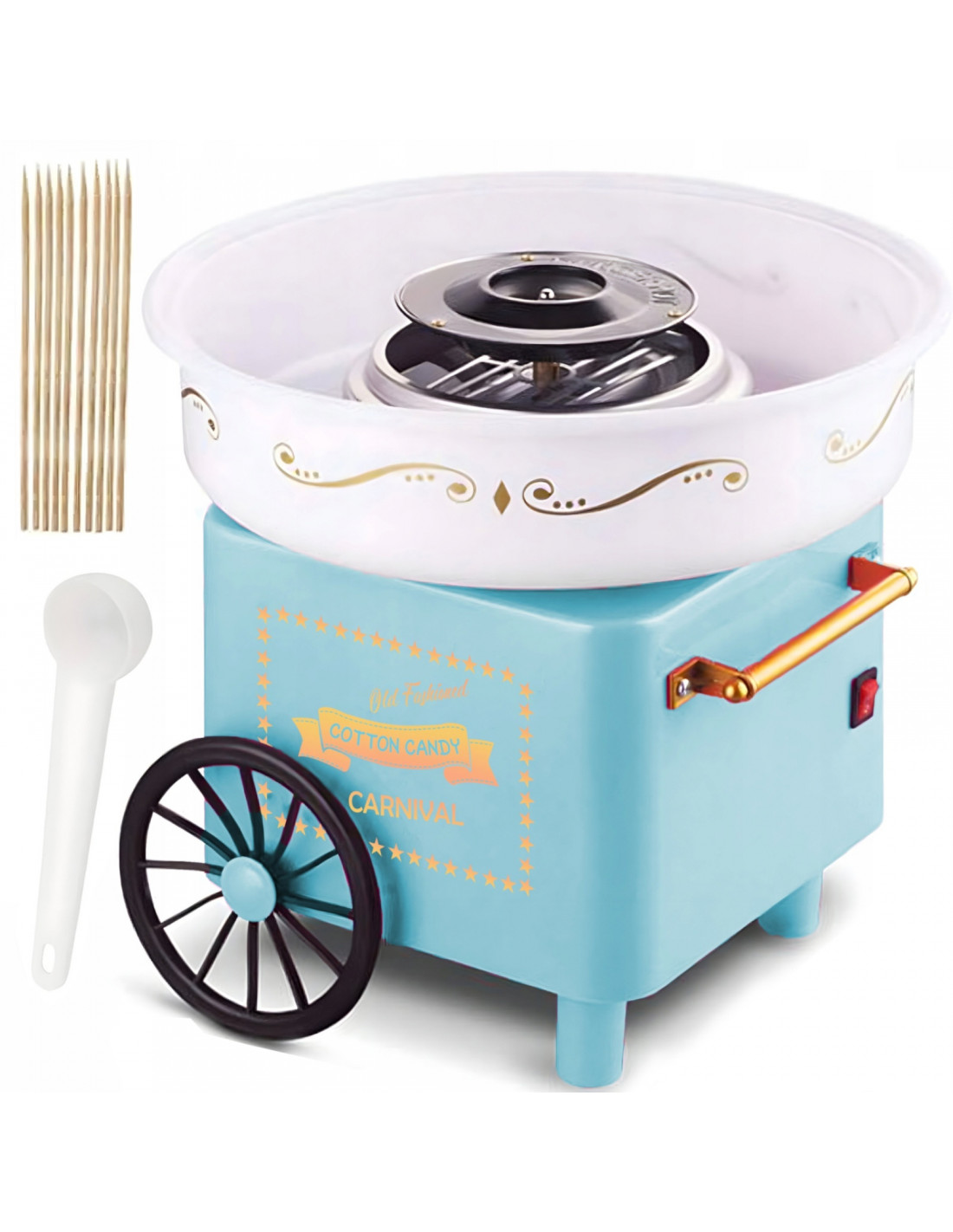 Naminis cukraus vatos aparatas su pagaliukais ir matavimo puodeliu, mėlynas rinkinys