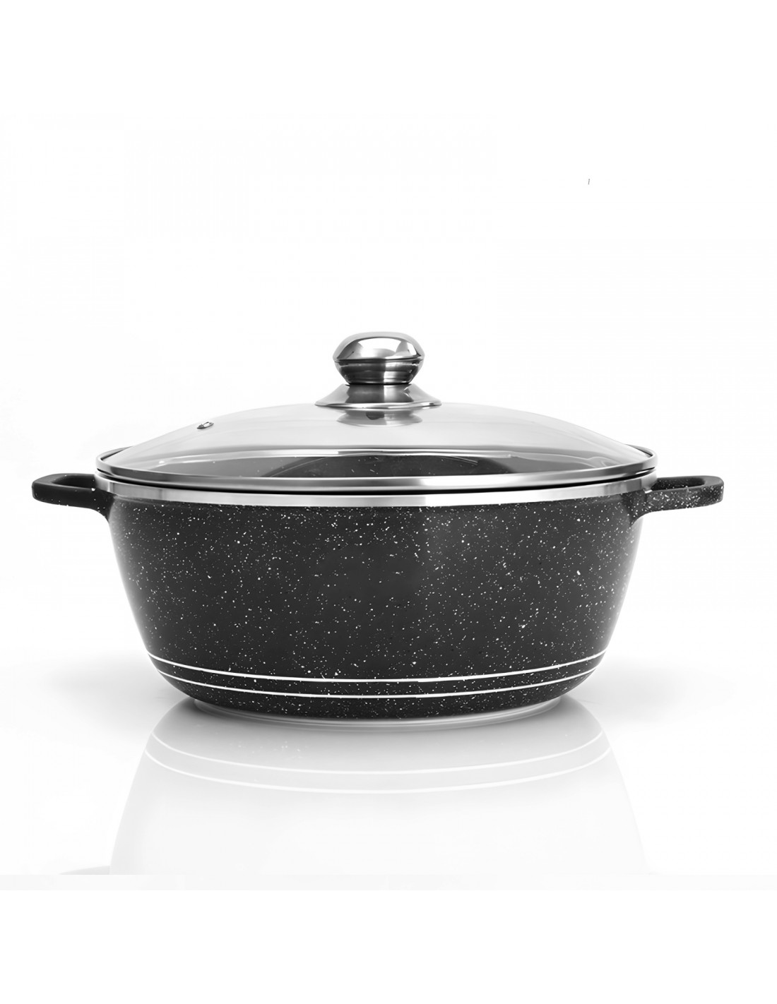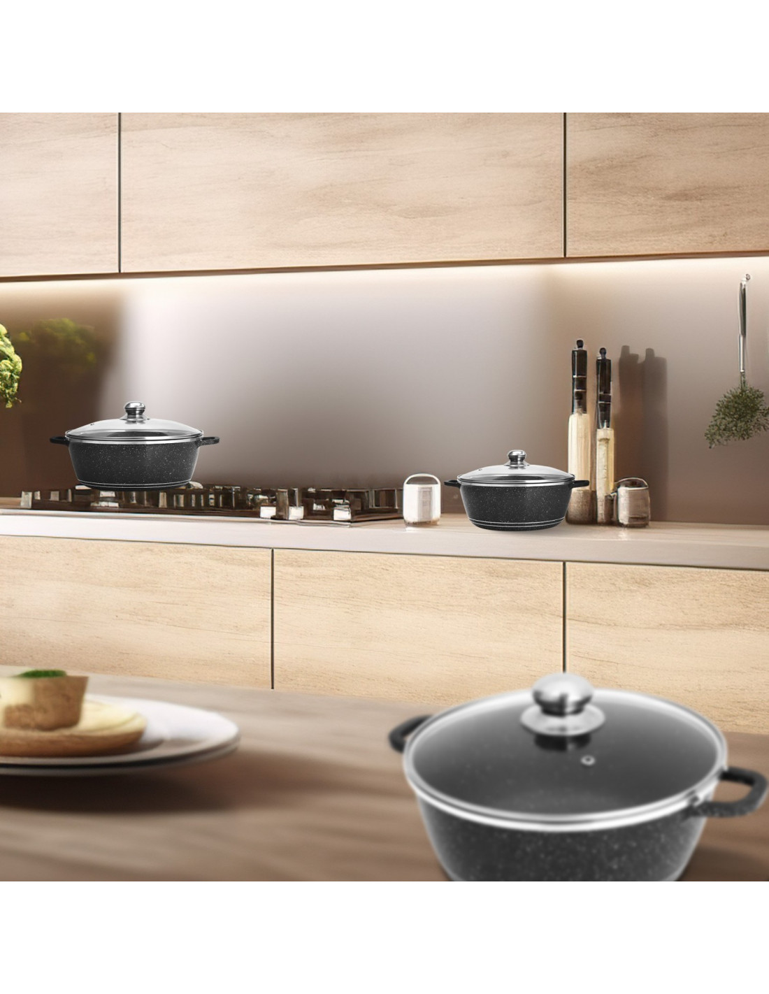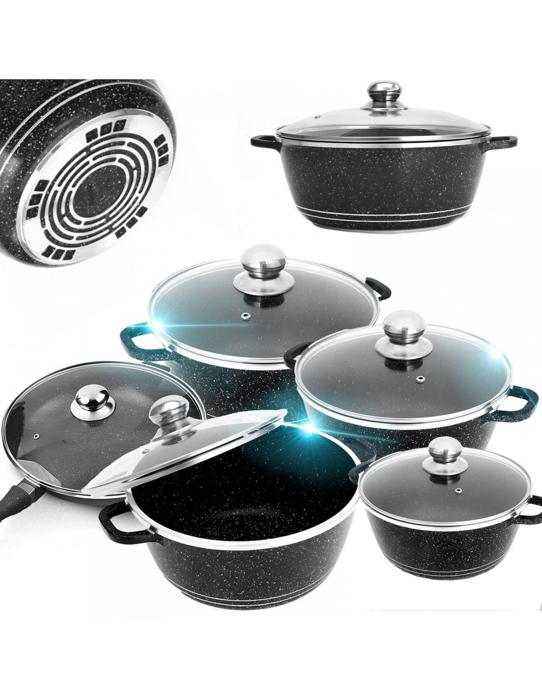 Šis pilnas 12 dalių keramika dengtų puodų ir keptuvių rinkinys tinka visoms viryklėms, įskaitant indukcines. Puodai pagaminti iš granitu dengto aliuminio lydinio , užtikrinančio patvarumą, atsparumą aukštai temperatūrai ir tolygų šilumos paskirstymą. Neprideganti, įbrėžimams atspari keraminė danga leidžia patogiai gaminti, o valymas – greitas ir paprastas. Modernus juodas dizainas su elegantiškomis detalėmis suteikia indams puikią išvaizdą ir papildo bet kurią virtuvę. Į rinkinį taip pat įeina apsauginės pirštinės.