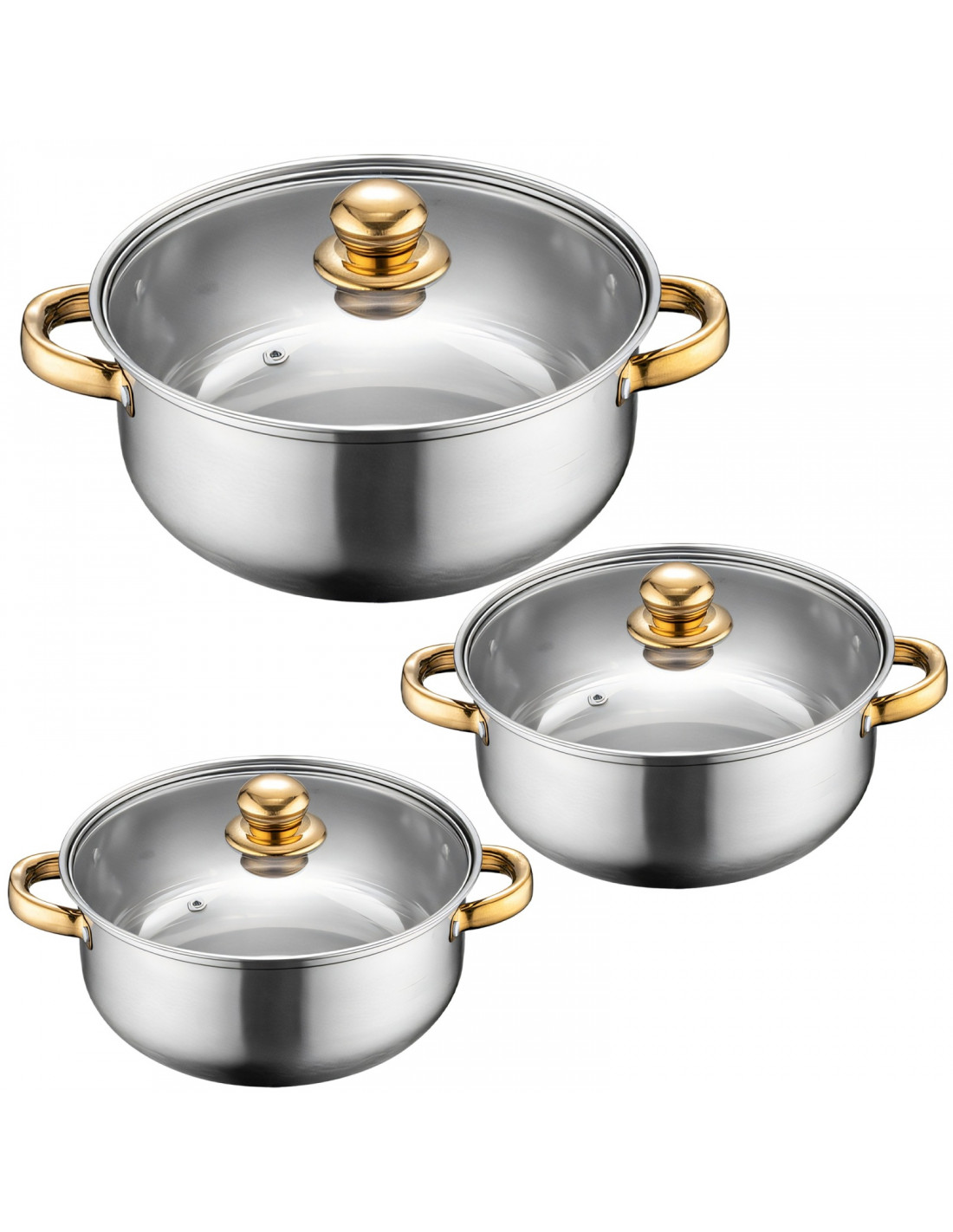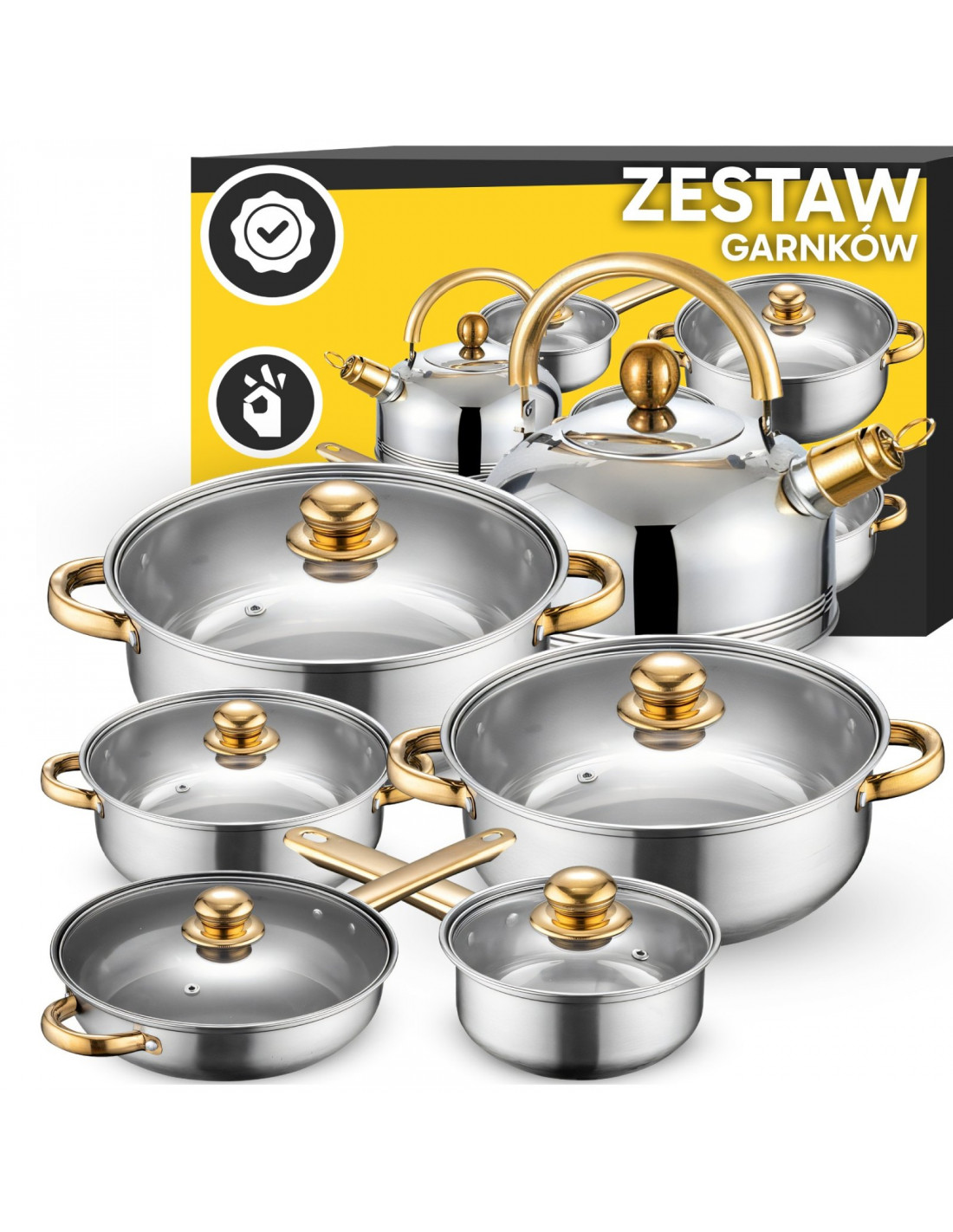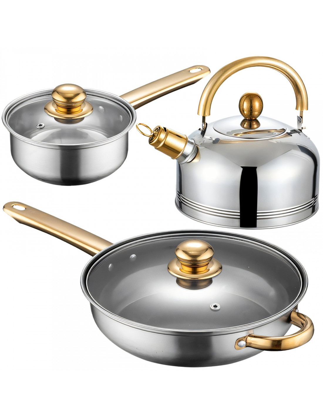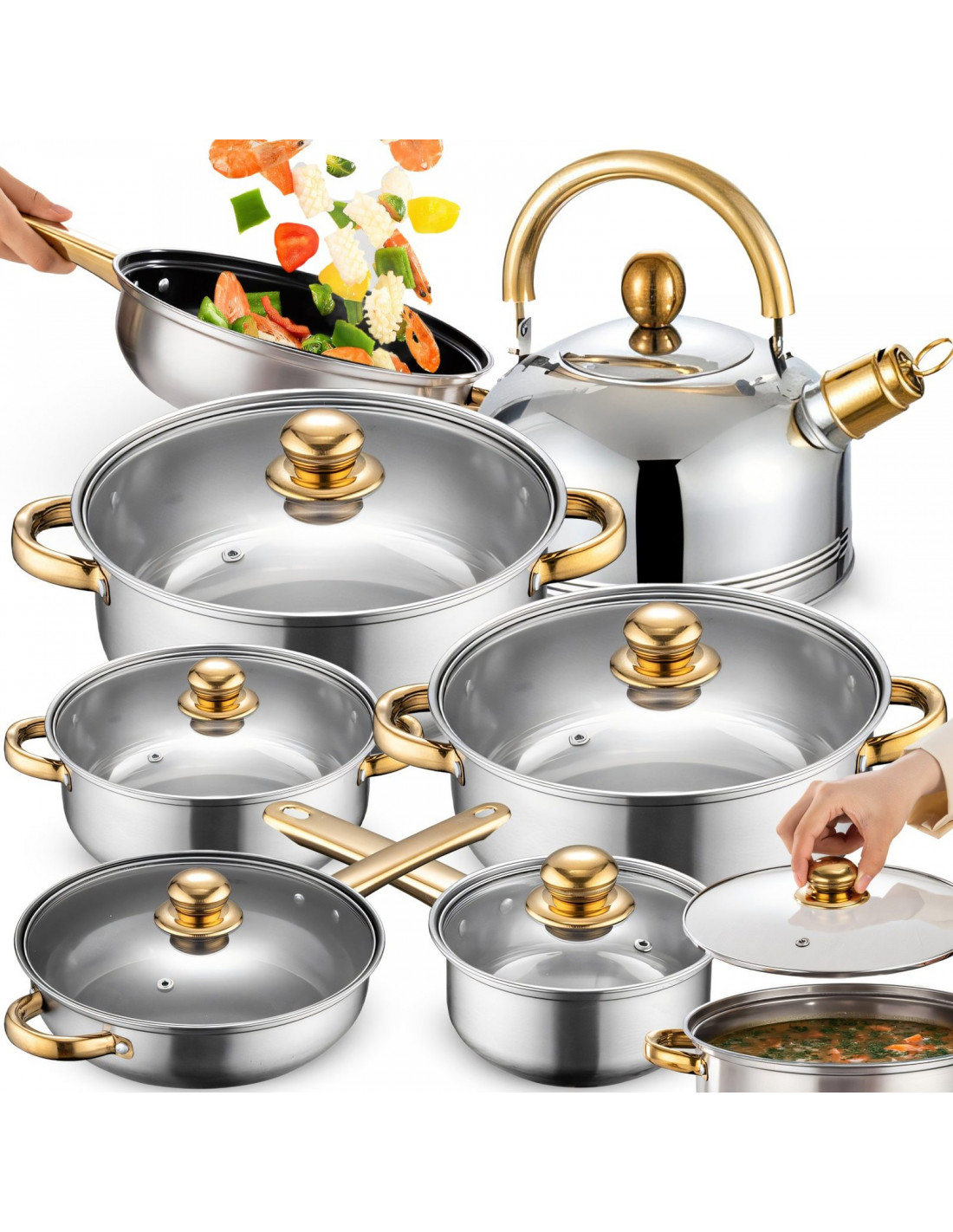 11 dalių „Retoo“ virtuvės reikmenų rinkinys yra elegantiškas ir funkcionalus , skirtas visų tipų viryklėms – dujinėms, indukcinėms, keraminėms ir halogeninėms. Pagamintas iš nerūdijančio plieno su aukso spalvos akcentais , padengtas nelimpančia keramine danga, kad būtų lengva ir patogu gaminti. Grūdinto stiklo dangčiai su garų išleidimo anga , tinkami plauti indaplovėje, ir ergonomiškos rankenos užtikrina patogumą ir saugumą. Produkto savybės: