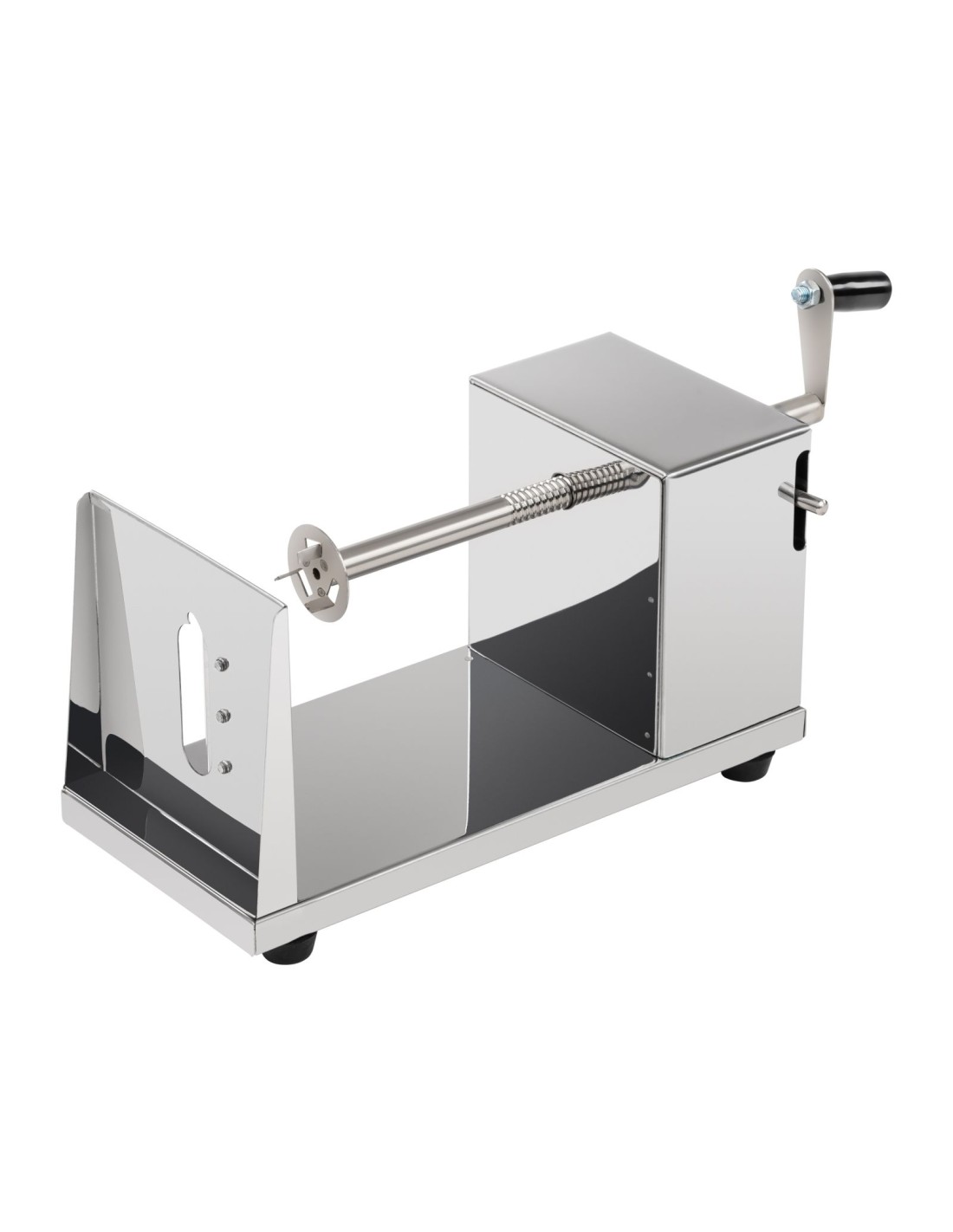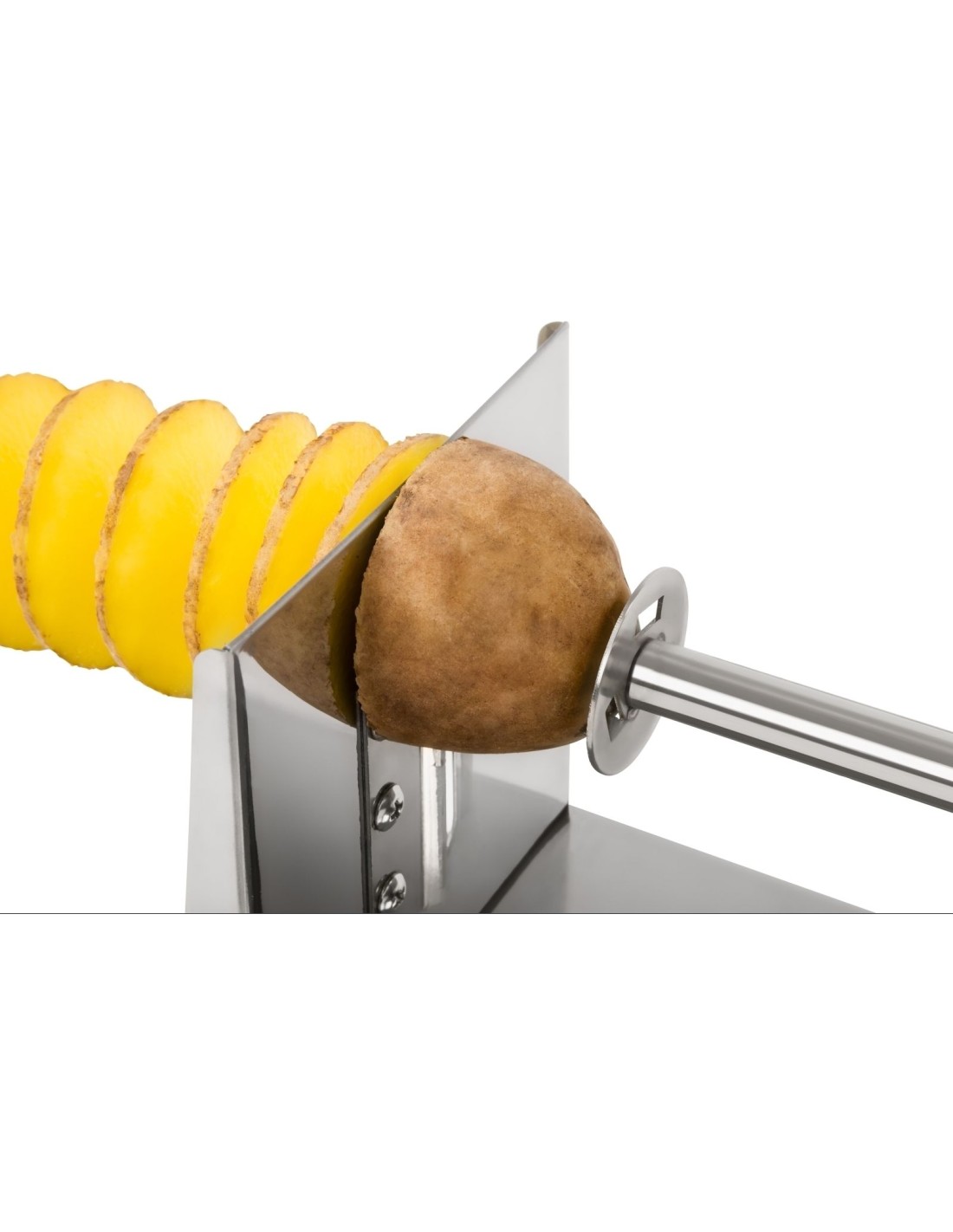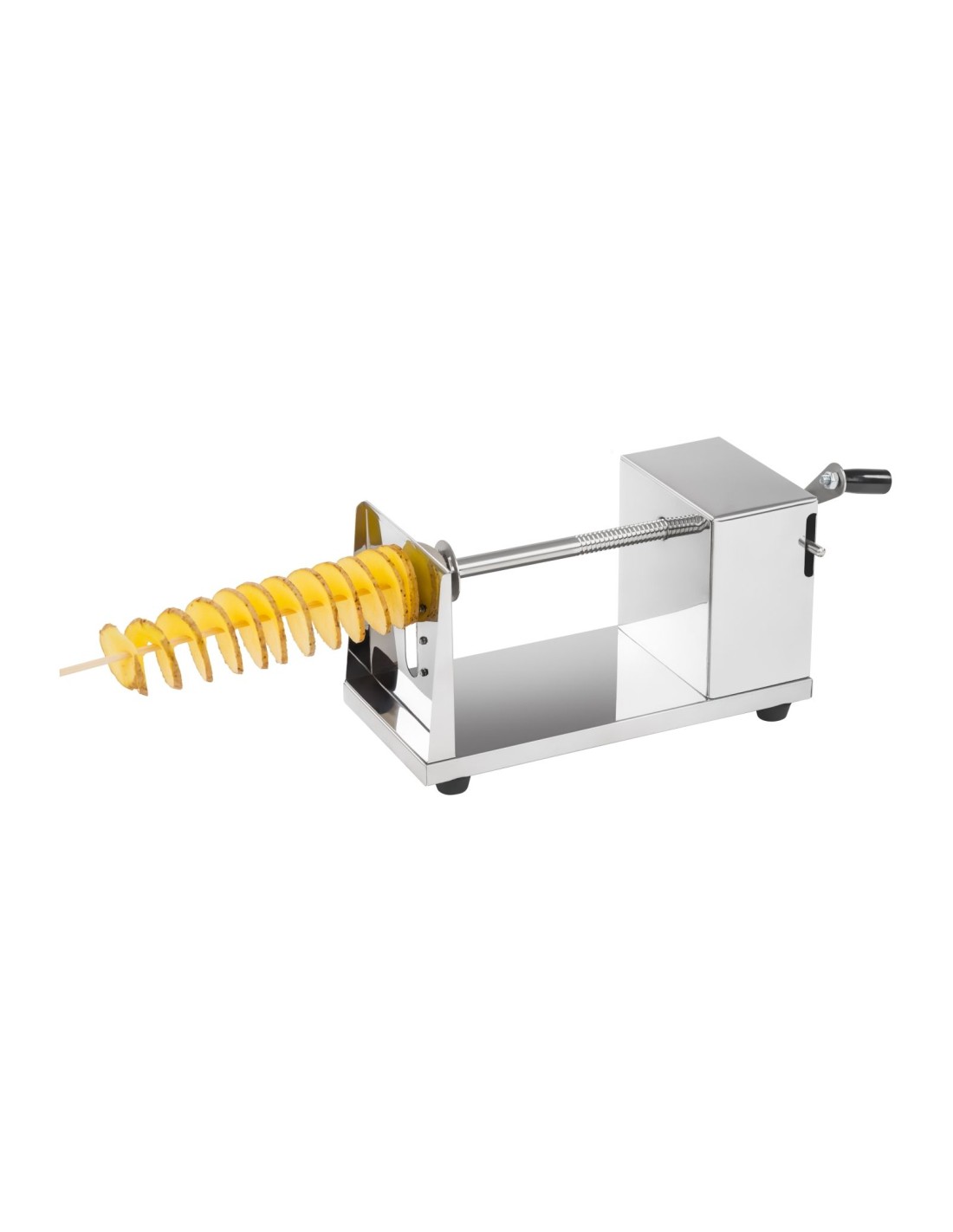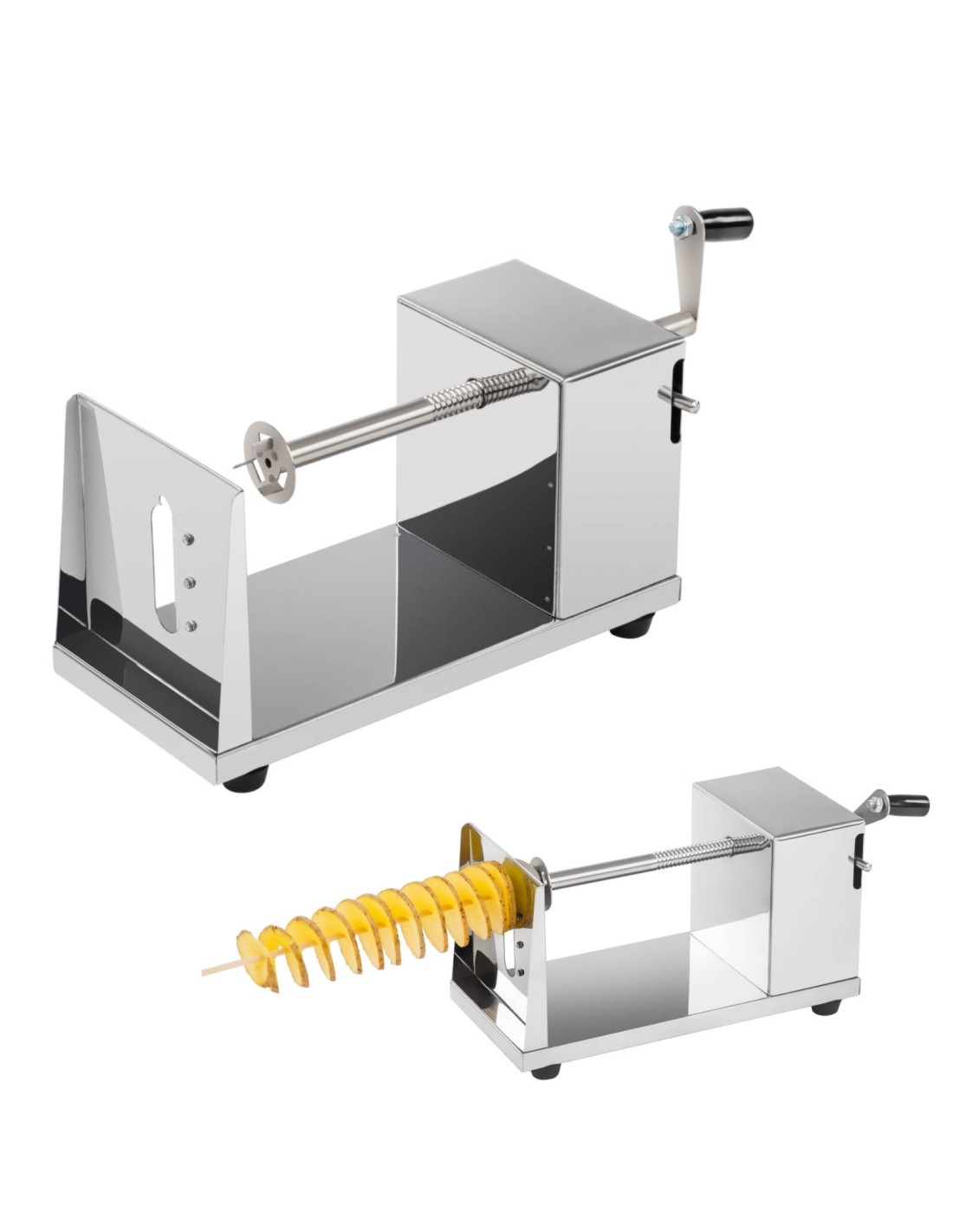 Profesionali, rankinė vien iš plieno bulvių pjaustyklė, naudojama ruošiant labai populiarias ir skanias „susuktas bulves“ „skrudintas ant pagaliuko“ „tviserio traškučius“