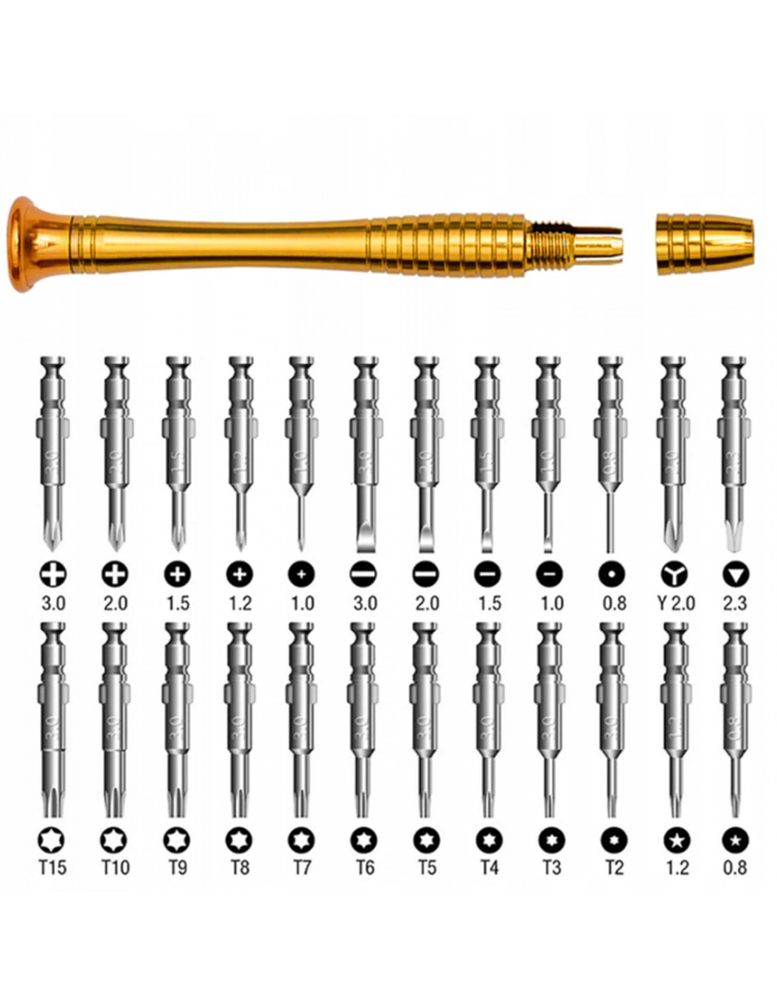 - - Įvairūs antgaliai: Phillips, plokšti, Torx, penkių žvaigždučių, Y formos, trikampiai, smailūs