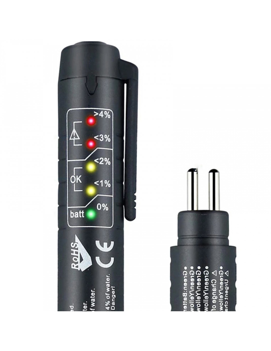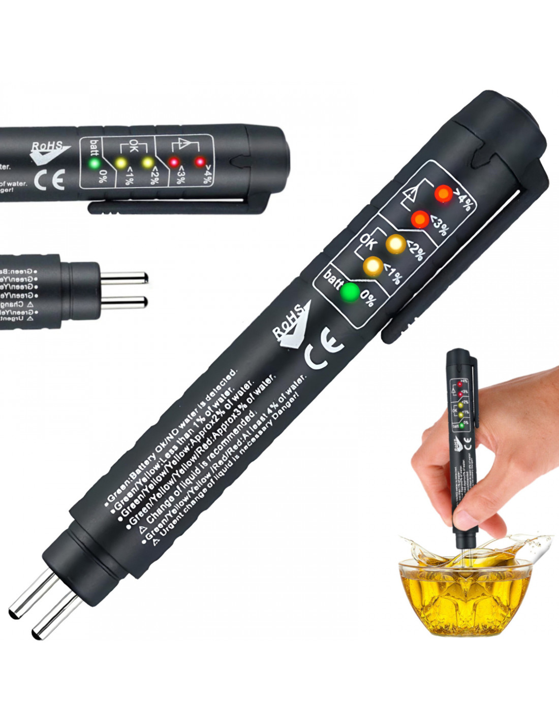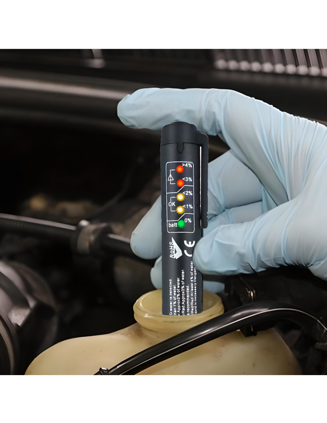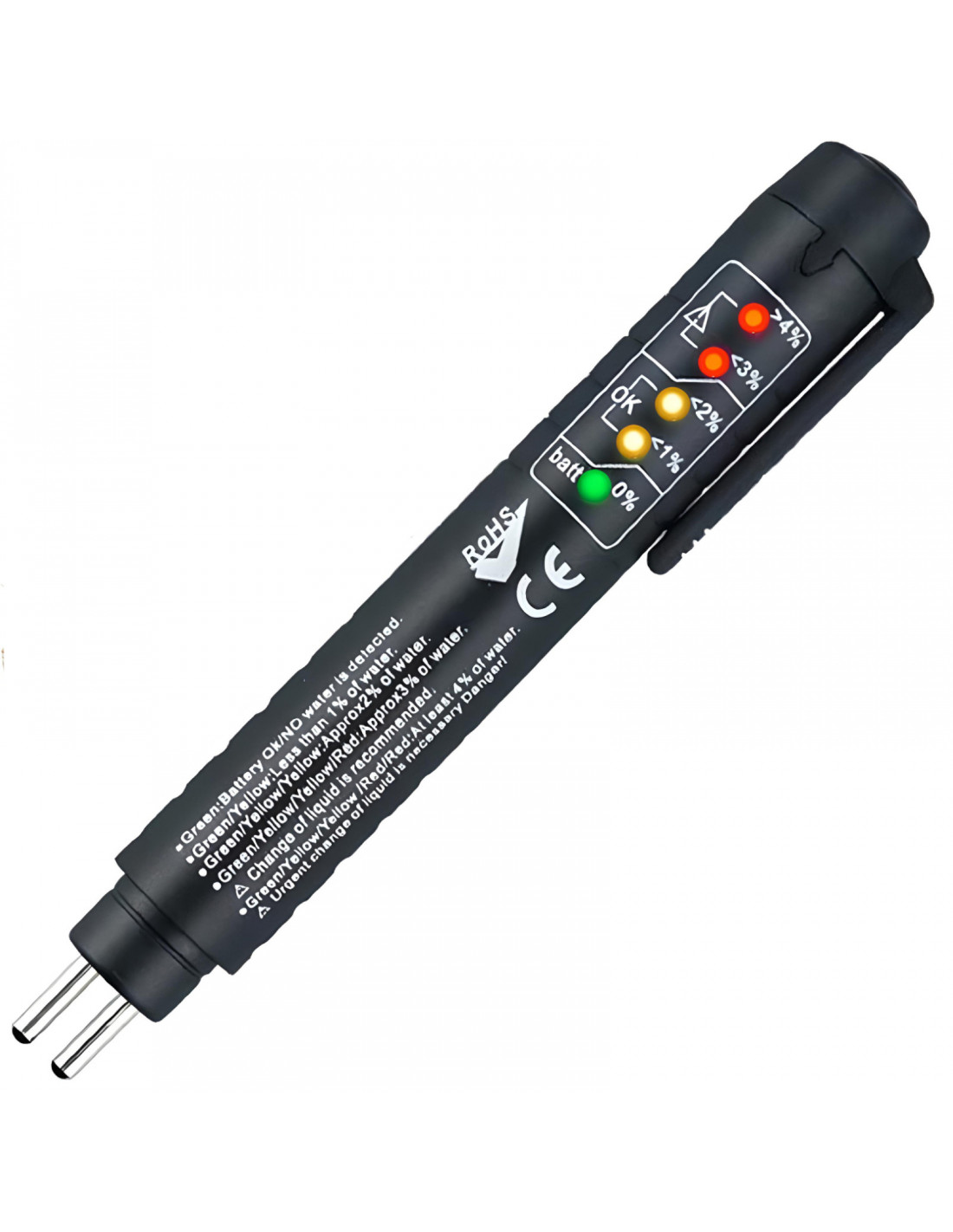 Stabdžių skysčio testeris automobiliams, sunkvežimiams ir motociklams, skirtas greitai ir tiksliai patikrinti DOT3, DOT4, DOT5 ir DOT5.1 stabdžių skysčio kokybę. Įrenginys su 5 šviesos diodais leidžia įvertinti vandens kiekį stabdžių skystyje ir rodo, kada jį reikia pakeisti. Testeris yra kompaktiškas, patvarus ir daugkartinio naudojimo, maitinamas AAA baterija, su automatiniu išsijungimu.