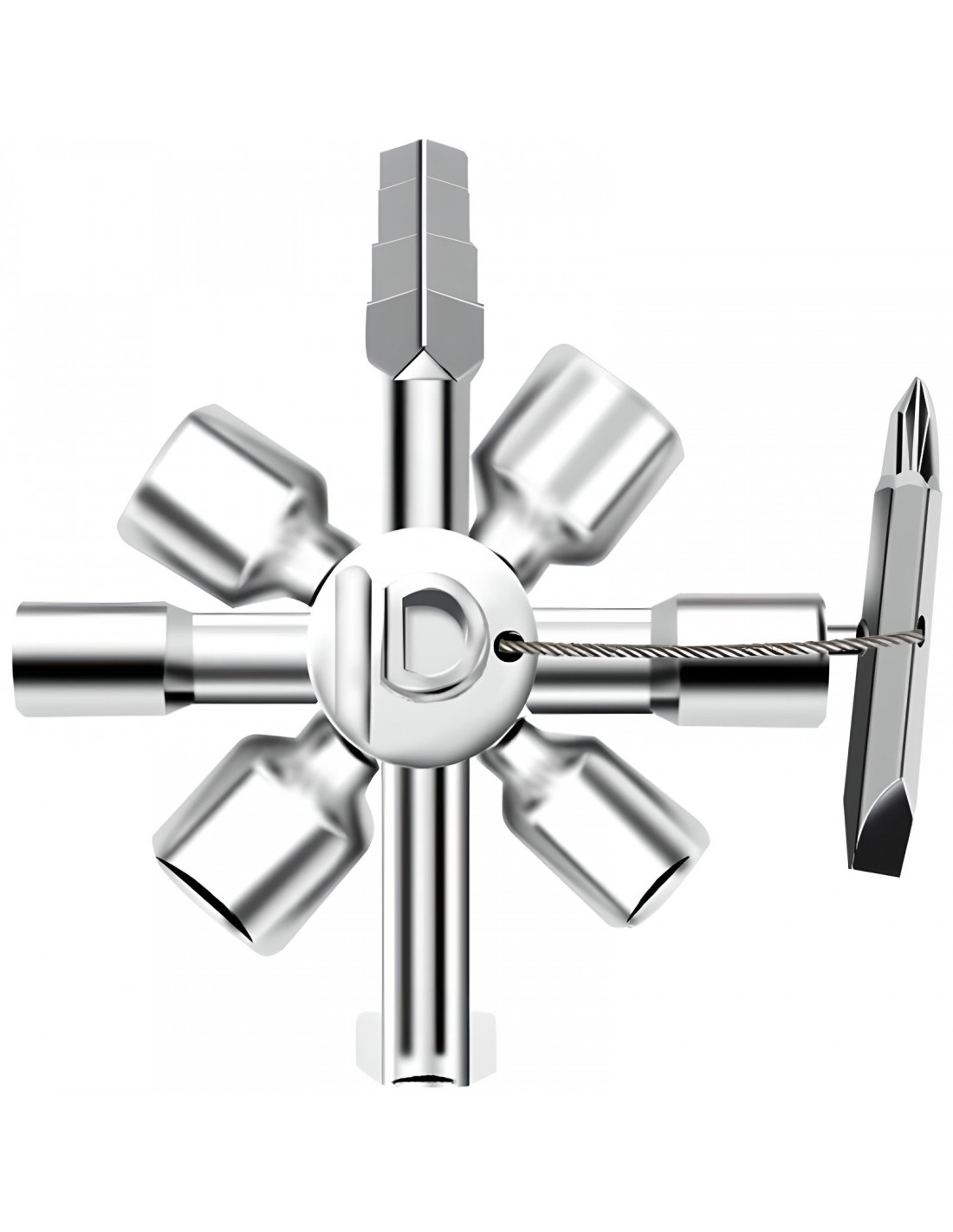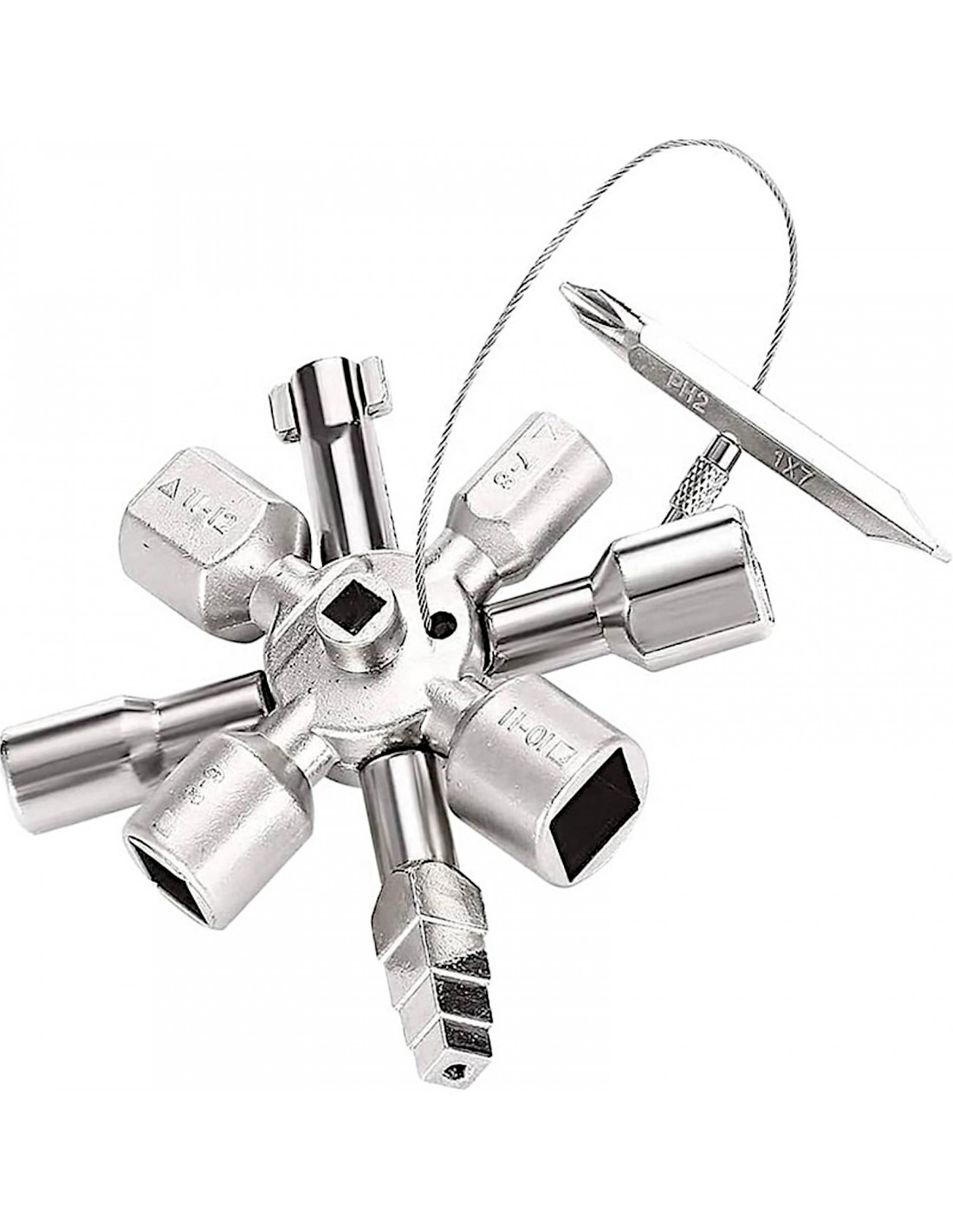 10 viename universalus valdymo spintos raktas yra praktiškas įrankis elektrikams, gelbėtojams ir pastatų valdytojams. Turėdamas 10 skirtingų antgalių, jis leidžia atidaryti daugumą rinkoje esančių valdymo spintų. Pagamintas iš plieno, jis yra patvarus ir kompaktiškas, lengvai telpa į krepšį ar įrankių dėžę.