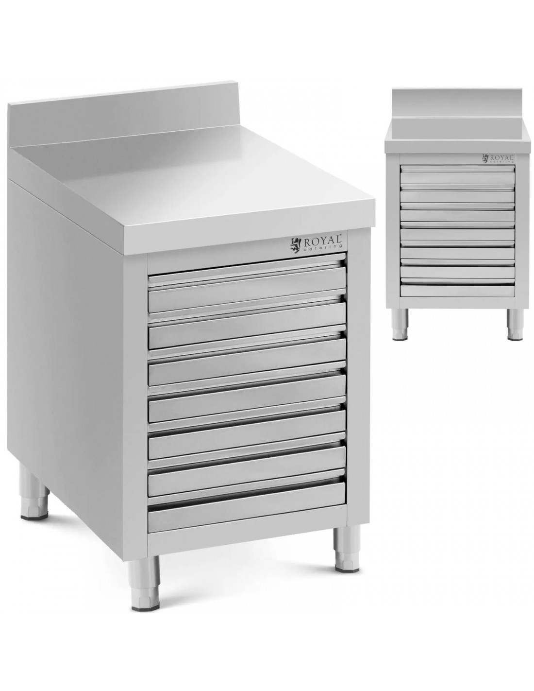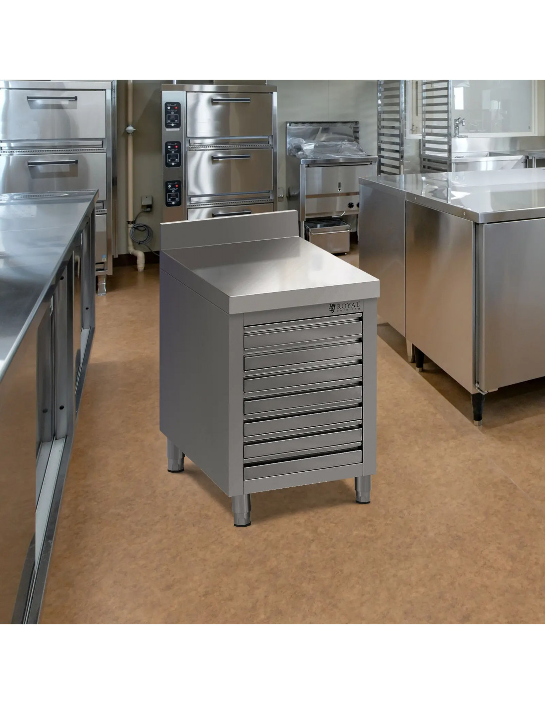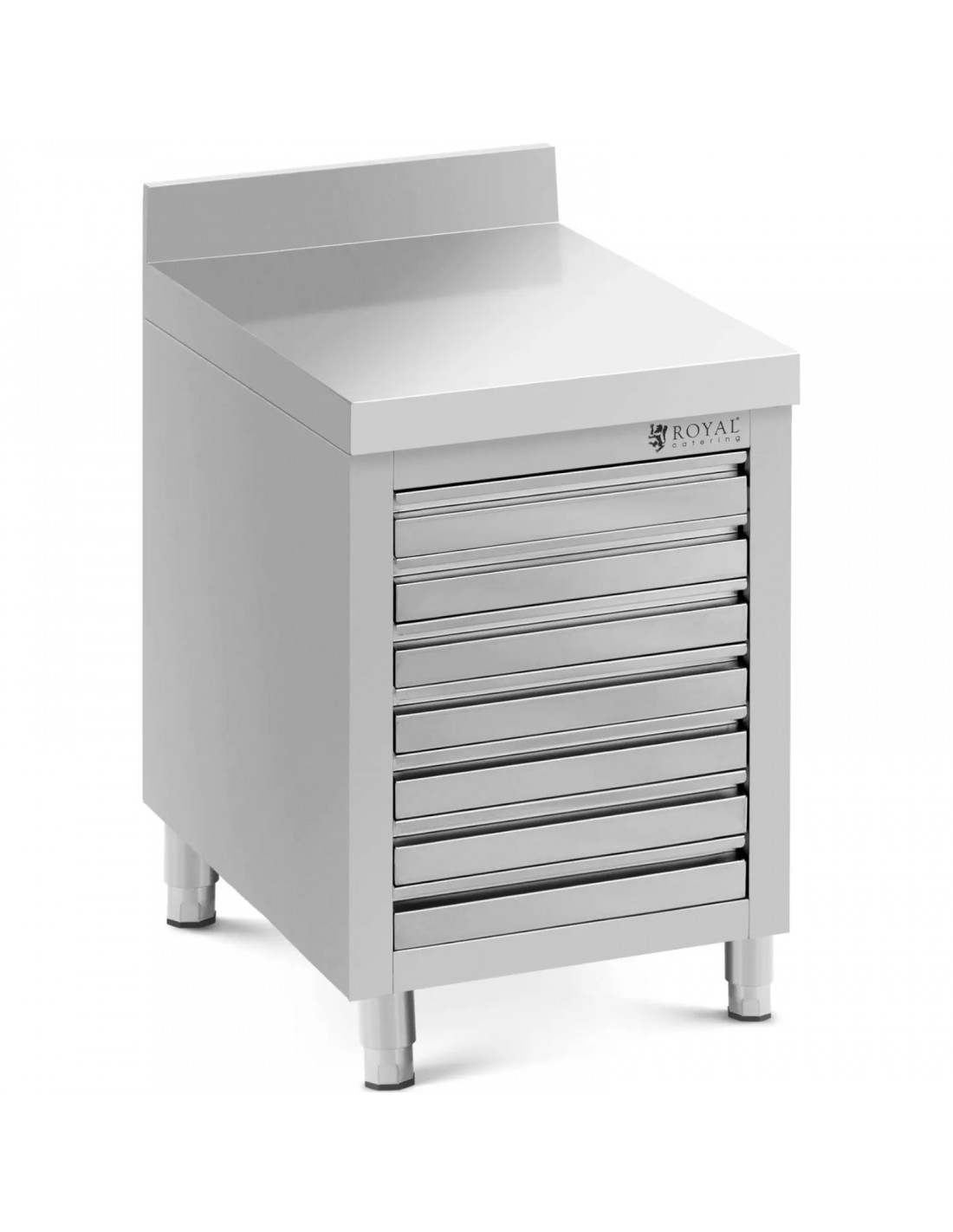 Ši „Royal Catering“ nerūdijančio plieno darbo spintelė pasižymi tvirta konstrukcija ir apgalvotu dizainu, todėl idealiai tinka picerijoms, kepykloms ar didelėms virtuvėms. 50 x 70 cm dydžio MDF plokštėmis sutvirtintas stalviršis suteikia daug vietos porcijoms, minkymui ir tešlos rutuliukų formavimui. Paruoštus patiekalus, padažus ir kitus ingredientus galite laikyti septyniuose sklandžiai veikiančiuose stalčiuose, kurių kiekvieno matmenys – 35,3 x 35,5 x 5 cm , o svoris – iki 5 kg. Dėl to ši maitinimo spintelė idealiai tinka tvarkingam ir higieniškam maisto ar darbo įrankių laikymui. Dėl aukštos kokybės nerūdijančio plieno darbo spintelė yra patvari ir lengvai valoma. Ji taip pat turi vandeniui atsparų kraštą. Pagrindas yra 15 cm aukštyje nuo grindų, todėl jį lengva valyti, o reguliuojamos kojelės (iki 2 cm) užtikrina stabilų pagrindą ant įvairių, net ir nelygių, paviršių. Be to, spintelę galima greitai surinkti vos keliais paprastais žingsniais.