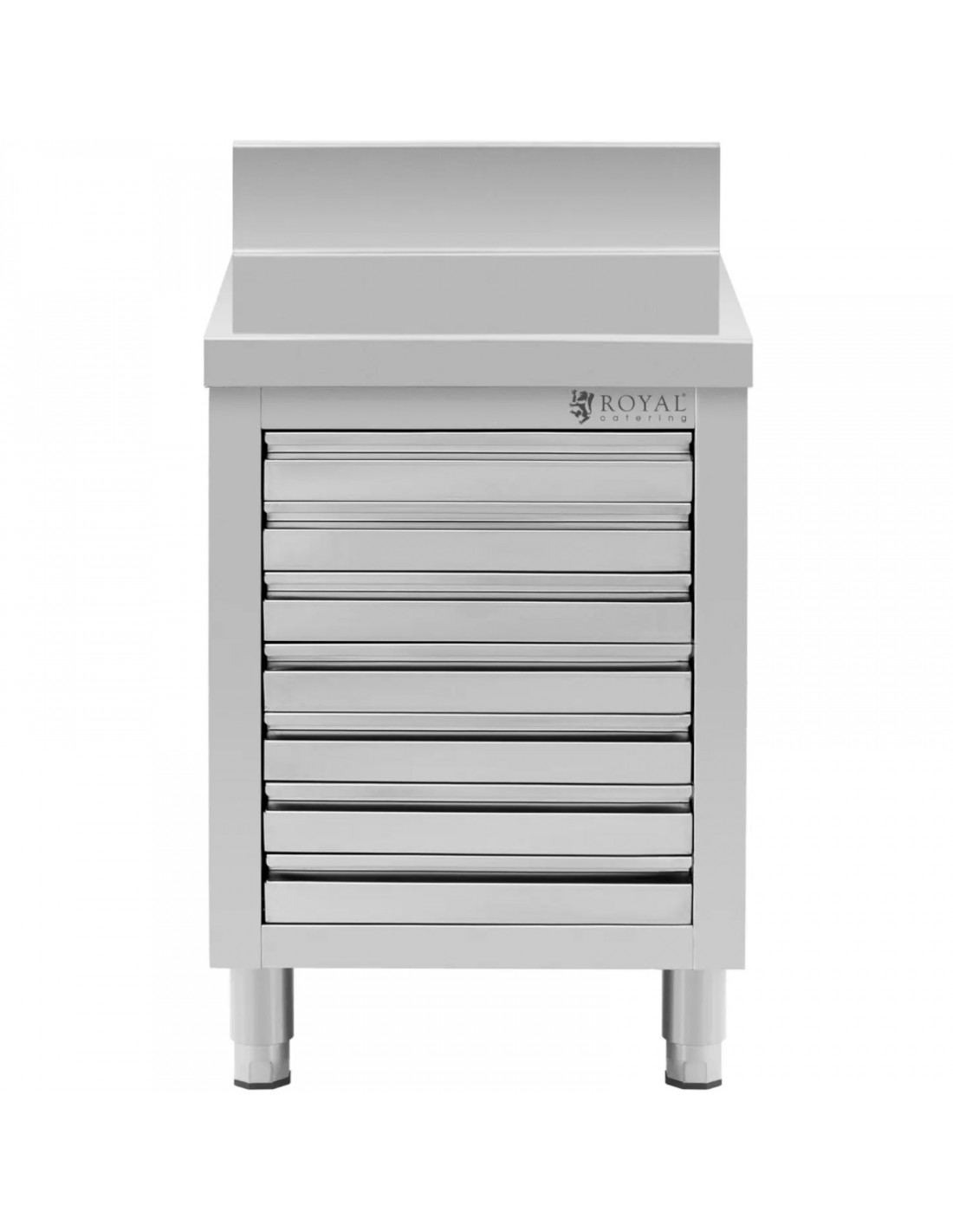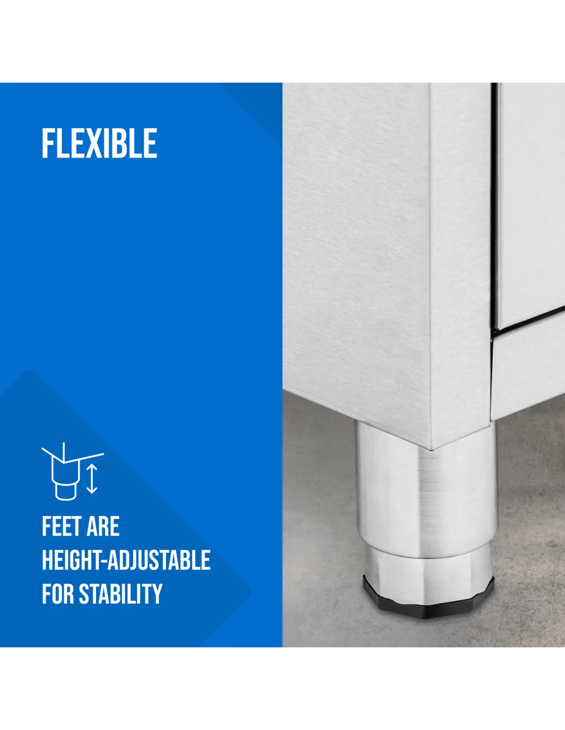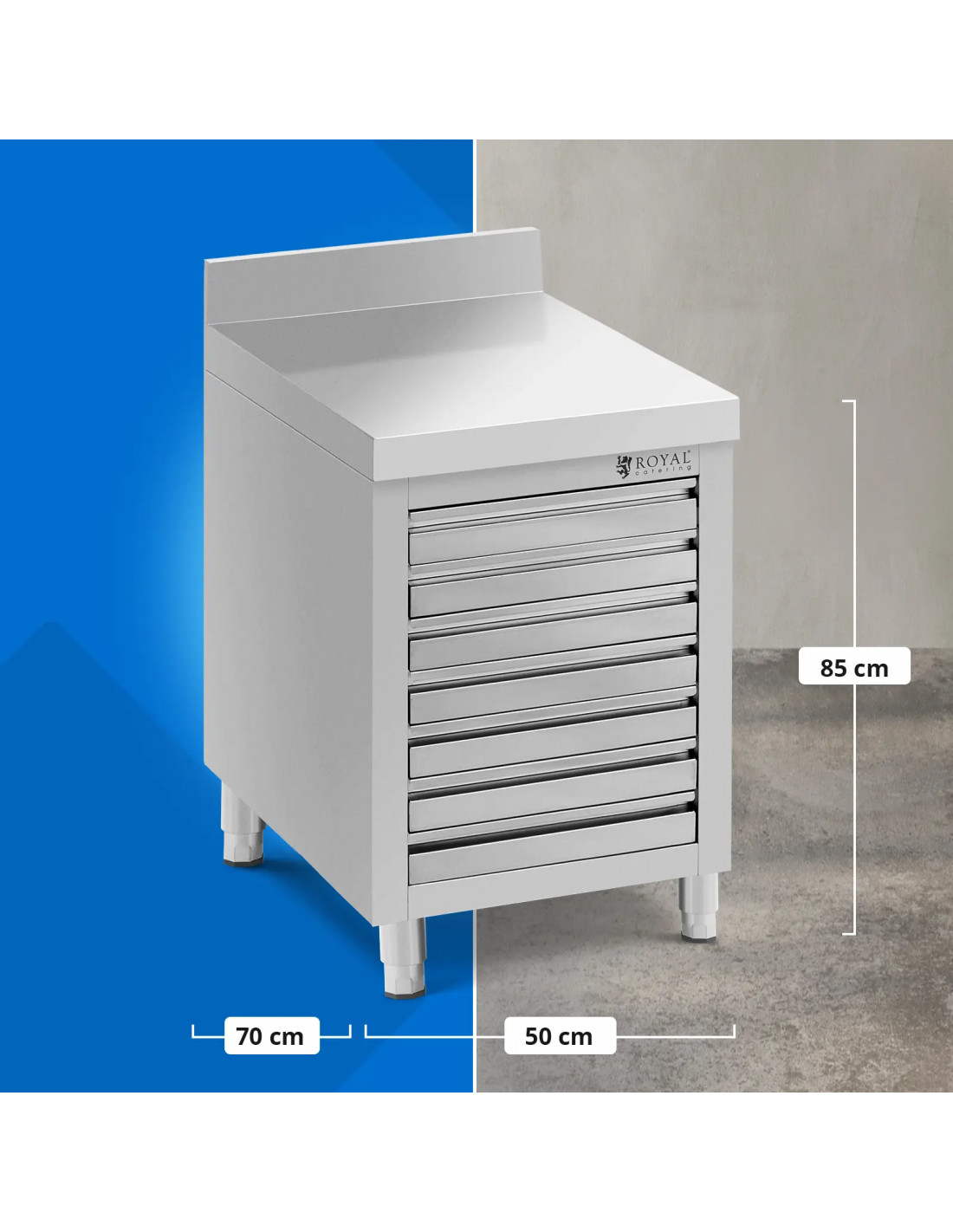 Ši „Royal Catering“ nerūdijančio plieno darbo spintelė pasižymi tvirta konstrukcija ir apgalvotu dizainu, todėl idealiai tinka picerijoms, kepykloms ar didelėms virtuvėms. 50 x 70 cm dydžio MDF plokštėmis sutvirtintas stalviršis suteikia daug vietos porcijoms, minkymui ir tešlos rutuliukų formavimui. Paruoštus patiekalus, padažus ir kitus ingredientus galite laikyti septyniuose sklandžiai veikiančiuose stalčiuose, kurių kiekvieno matmenys – 35,3 x 35,5 x 5 cm , o svoris – iki 5 kg. Dėl to ši maitinimo spintelė idealiai tinka tvarkingam ir higieniškam maisto ar darbo įrankių laikymui. Dėl aukštos kokybės nerūdijančio plieno darbo spintelė yra patvari ir lengvai valoma. Ji taip pat turi vandeniui atsparų kraštą. Pagrindas yra 15 cm aukštyje nuo grindų, todėl jį lengva valyti, o reguliuojamos kojelės (iki 2 cm) užtikrina stabilų pagrindą ant įvairių, net ir nelygių, paviršių. Be to, spintelę galima greitai surinkti vos keliais paprastais žingsniais.