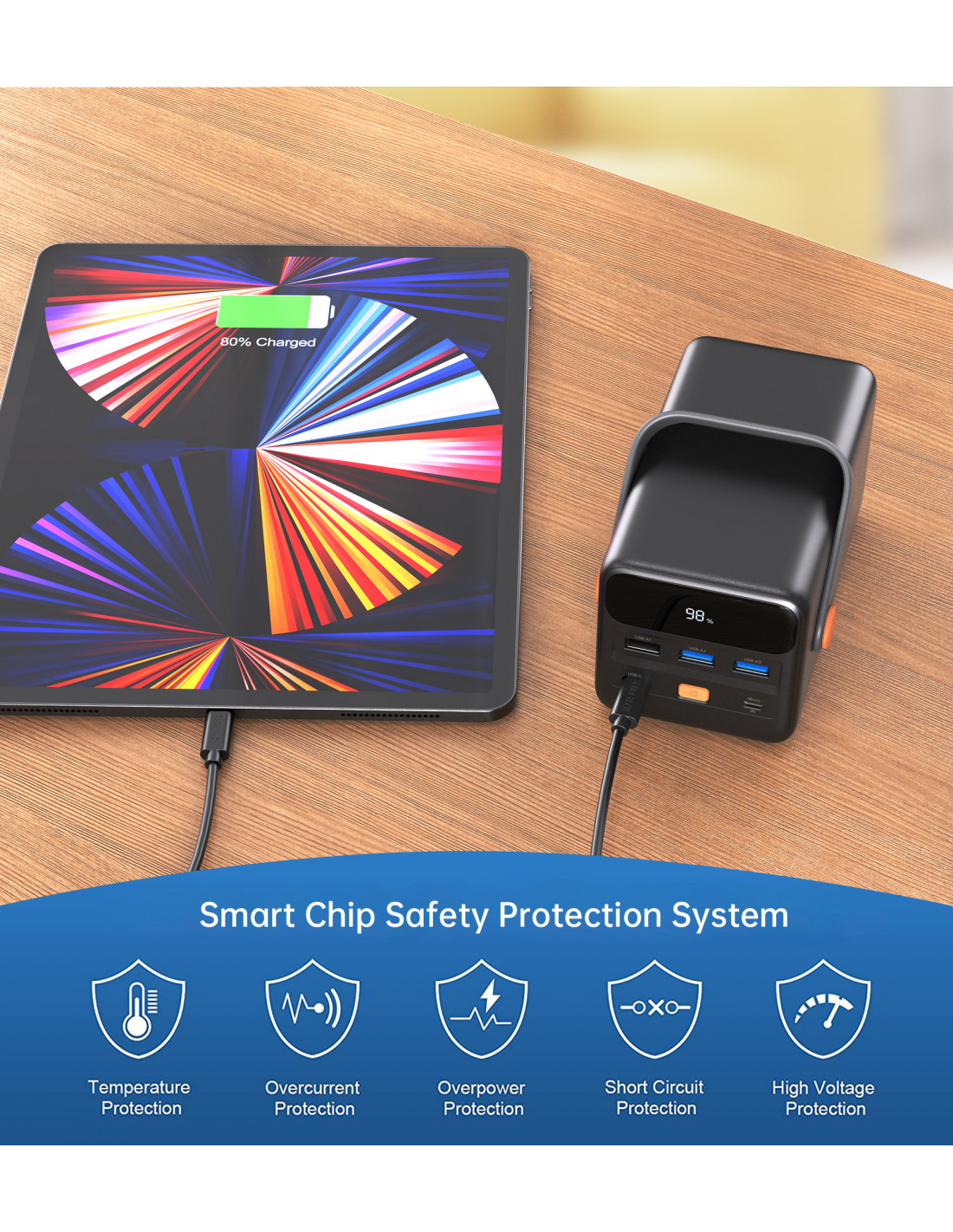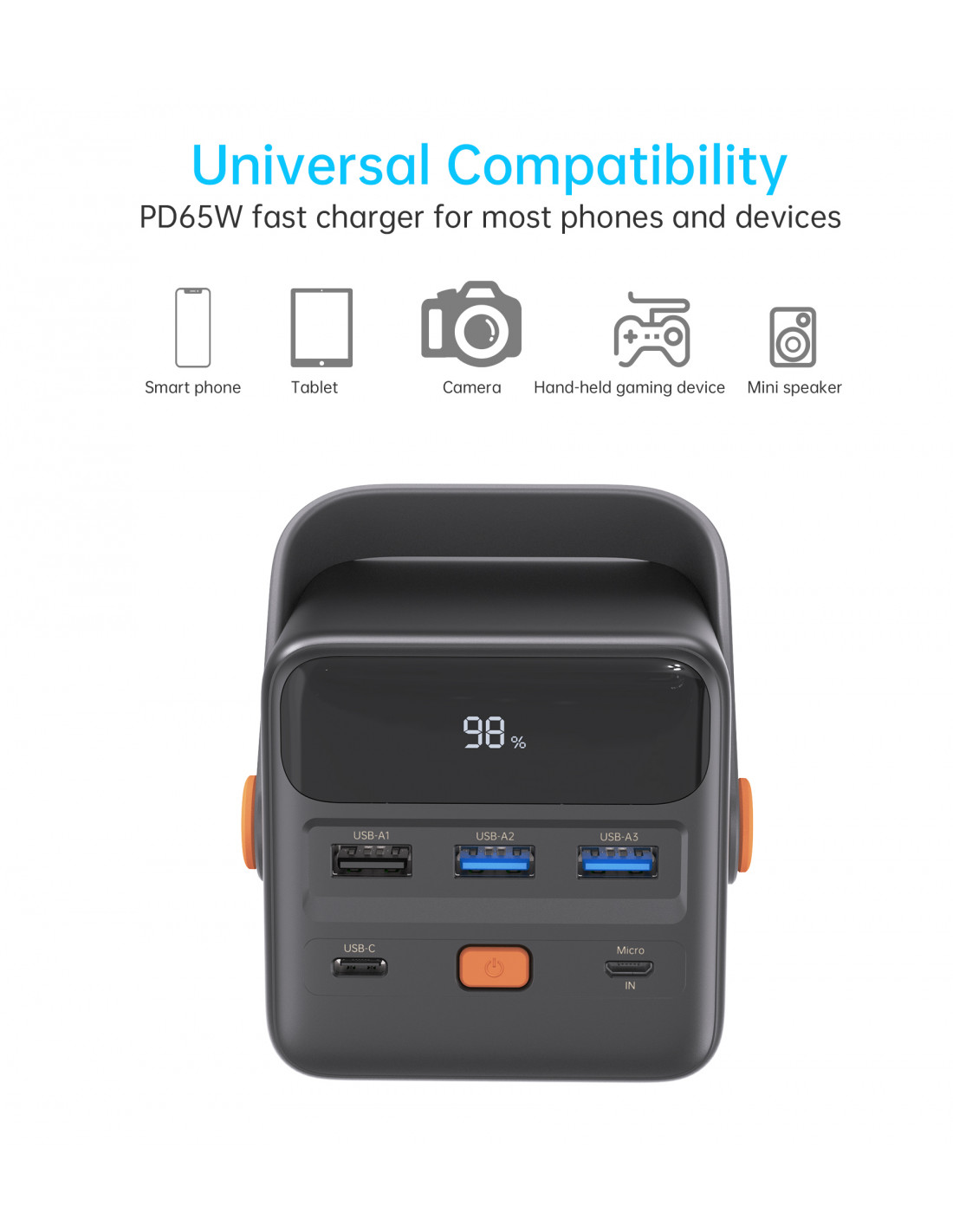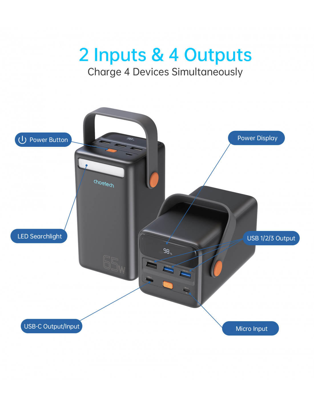 „Choetech B664“ įkrovimo stotelė užtikrina patikimą maitinimą iki keturių įrenginių vienu metu. Ji turi 50 000 mAh talpą ir įkrauna įrenginius iki 65 W galia. Ji puikiai veikia su įvairiais įrenginiais, tokiais kaip išmanieji telefonai, planšetiniai kompiuteriai, fotoaparatai, garsiakalbiai ir ausinės. Ji turi patogią rankeną ir įmontuotą LED lemputę.