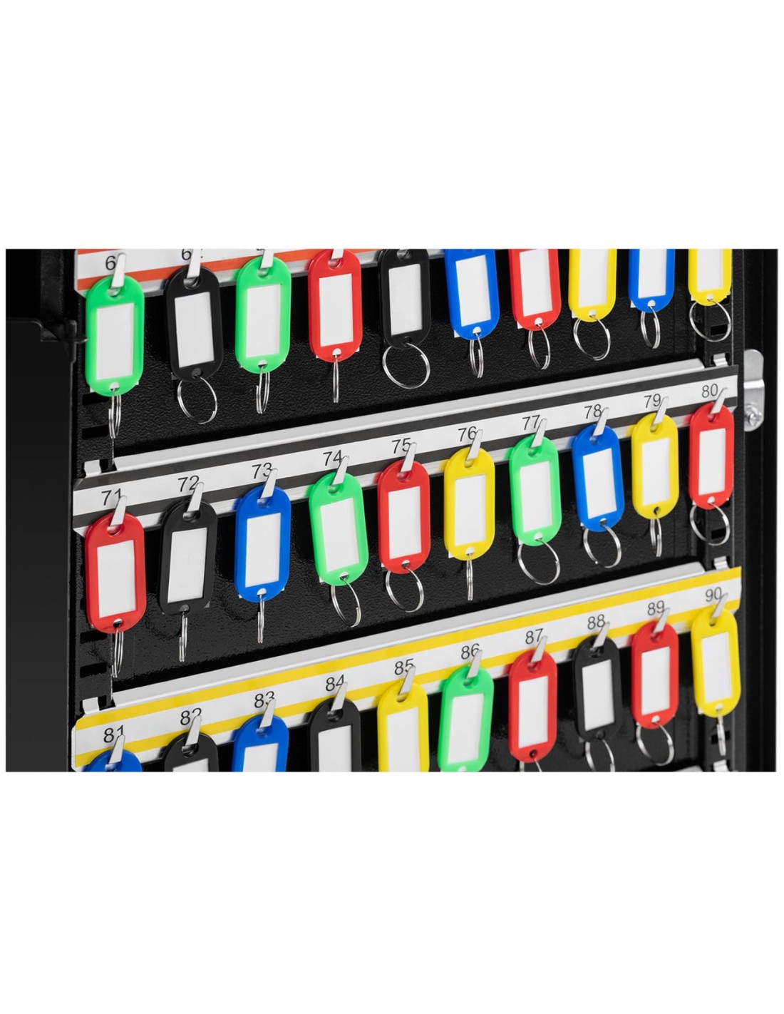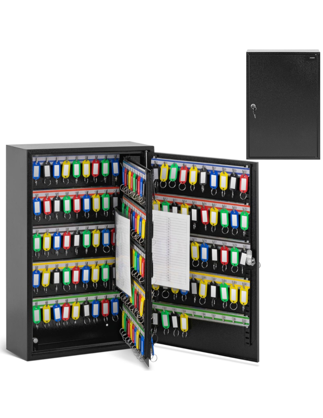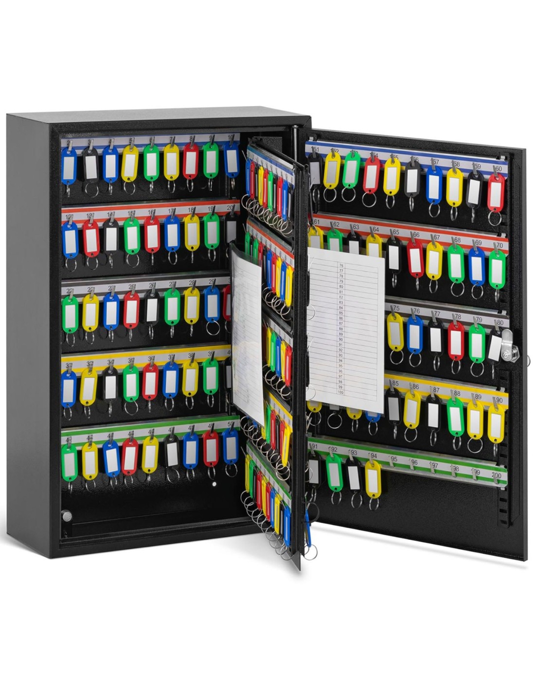 Spintelė rakinama (komplekte 2 vnt.). Dėžutę galima pritvirtinti prie sienos naudojant iš anksto išgręžtas skyles. Spintelės viduje galite laikyti maks. 200 raktų. Spintelėje yra 200 kabliukų, o rinkinyje yra 200 spalvotų pakabų ir popierinių sąrašų turiniui užrašyti. Spintelė pagaminta iš 0,7 mm storio lakšto ir padengta matiniais juodais dažais.