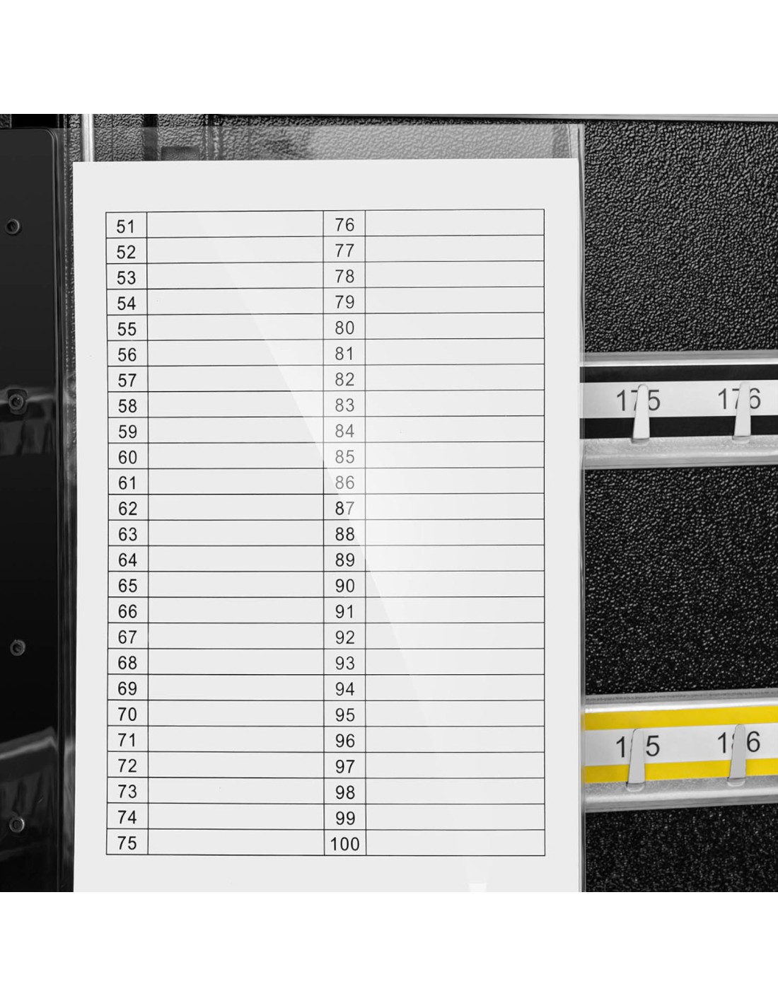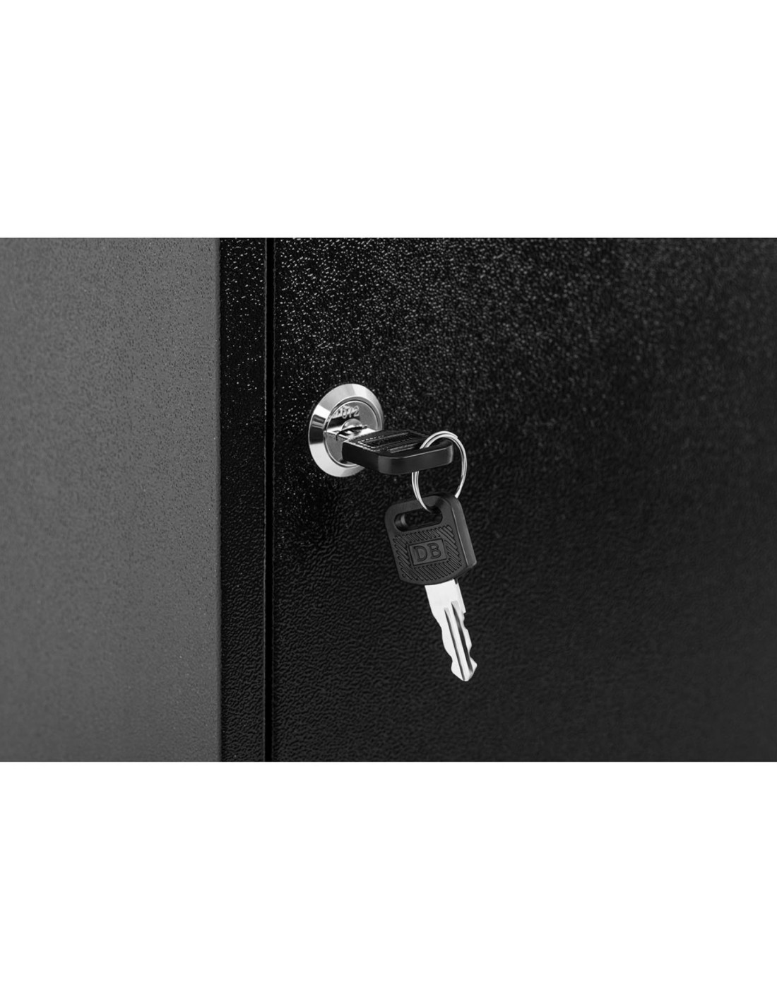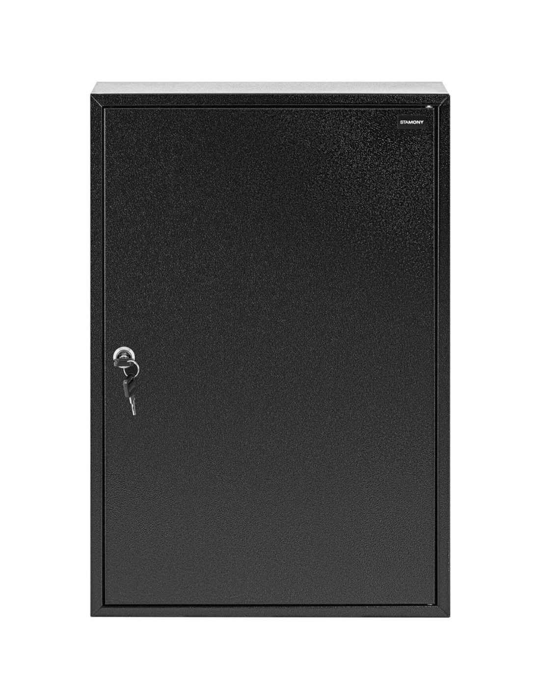 Spintelė rakinama (komplekte 2 vnt.). Dėžutę galima pritvirtinti prie sienos naudojant iš anksto išgręžtas skyles. Spintelės viduje galite laikyti maks. 200 raktų. Spintelėje yra 200 kabliukų, o rinkinyje yra 200 spalvotų pakabų ir popierinių sąrašų turiniui užrašyti. Spintelė pagaminta iš 0,7 mm storio lakšto ir padengta matiniais juodais dažais.