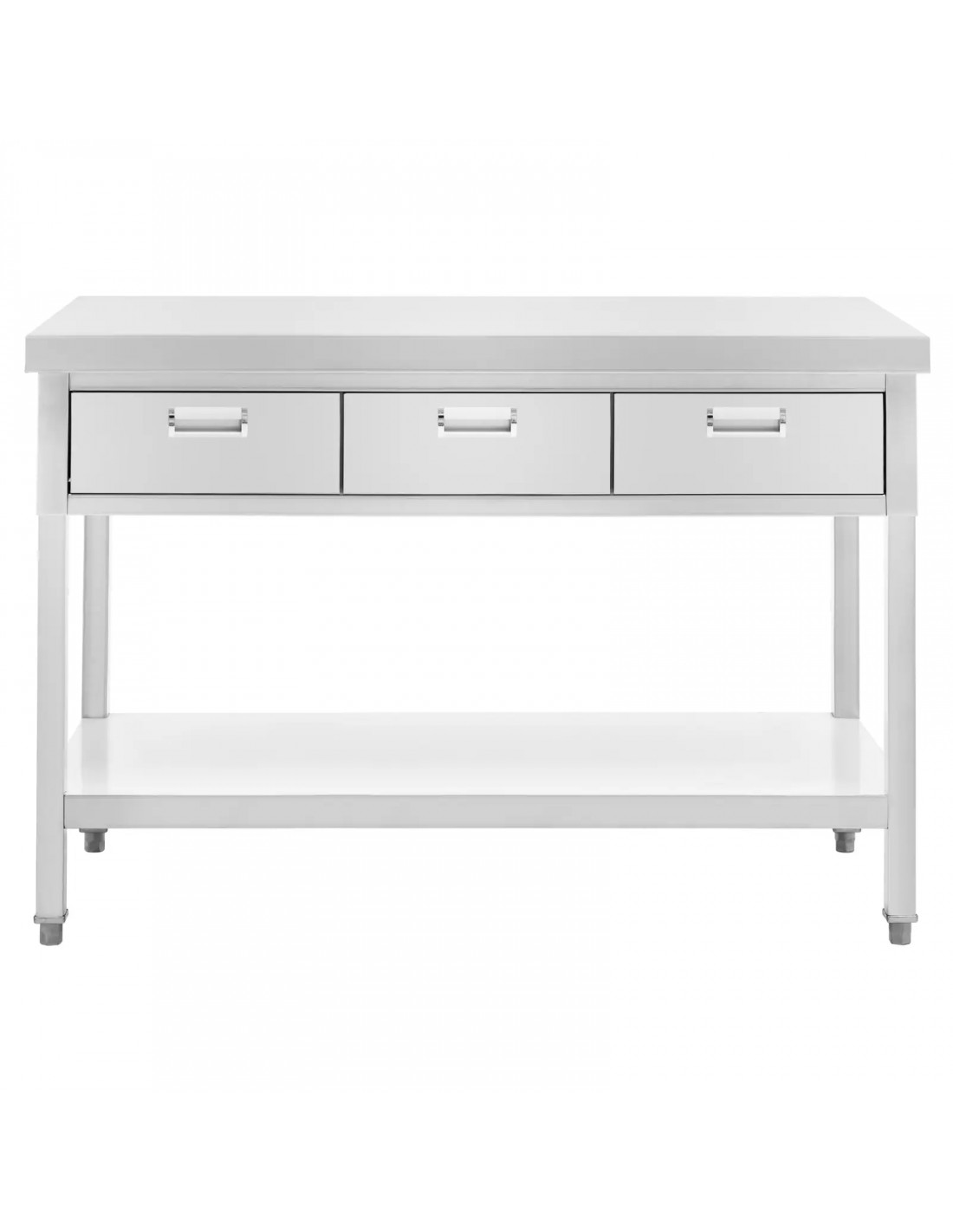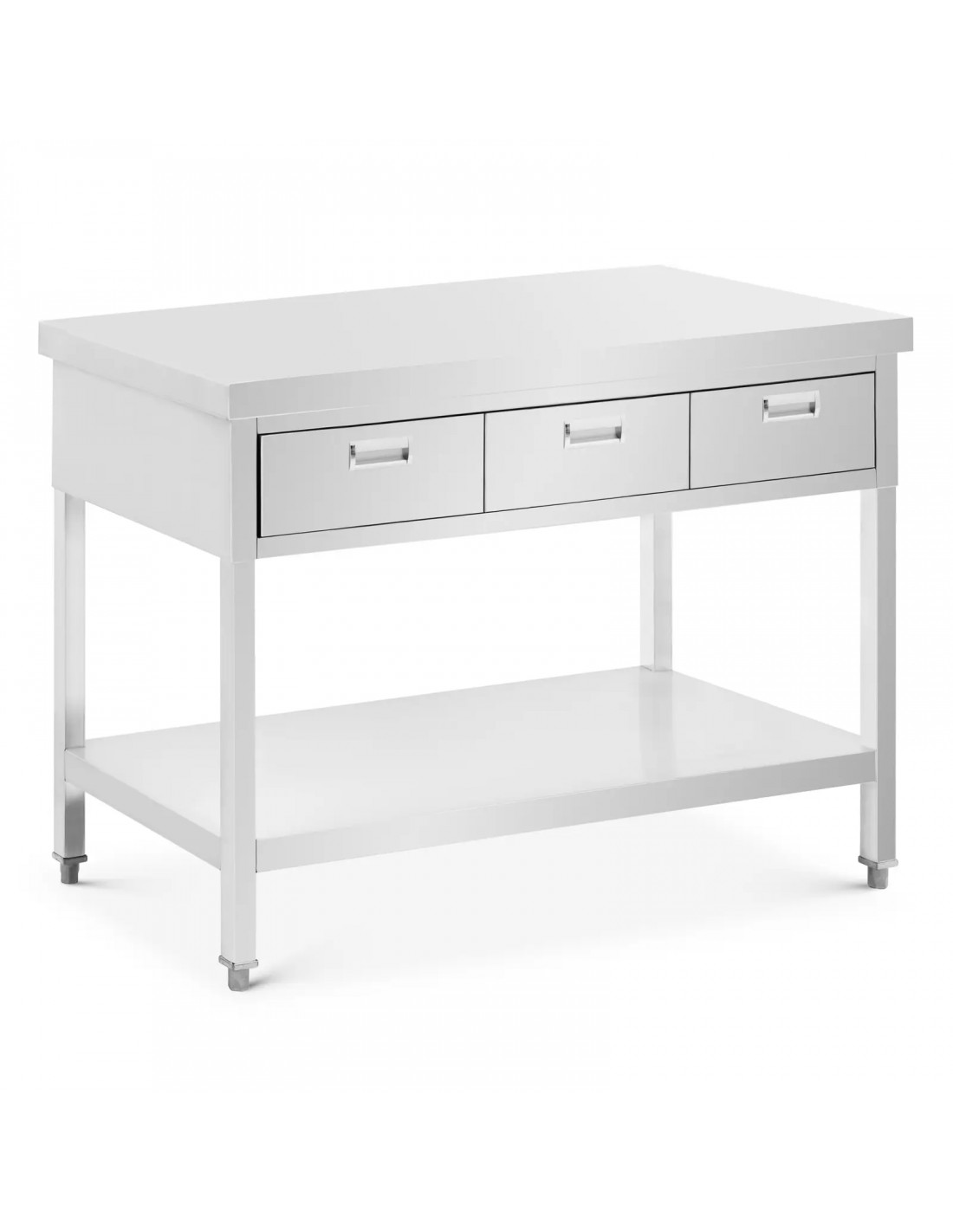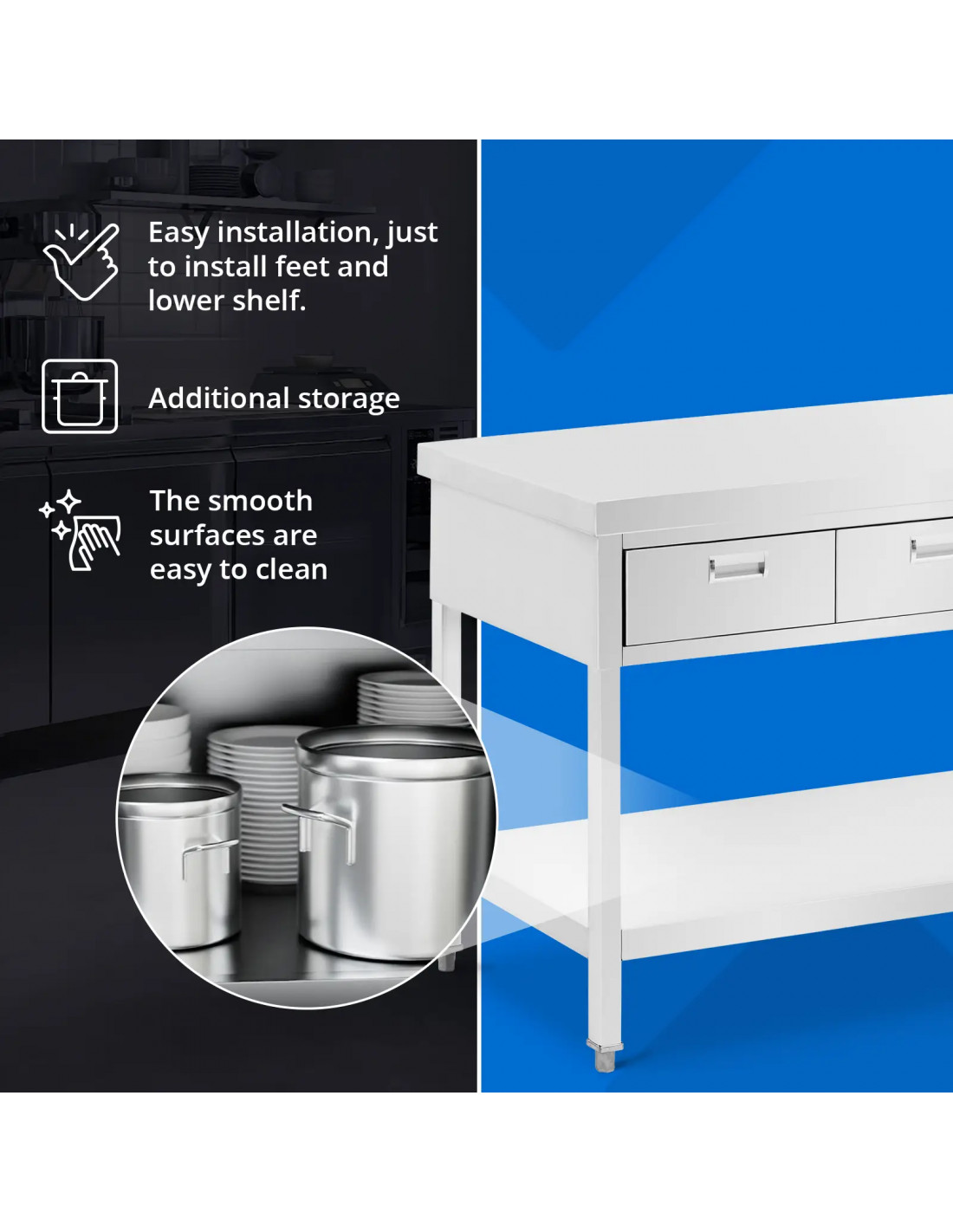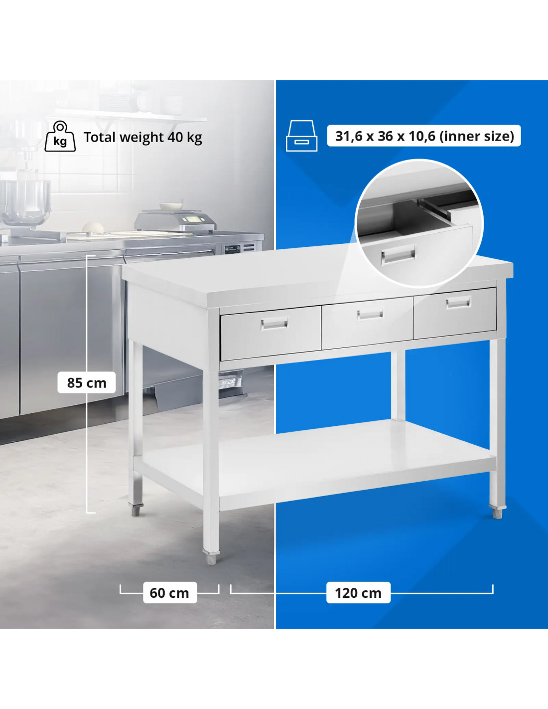 Šis patvarus „Royal Catering“ darbo stalas puikiai tinka bet kokiai maitinimo įmonei. Dėl 1 mm storio medžiagos jis gali lengvai atlaikyti iki 436 kg svorį. 120 x 60 cm dydžio MDF sutvirtintas stalviršis suteikia daug vietos kasdieniam darbui. Trys sklandžiai judantys stalčiai su bėgeliais, kurių kiekvieno matmenys – 31,6 x 36 x 10,6 cm , yra tiesiai po stalviršiu ir apsaugo ingredientus ar mažesnius virtuvės reikmenis nuo dėmių. Didesnius daiktus ir indus galima laikyti 116 x 56 cm dydžio apatinėje lentynoje . Patvari medžiaga užtikrina lengvą priežiūrą, higieną ir ilgalaikį naudojimą, o kojelės, kurių aukštis reguliuojamas iki 2 cm , užtikrina stabilumą. Apatinė lentyna yra 15 cm aukštyje nuo grindų, todėl lengva valyti po stalu. Be to, stalą galima greitai surinkti vos keliais paprastais žingsniais.
