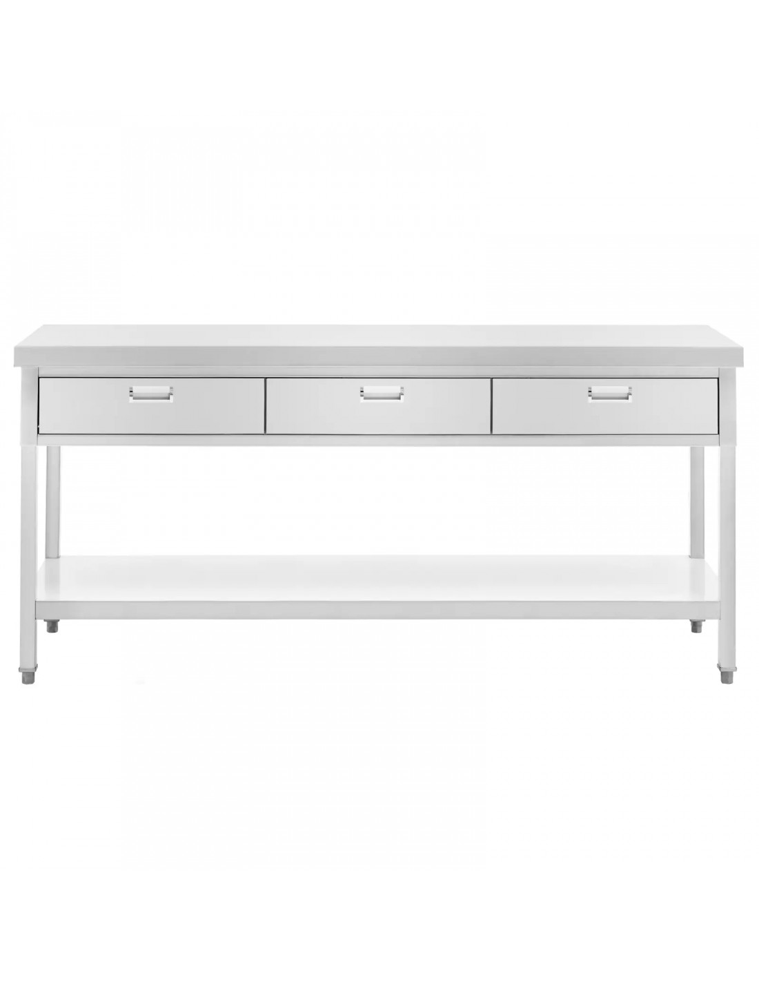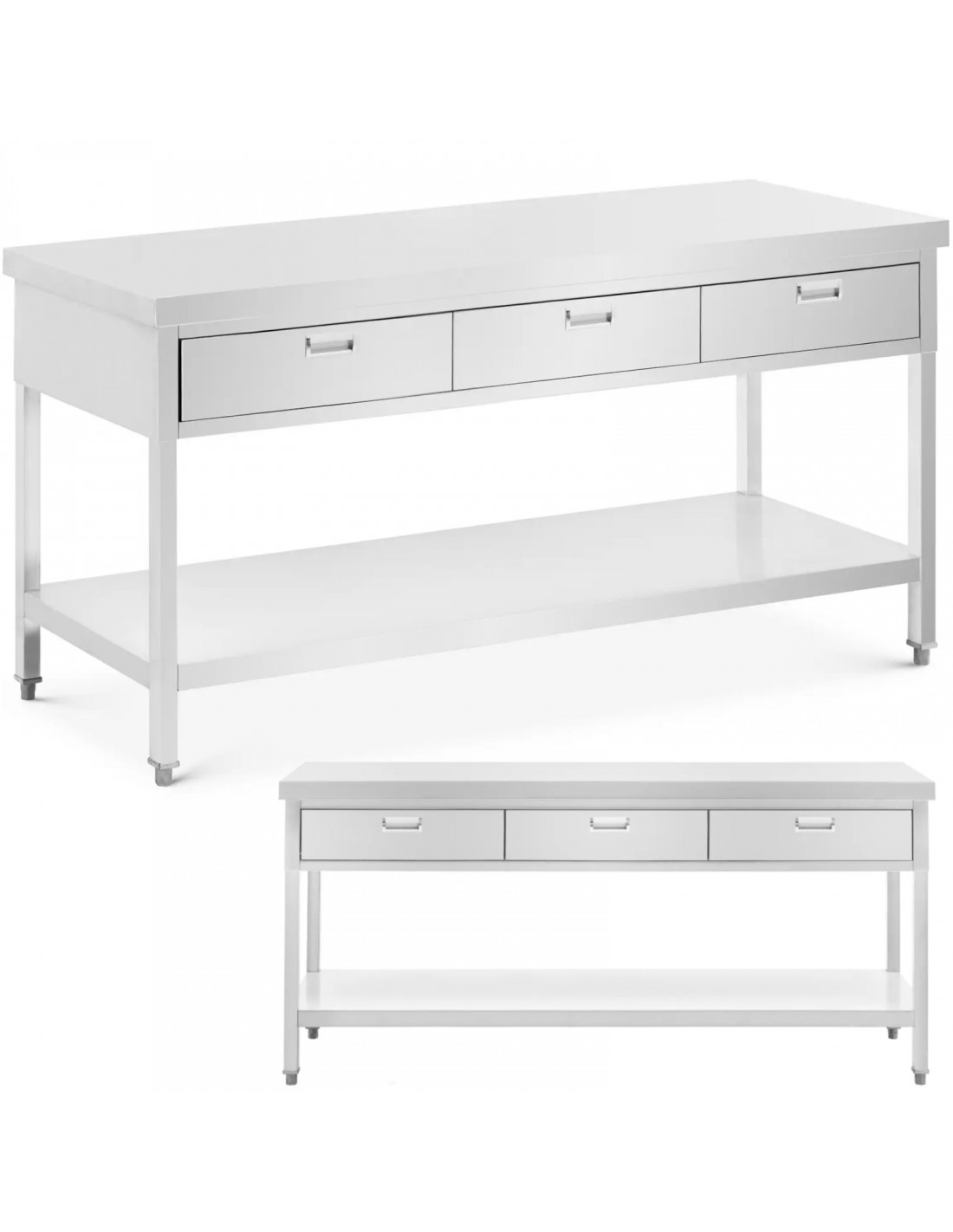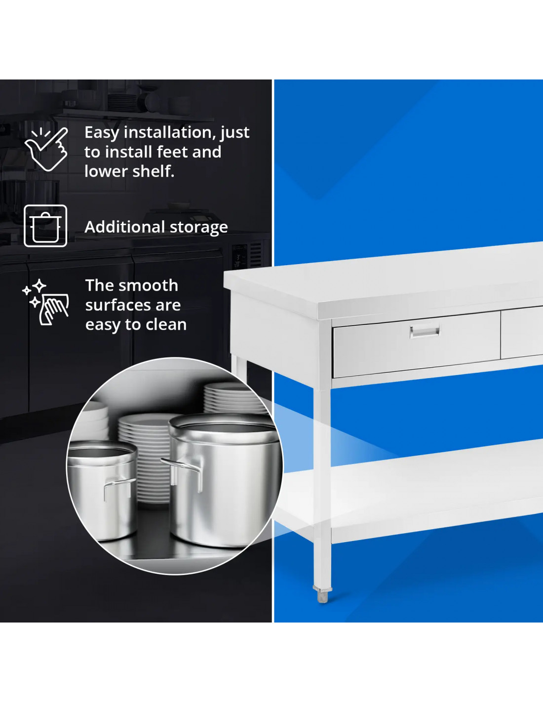 Šis patvarus „Royal Catering“ darbo stalas dėl 1 mm storio medžiagos gali lengvai atlaikyti iki 436 kg svorį . 180 x 60 cm dydžio MDF plokštėmis sutvirtintas stalviršis suteikia daug vietos kasdieniam darbui. Trys sklandžiai judantys stalčiai su bėgeliais, kurių kiekvieno matmenys – 51,6 x 36 x 10,6 cm , yra tiesiai po stalviršiu ir apsaugo ingredientus ar mažesnius virtuvės reikmenis nuo dėmių. Didesnius daiktus ir indus galima laikyti 176 x 56 cm dydžio apatinėje lentynoje . Šis nerūdijančio plieno stalas su stalčiais yra patvarus ir lengvai prižiūrimas sprendimas profesionalioms virtuvėms. Patvari medžiaga užtikrina lengvą priežiūrą, higieną ir ilgalaikį naudojimą, o kojelės, kurių aukštis reguliuojamas iki 2 cm, užtikrina stabilumą. Apatinė lentyna yra 15 cm aukštyje nuo grindų, todėl lengva valyti po stalu. Be to, stalą galima greitai surinkti vos keliais paprastais žingsniais.