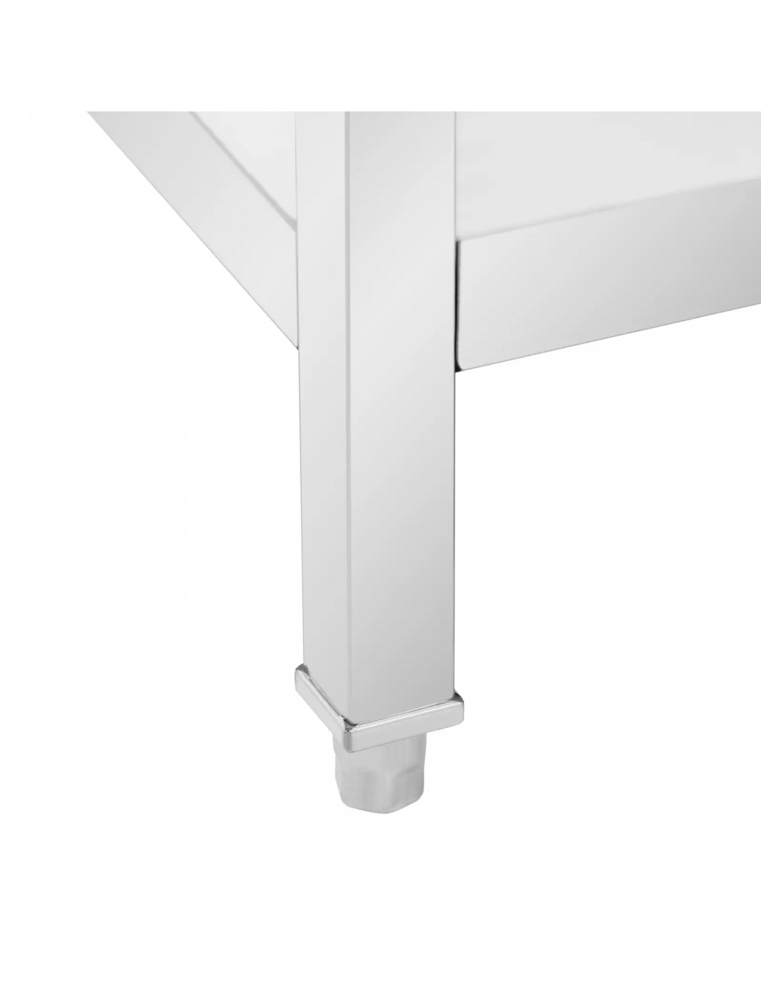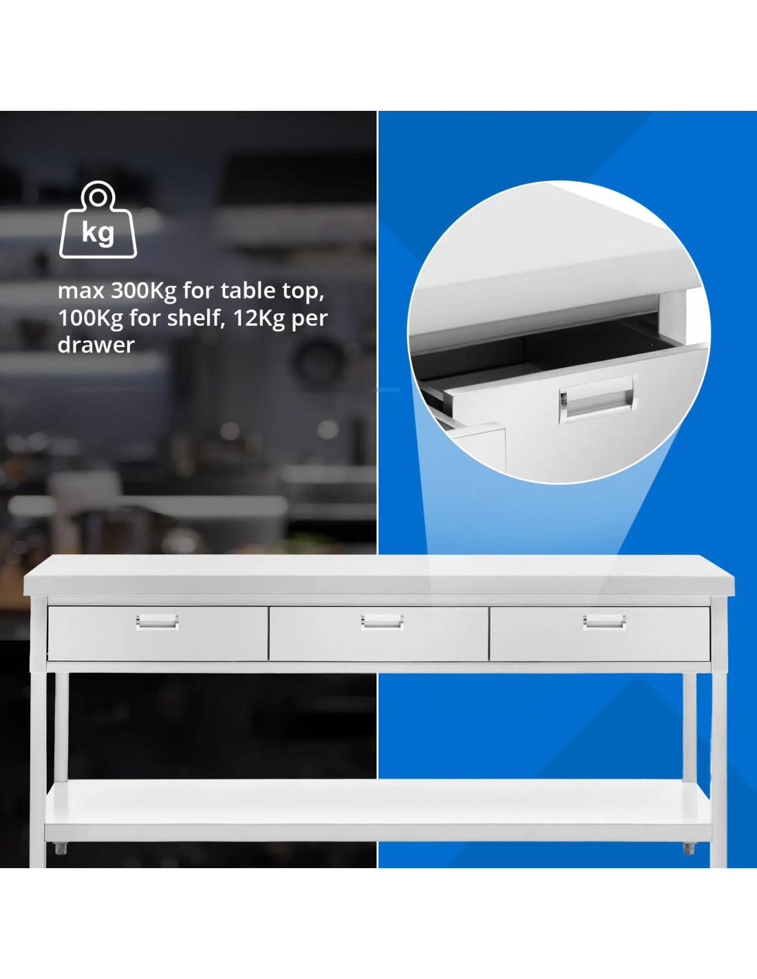 Šis patvarus „Royal Catering“ darbo stalas dėl 1 mm storio medžiagos gali lengvai atlaikyti iki 436 kg svorį . 180 x 60 cm dydžio MDF plokštėmis sutvirtintas stalviršis suteikia daug vietos kasdieniam darbui. Trys sklandžiai judantys stalčiai su bėgeliais, kurių kiekvieno matmenys – 51,6 x 36 x 10,6 cm , yra tiesiai po stalviršiu ir apsaugo ingredientus ar mažesnius virtuvės reikmenis nuo dėmių. Didesnius daiktus ir indus galima laikyti 176 x 56 cm dydžio apatinėje lentynoje . Šis nerūdijančio plieno stalas su stalčiais yra patvarus ir lengvai prižiūrimas sprendimas profesionalioms virtuvėms. Patvari medžiaga užtikrina lengvą priežiūrą, higieną ir ilgalaikį naudojimą, o kojelės, kurių aukštis reguliuojamas iki 2 cm, užtikrina stabilumą. Apatinė lentyna yra 15 cm aukštyje nuo grindų, todėl lengva valyti po stalu. Be to, stalą galima greitai surinkti vos keliais paprastais žingsniais.