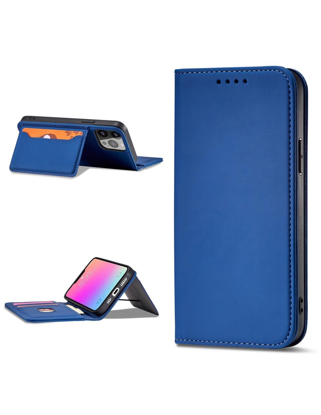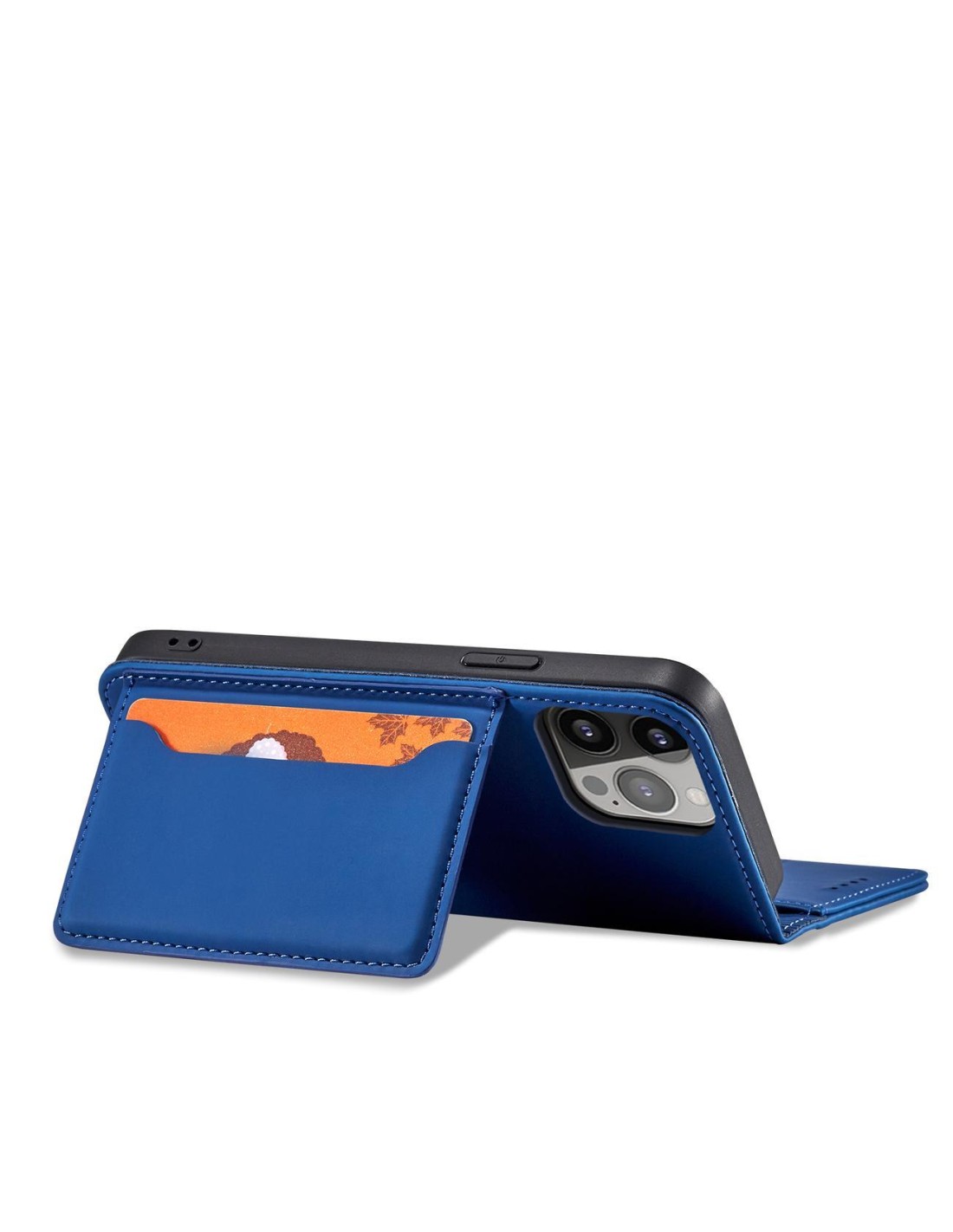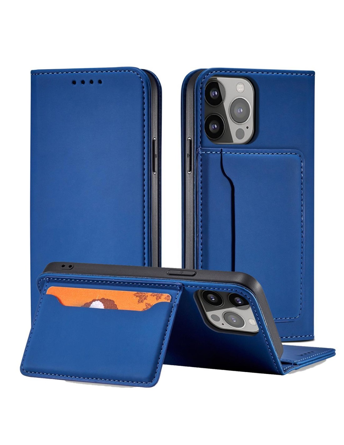 Serija iPhone 14 Pro magnetinių kortelių dėklas, atverčiamas dangtelis su piniginės funkcija ir stovas, mėlynas