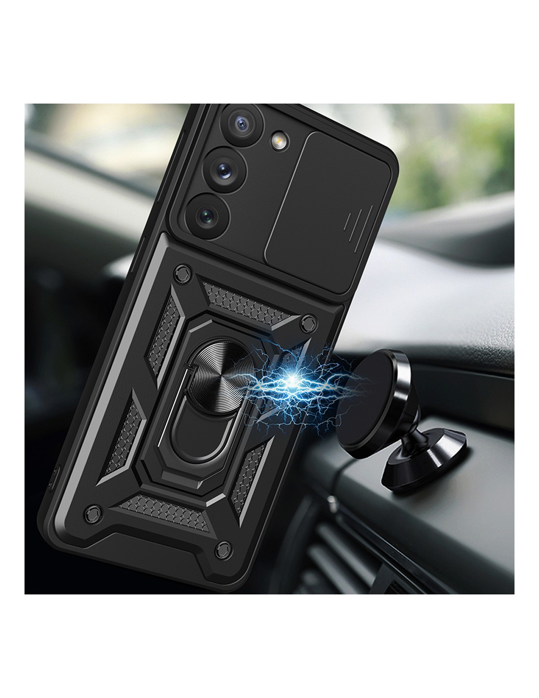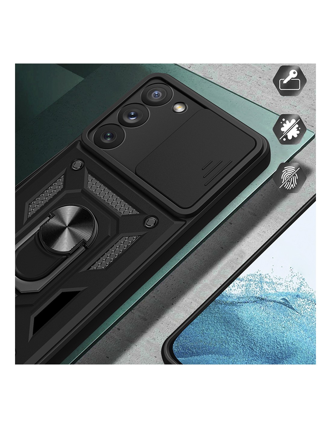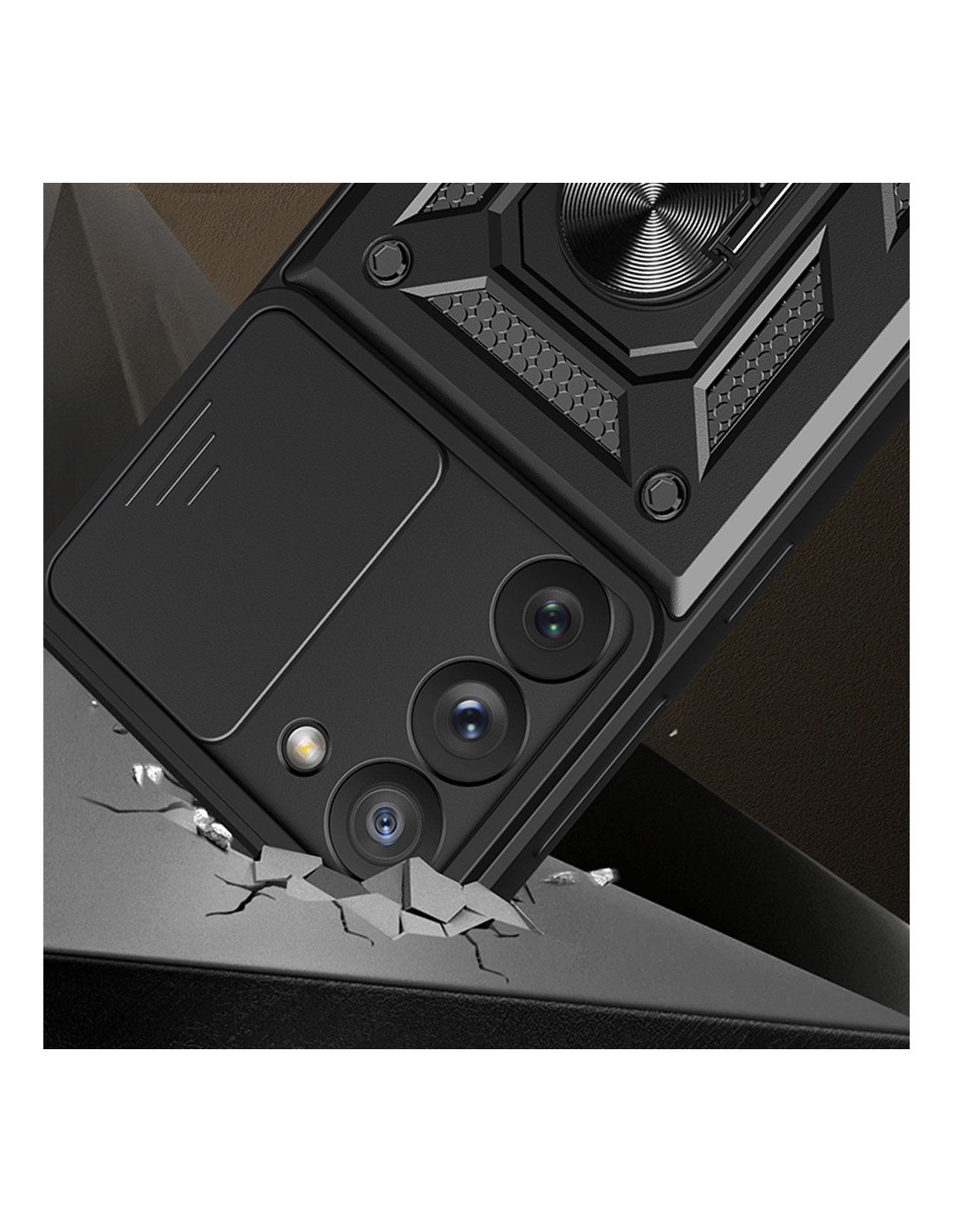 Šarvuotas dėklas iš Hybrid Armor Camshield serijos > jis pagamintas iš termoplastiko ir patvarios medžiagos, kuri savo išvaizda imituoja plieną. Dangtelis pritaikytas prieSamsung Galaxy A54 5Gir puikiai apsaugo telefoną nuo pažeidimų, kuriuos sukelia kritimas ar subraižymas (pavyzdžiui, kišenėje nešiojamų raktų). Dėklas turi stumdomą dangtelį galinei kamerai. Jo dėka fotoaparato stiklas yra apsaugotas nuo įbrėžimų. Taip pat yra papildomas pranašumas žmonėms, kurie vertina savo duomenų privatumą ir saugumą. Uždengta kamera neleidžia pasiekti vaizdo įrašymo, jei kas nors gauna nuotolinę prieigą prie telefono ir įjungia vaizdą iš pagrindinės kameros. Paaukštinti kraštai aplink ekraną apsaugo jį nuo įbrėžimų, kai jis yra pastatytas ant lygaus paviršiaus. Jame yra įmontuotas metalinis žiedas, kuris leidžia patogiai naudotis telefonu viena ranka, taip pat tarnauja kaip stovas. Įmontuota metalinė plokštė leidžia pritvirtinti prie magnetinių automobilio laikiklių. Jame yra jautrūs mygtukai ir prievadų išpjovos. Puikiai tinka žmonėms, kurie vertina stilių, kokybę ir nori rūpintis savo įrenginiu.