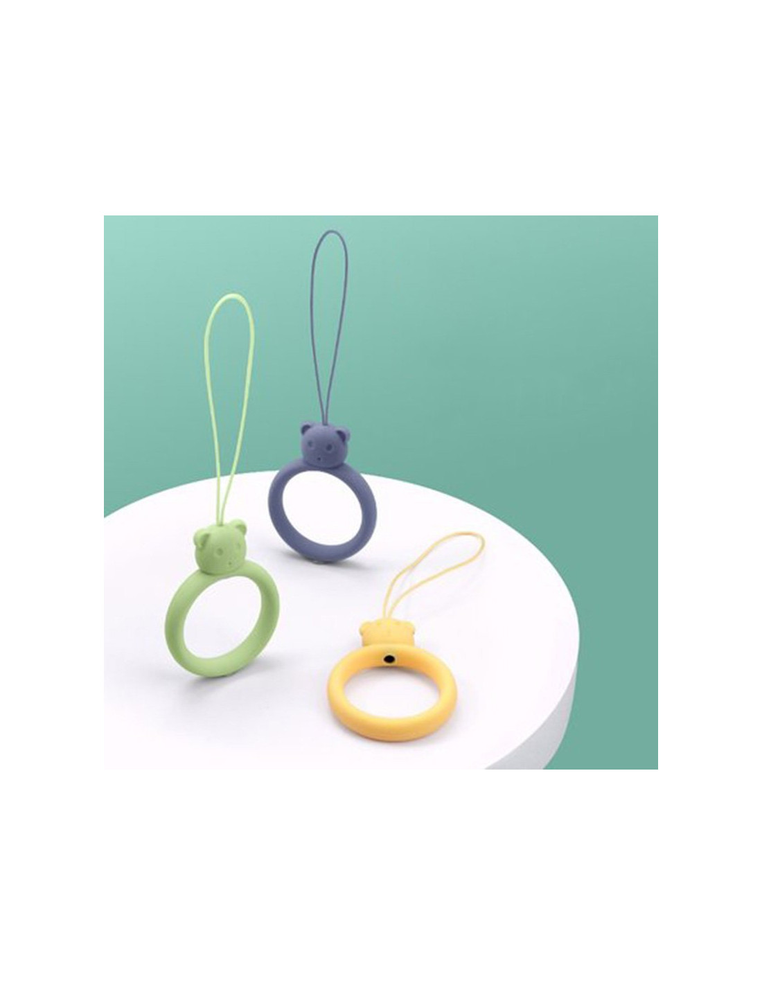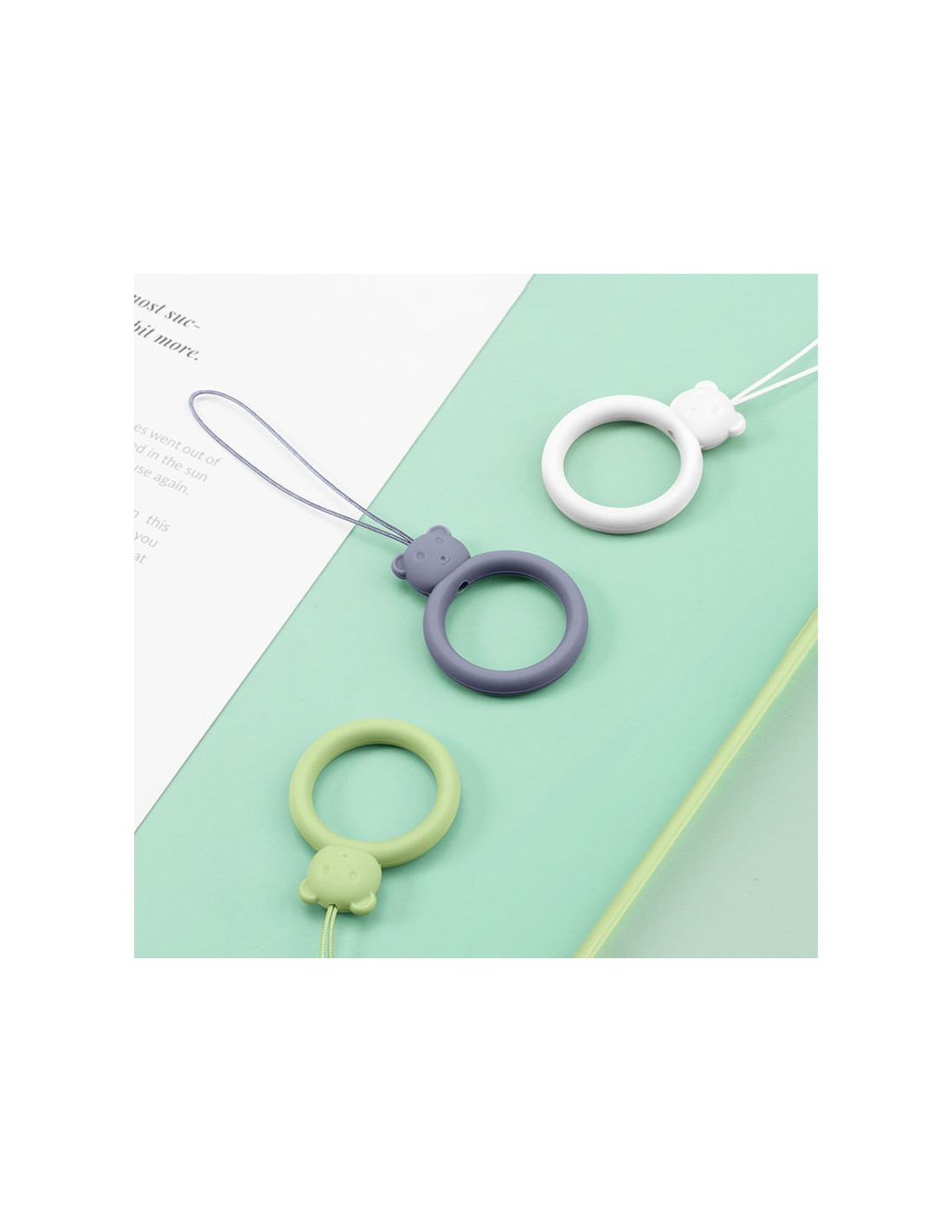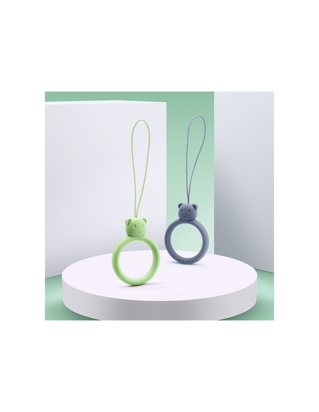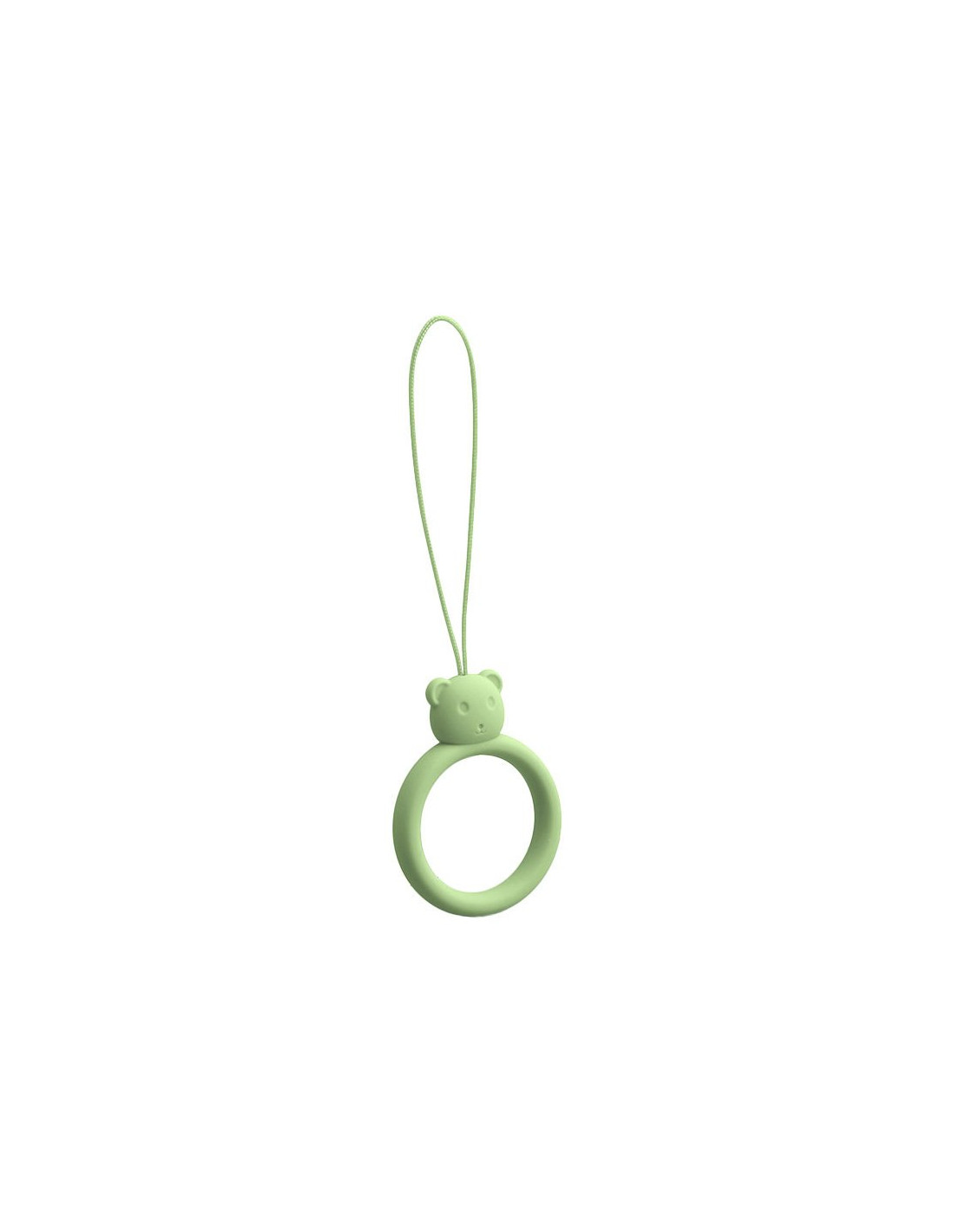 Silikoninis telefono dirželis, meškiuko pakabukas, žiedas ant piršto, šviesiai žalias