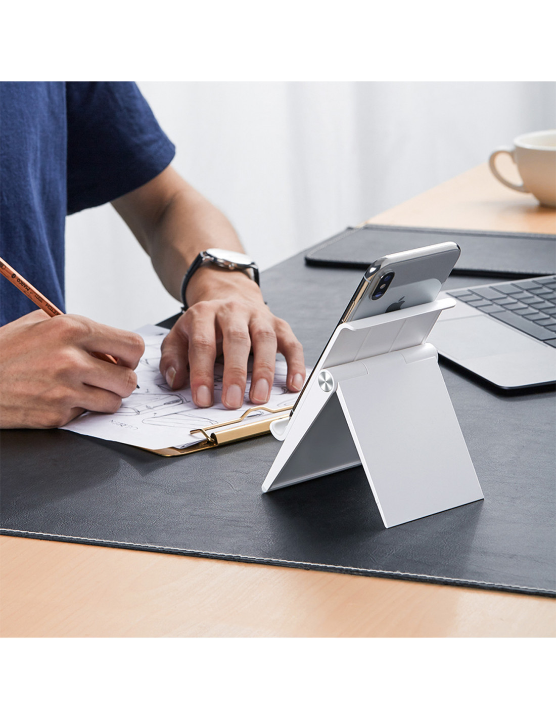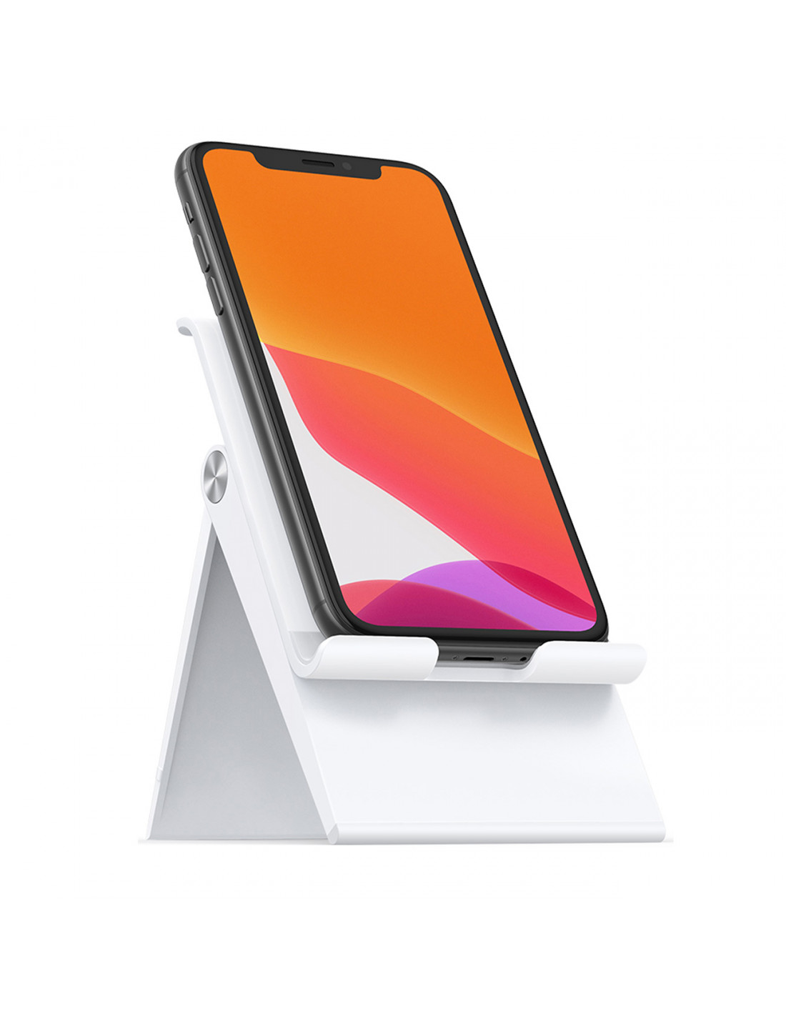 Sulankstomas telefono ir planšetinio kompiuterio stovas su reguliuojamu aukščiu, baltas