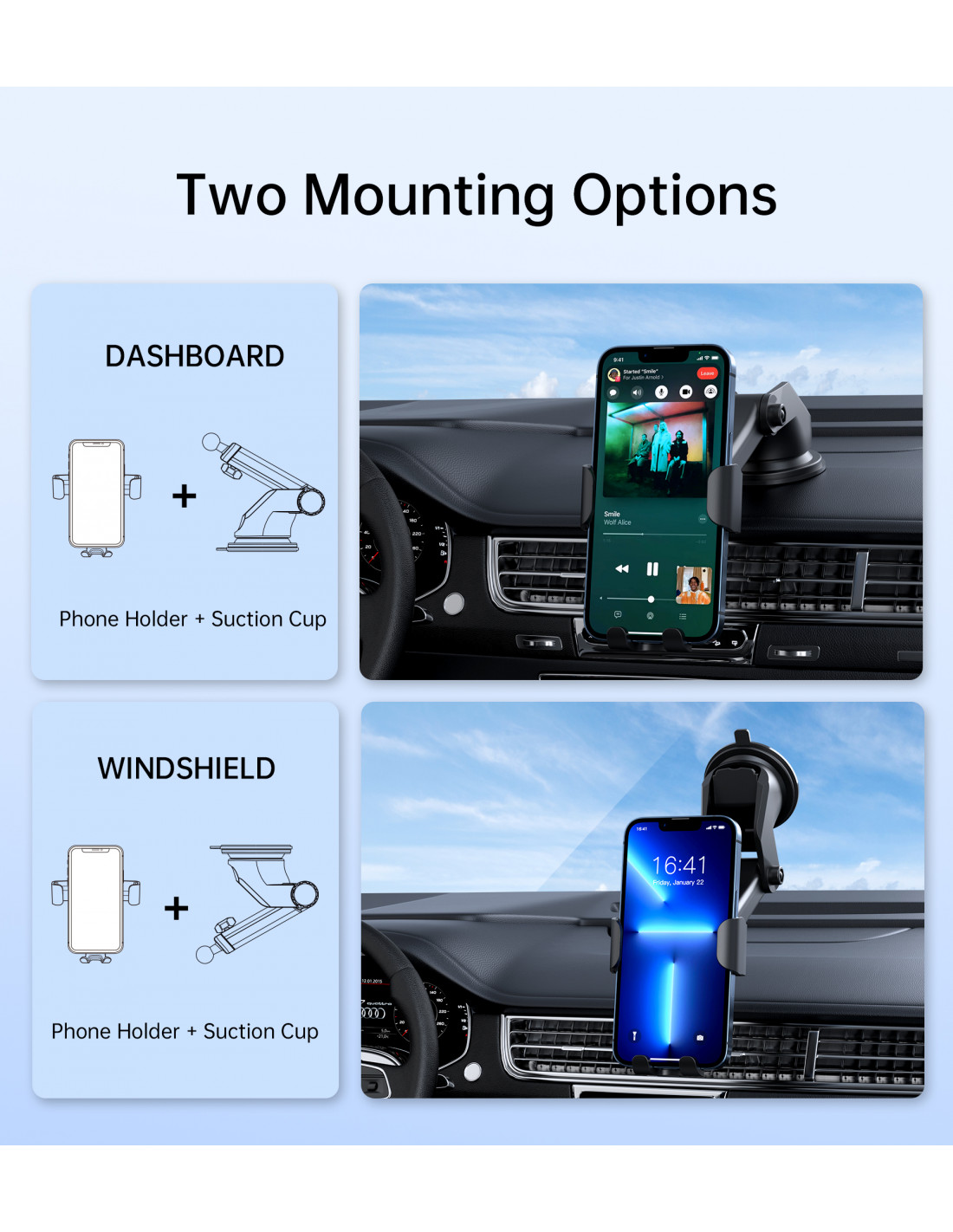 - - Siūlomos dvi tvirtinimo galimybės: ant priekinio stiklo arba ant prietaisų skydelio,
