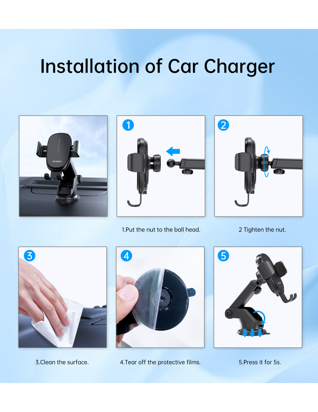 „Choetech T203-F“ automobilinis laikiklis sujungia inovacijas ir funkcionalumą, užtikrindamas maksimalų komfortą ir saugumą vairuojant. Belaidis įkrovimas iki 15 W užtikrina, kad jūsų telefonas visada būtų įkrautas ir paruoštas naudoti. Automatinis telefono stabilizavimas nasruose, tvirtinimas prie priekinio stiklo arba prietaisų skydelio ir lengvas žiūrėjimo kampo reguliavimas teleskopinės svirties ir rutulinės galvutės dėka yra tik keletas šio laikiklio savybių. Tikslas: padaryti kiekvieną kelionę lengvesnę ir patogesnę.