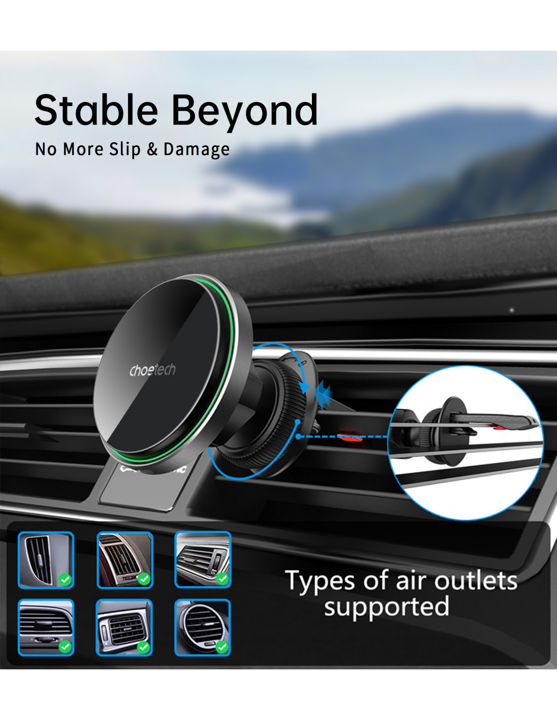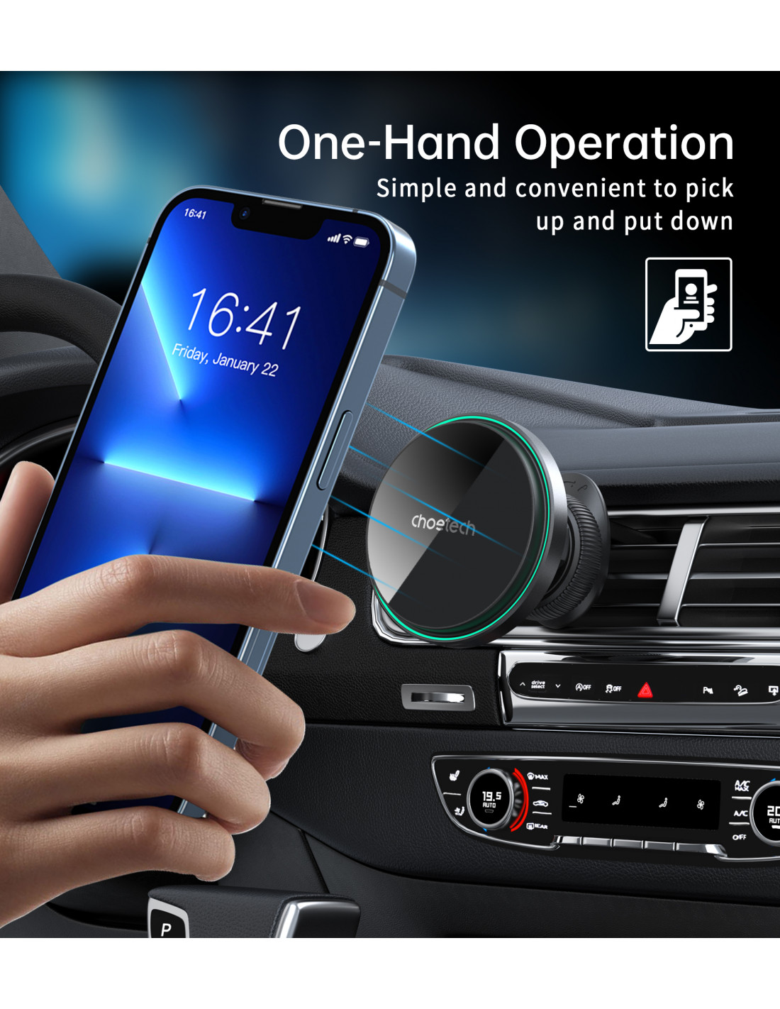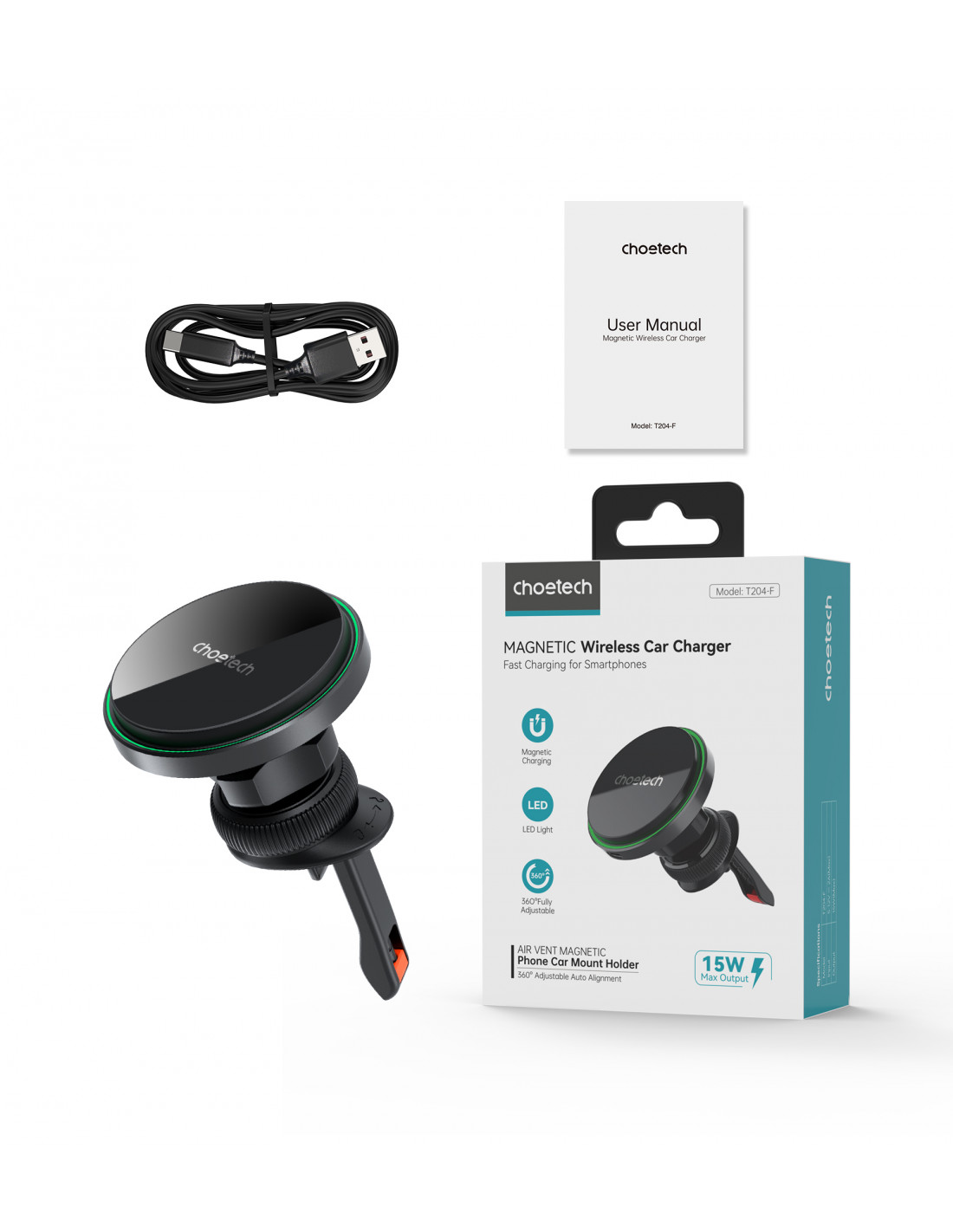 „Choetech T205-F“ magnetinis laikiklis yra elegantiškas ir funkcionalus įrenginys, kuris ne tik užtikrina greitą 15 W įkrovimą , bet ir leidžia lengvai valdyti telefoną viena ranka. Dėl 360 laipsnių pasukimo telefoną galima pastatyti tiek horizontaliai, tiek vertikaliai, todėl patogu naudotis programėlėmis ar naršyti. Maksimalus stabilumas užtikrina sklandų telefono naudojimą net važiuojant per nelygumus. Elegantiška juoda apdaila su žaliu aplinkos apšvietimu suteikia stiliaus bet kokiam automobilio salonui ir užtikrina vizualinį komfortą naktį.