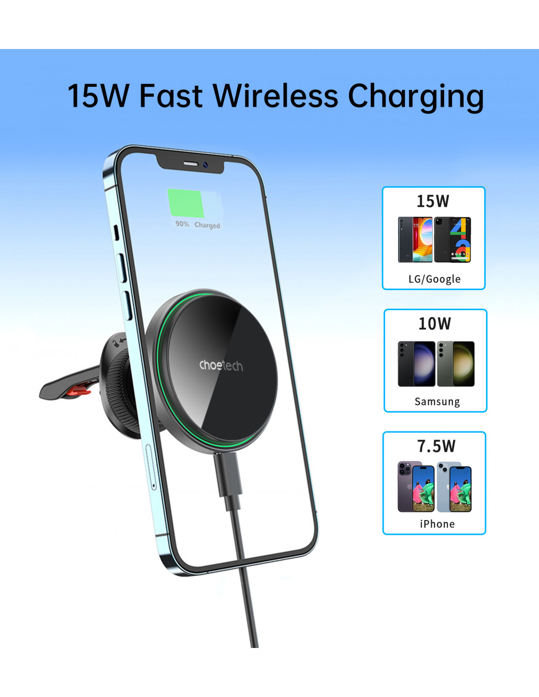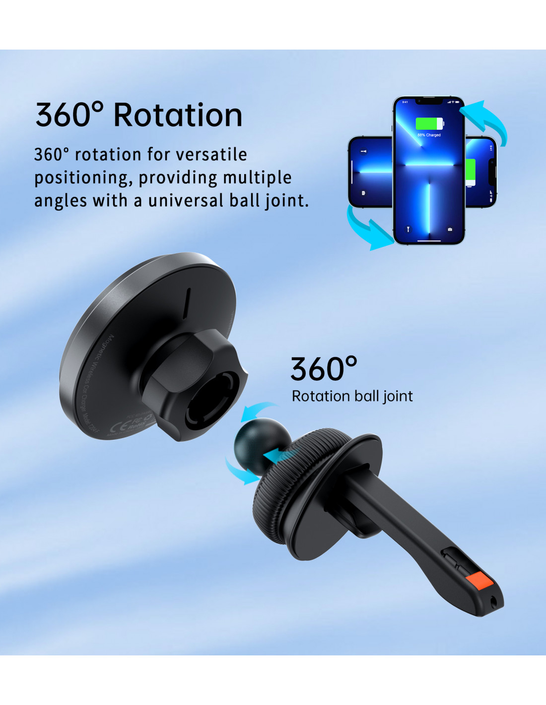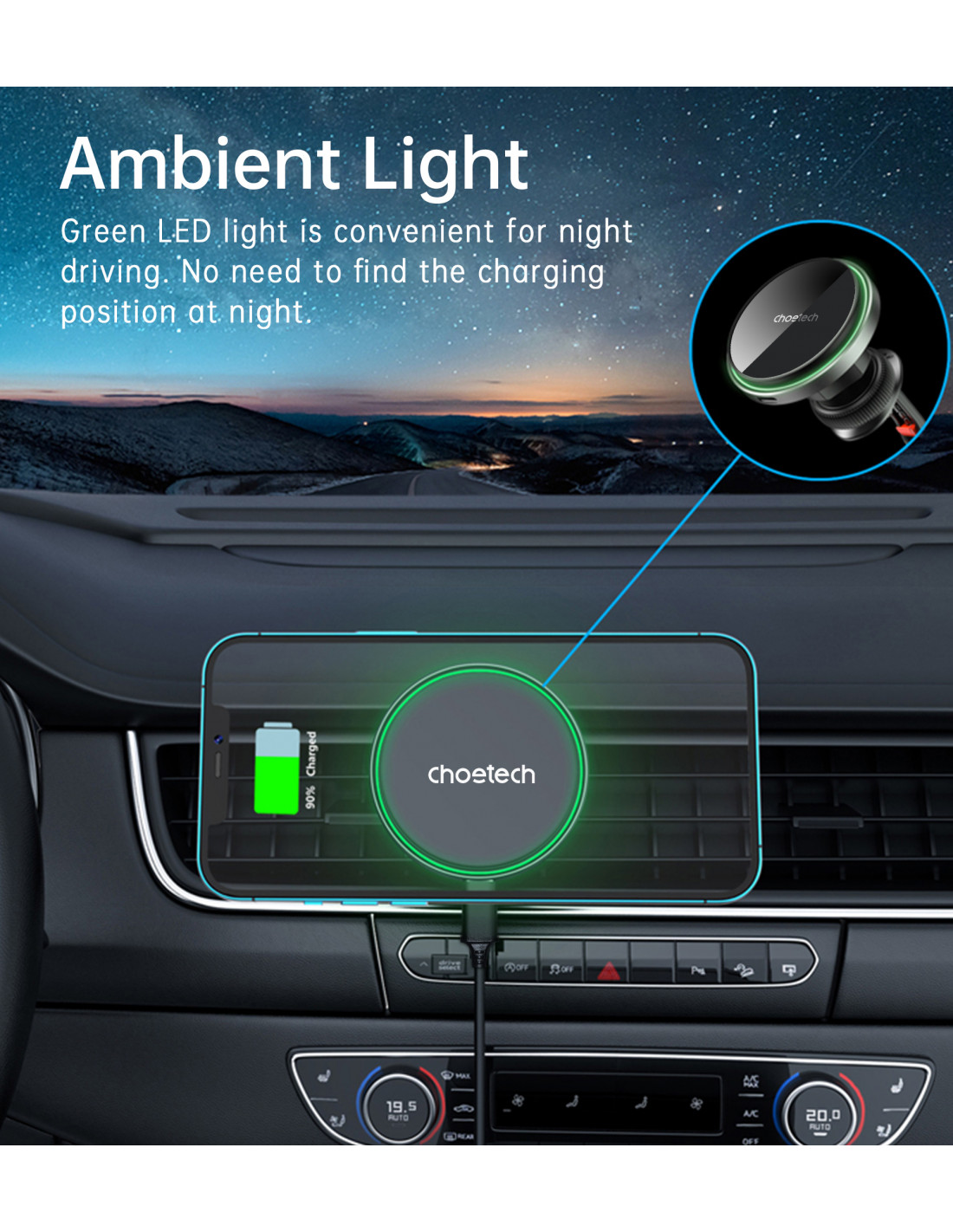 „Choetech T205-F“ magnetinis laikiklis yra elegantiškas ir funkcionalus įrenginys, kuris ne tik užtikrina greitą 15 W įkrovimą , bet ir leidžia lengvai valdyti telefoną viena ranka. Dėl 360 laipsnių pasukimo telefoną galima pastatyti tiek horizontaliai, tiek vertikaliai, todėl patogu naudotis programėlėmis ar naršyti. Maksimalus stabilumas užtikrina sklandų telefono naudojimą net važiuojant per nelygumus. Elegantiška juoda apdaila su žaliu aplinkos apšvietimu suteikia stiliaus bet kokiam automobilio salonui ir užtikrina vizualinį komfortą naktį.