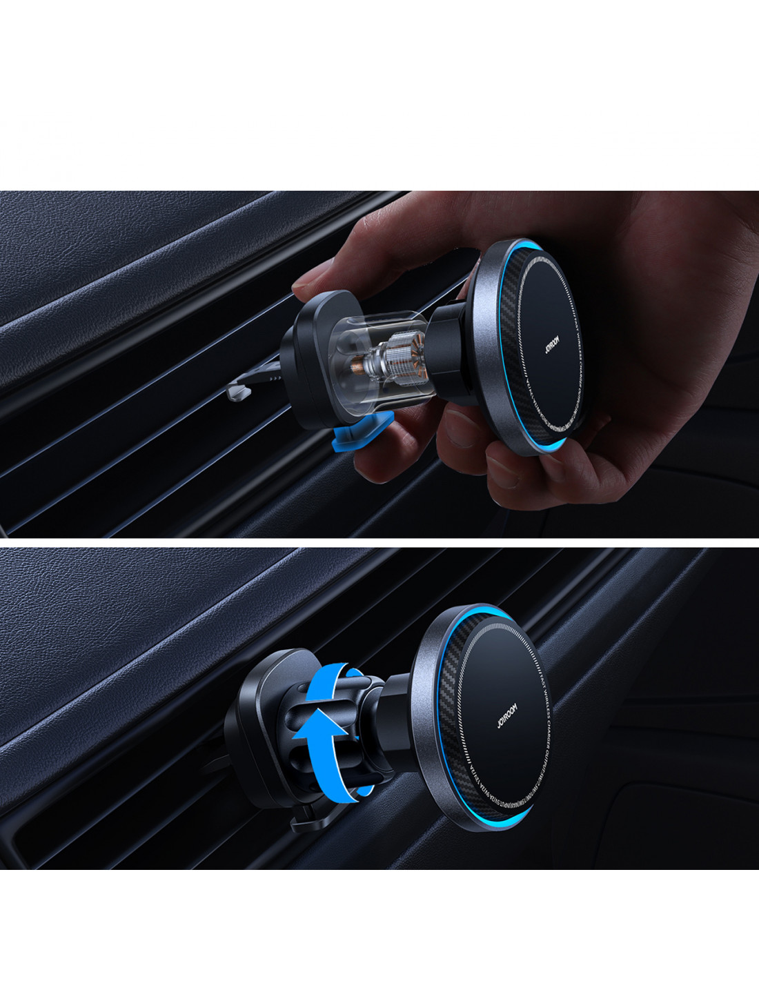 „Joyroom“ automobilinis telefono laikiklis su indukciniu įkrovikliu (suderinamas su „MagSafe“ ), skirtas oro ventiliacijos angoms – juodas (JR-ZS387) – puikus sprendimas tiems, kurie vertina patogumą, saugumą ir modernias technologijas. Dėl unikalaus funkcionalumo šis laikiklis leidžia greitai įkrauti telefoną iki 15 W galia , akimirksniu tiekiant energiją jūsų įrenginiui. Stiprūs neodimio magnetai užtikrina saugų laikymą net ir sudėtingomis kelio sąlygomis, o elegantiškas dizainas ir intuityvus valdymas paverčia laikiklio naudojimą tikru malonumu. Integruotas ventiliatorius užtikrina efektyvų šilumos išsklaidymą, apsaugodamas įrenginį nuo perkaitimo įkrovimo metu. Dėl 360° kampu besisukančio laikiklio ir valdymo viena ranka, telefono įdėjimas yra greitas ir paprastas. Tai puikus bet kurio automobilio papildymas, užtikrinantis komfortą ir saugumą vairuojant. Dabar keliaudami galite lengvai valdyti navigaciją ir bendravimą. Integruotas ventiliatorius užtikrina įkraunamo įrenginio temperatūros valdymą.