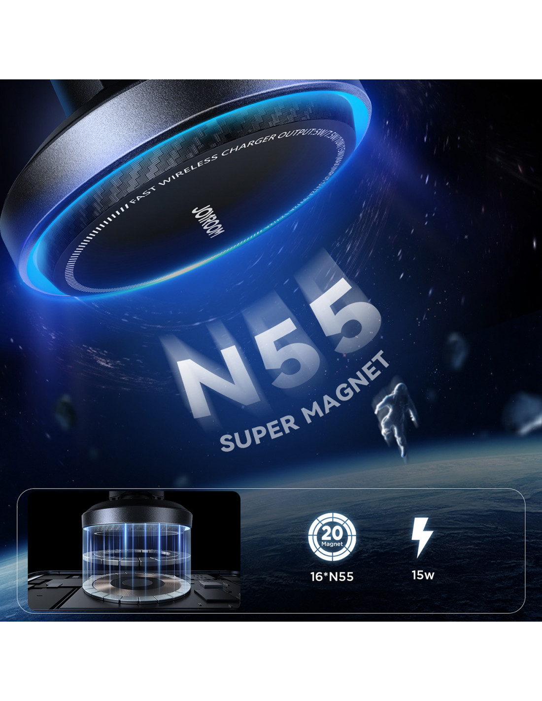 „Joyroom JR-ZS387“ turi 15 W indukcinį įkroviklį, kuris užtikrina greičiausią įmanomą suderinamų įrenginių įkrovimą. Tai užtikrina, kad jūsų telefonas bus visiškai įkrautas net ir trumpų kelionių metu. Be to, įmontuotas ventiliatorius efektyviai išsklaido šilumą, neleisdamas įkrovikliui ir telefonui perkaisti, užtikrindamas saugų ir stabilų įkrovimą.