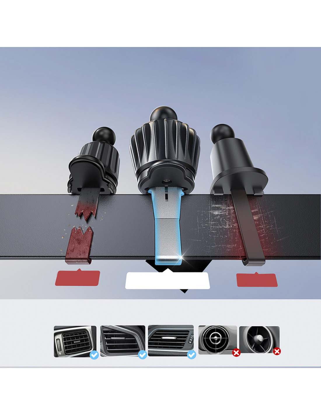 - - Tvirtai pritvirtinamas prie oro išleidimo angos . Ilgas kabliukas padidina laikiklio stabilumą.