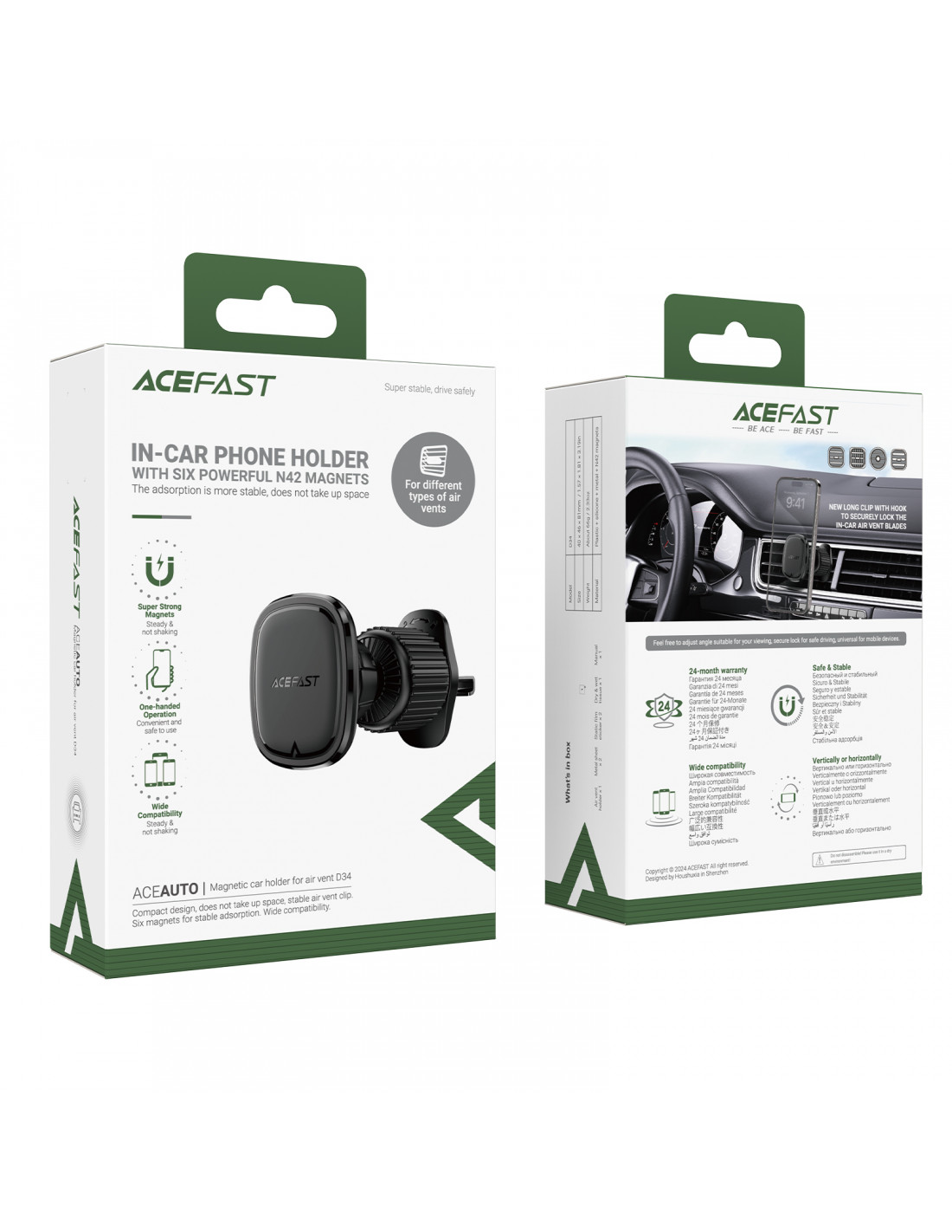 - - Kompaktiškas ir elegantiškas dizainas – „Acefast D34“ laikiklis pasižymi kompaktišku dydžiu ir elegantišku dizainu, kuris sklandžiai dera prie bet kurio automobilio interjero. Aukštos kokybės apdaila ir subtili juoda spalva suteikia jam klasės akcentą.