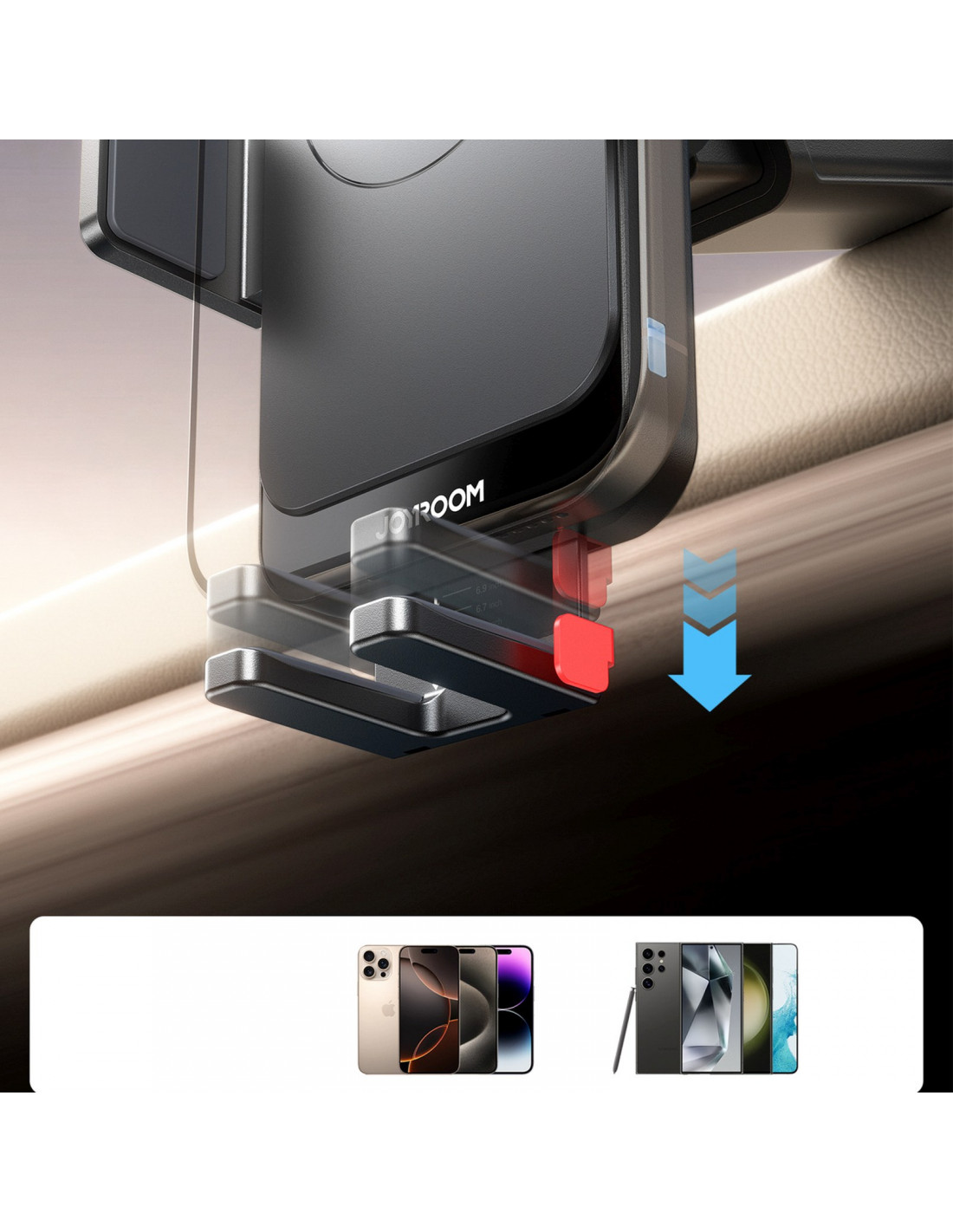 - - Valdymas viena ranka: greitai ir patogiai įdėkite arba išimkite išmanųjį telefoną neatitraukiant dėmesio nuo kelio.