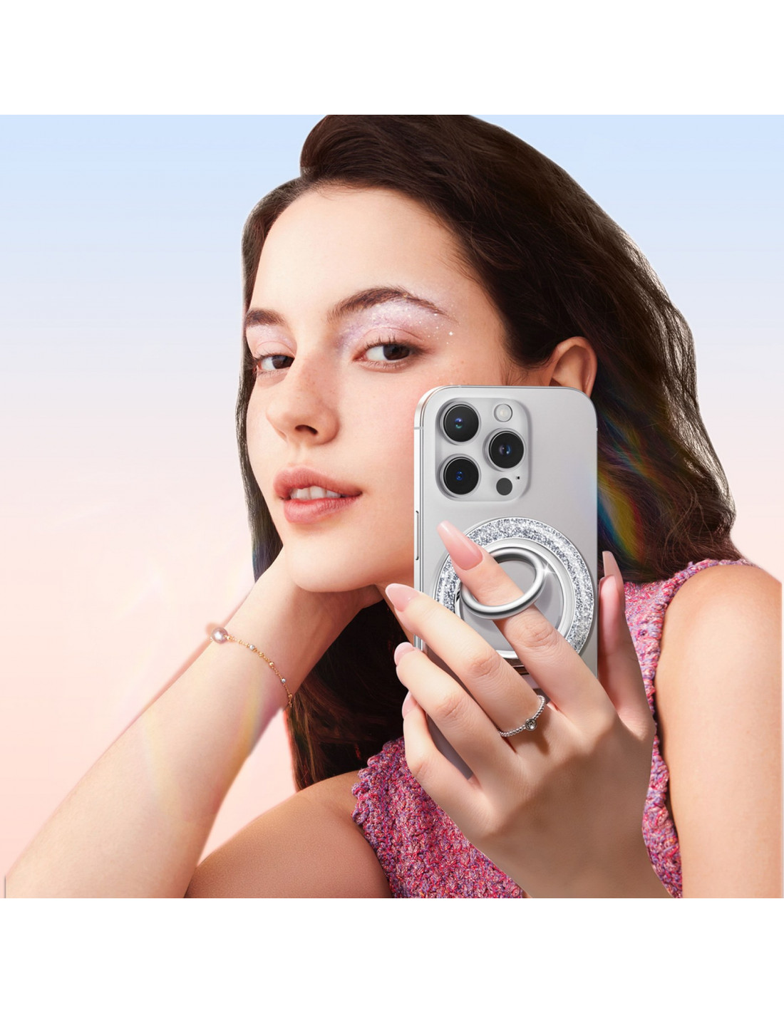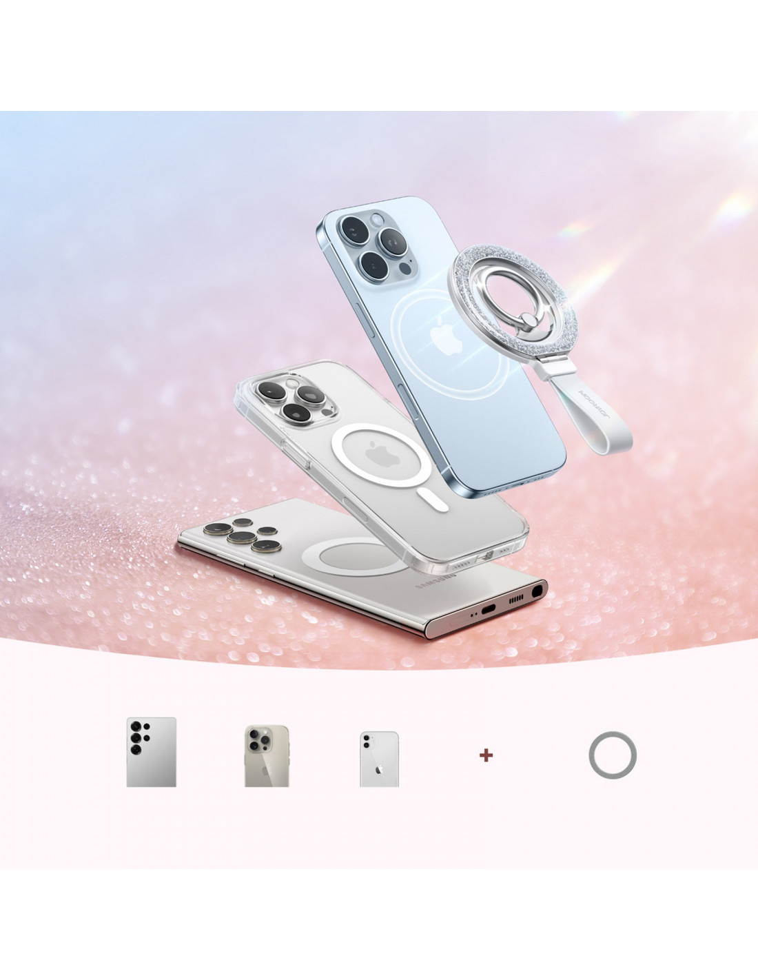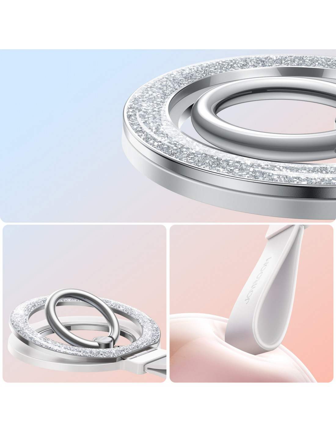 yra stilingas ir funkcionalus aksesuaras, kuriame derinamas madingas dizainas ir praktiški sprendimai. Blizgantis, blizgantis kraštas suteikia išmaniajam telefonui elegantišką išvaizdą ir užtikrina patogų bei saugų laikymą. Dėl stiprių N56 magnetų laikiklis akimirksniu prisitvirtina prie „MagSafe“ palaikančių telefonų ir magnetinių dėklų , o pridedamas metalinis žiedas leidžia naudoti ir su kitais modeliais. 360 laipsnių sukimosi žiedas ir 120 laipsnių sulankstomas stovas leidžia dar patogiau naudotis telefonu – tiek vertikaliai, tiek horizontaliai. Šis praktiškas aksesuaras supaprastina kasdienį telefono naudojimą ir suteikia unikalumo.