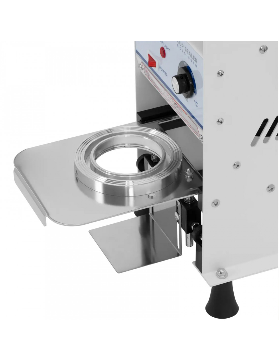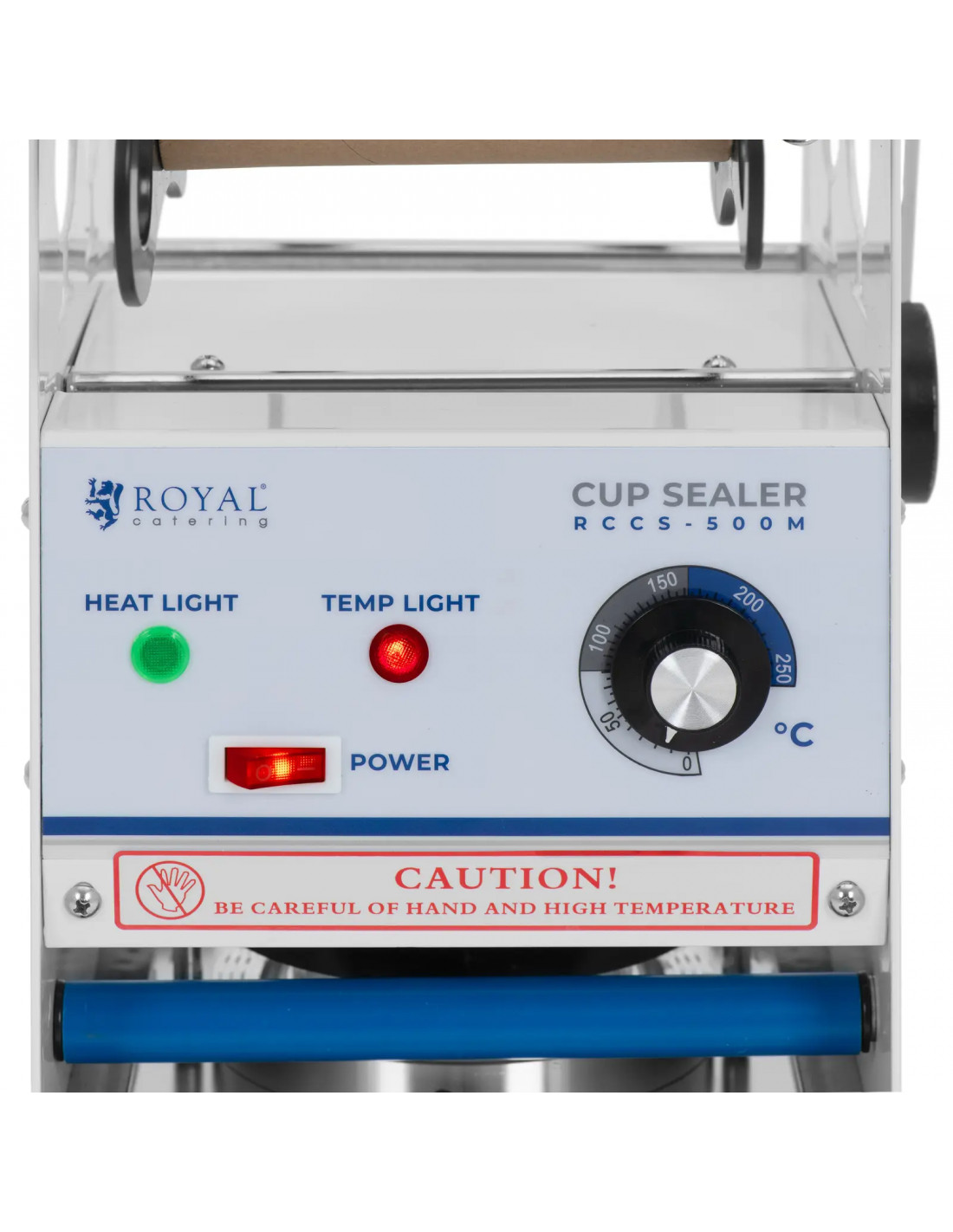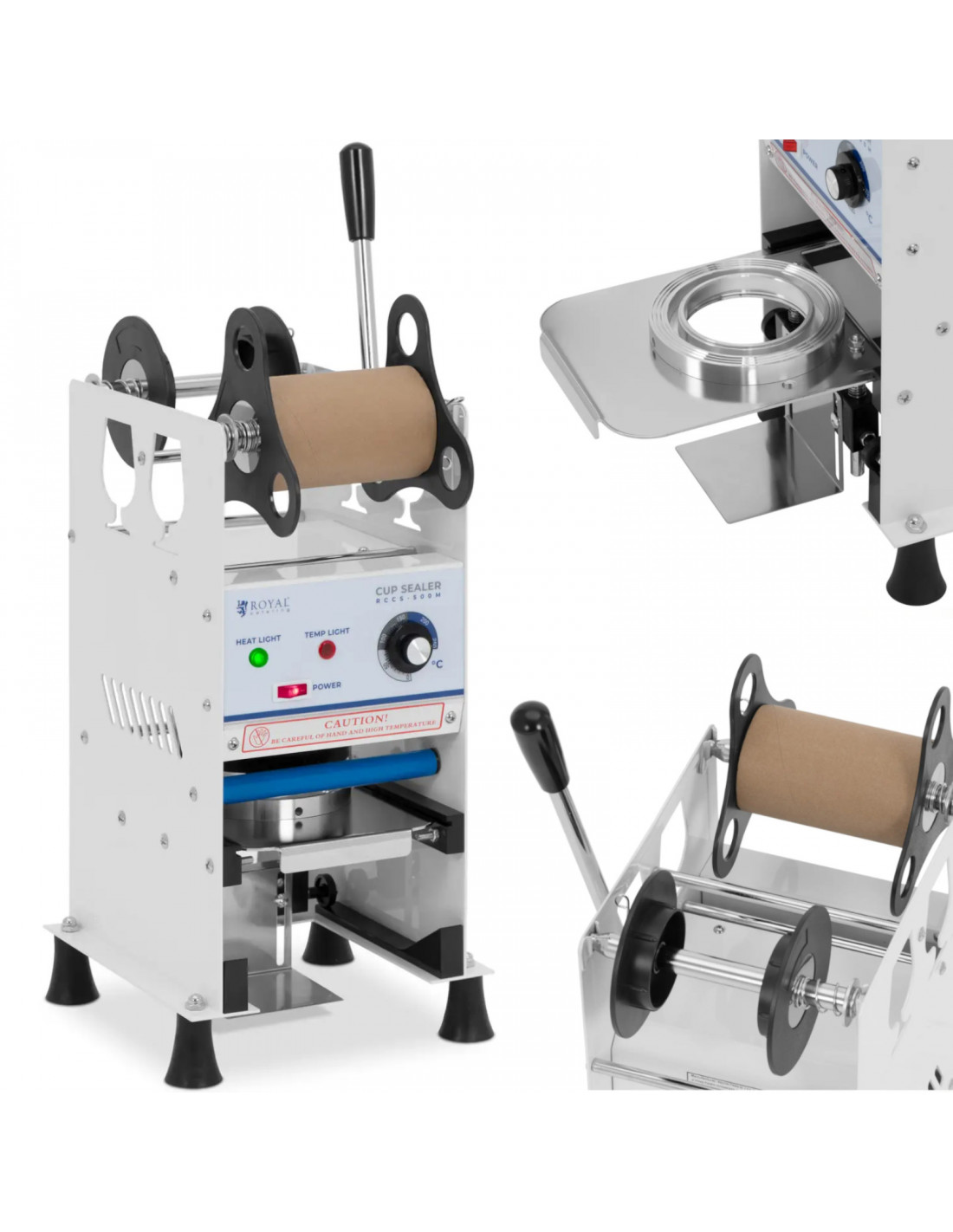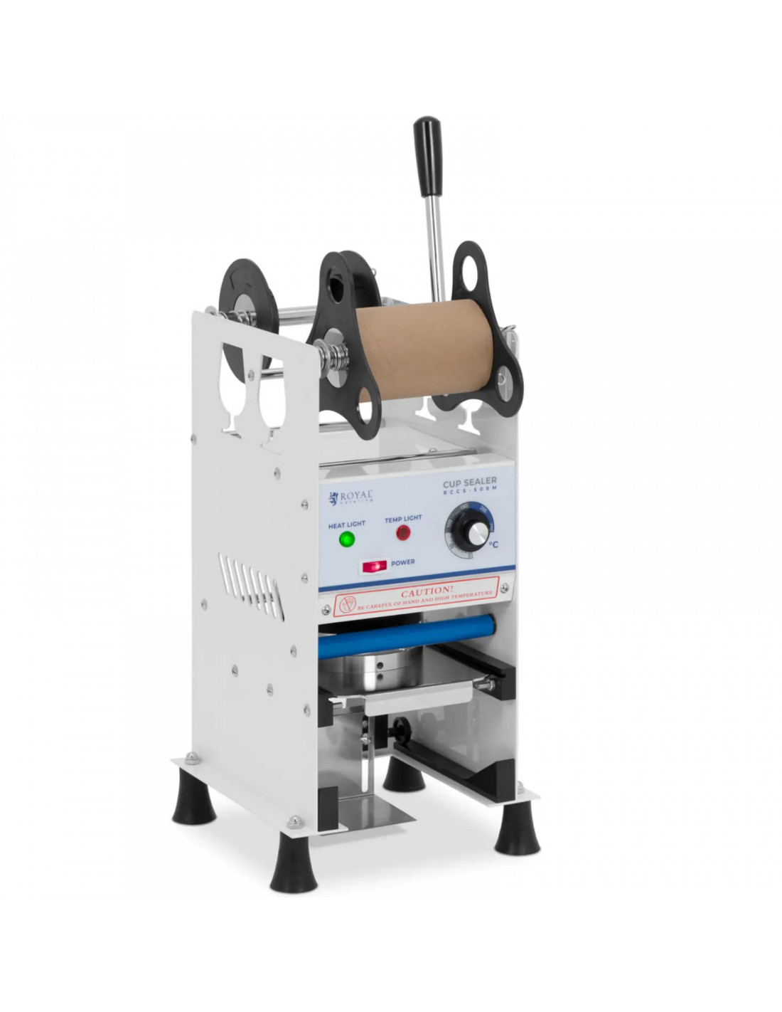 „Royal Catering“ puodelių sandarinimo aparatas leidžia greitai ir saugiai užsandarinti gėrimus plastikiniuose puodeliuose, kurių standartinis skersmuo yra 95/90 mm arba 95/75 mm . Aparatas sandarina indus folija (nepridedama), kuri rites pritvirtinama prie sandarinimo formos ir paduodama per įrenginį. Visi komponentai yra tiksliai suderinti, todėl užtikrinamas sklandus veikimas iki 500 puodelių per valandą . Aparatas yra efektyvus ir lengvai valdomas. Aiškus valdymo skydelis leidžia nustatyti temperatūrą nuo 0 iki 250 °C, kad būtų galima sandarinti indus ir PP, PE arba PET plėvelę. Pripildytų plastikinių puodelių lentynos aukštį galima reguliuoti iki 180 mm . Rankine svirtimi folija prispaudžiama prie indo krašto, kuris po to saugiai užsandarinama. Korpusas, lentyna ir folijos voleliai pagaminti iš stabilaus ir patvaraus anglinio plieno, todėl jie yra patvarūs ir tinkami kasdieniam naudojimui. Aparatas stovi ant neslystančių guminių kojelių ir yra stabilus net ir intensyviai naudojant.