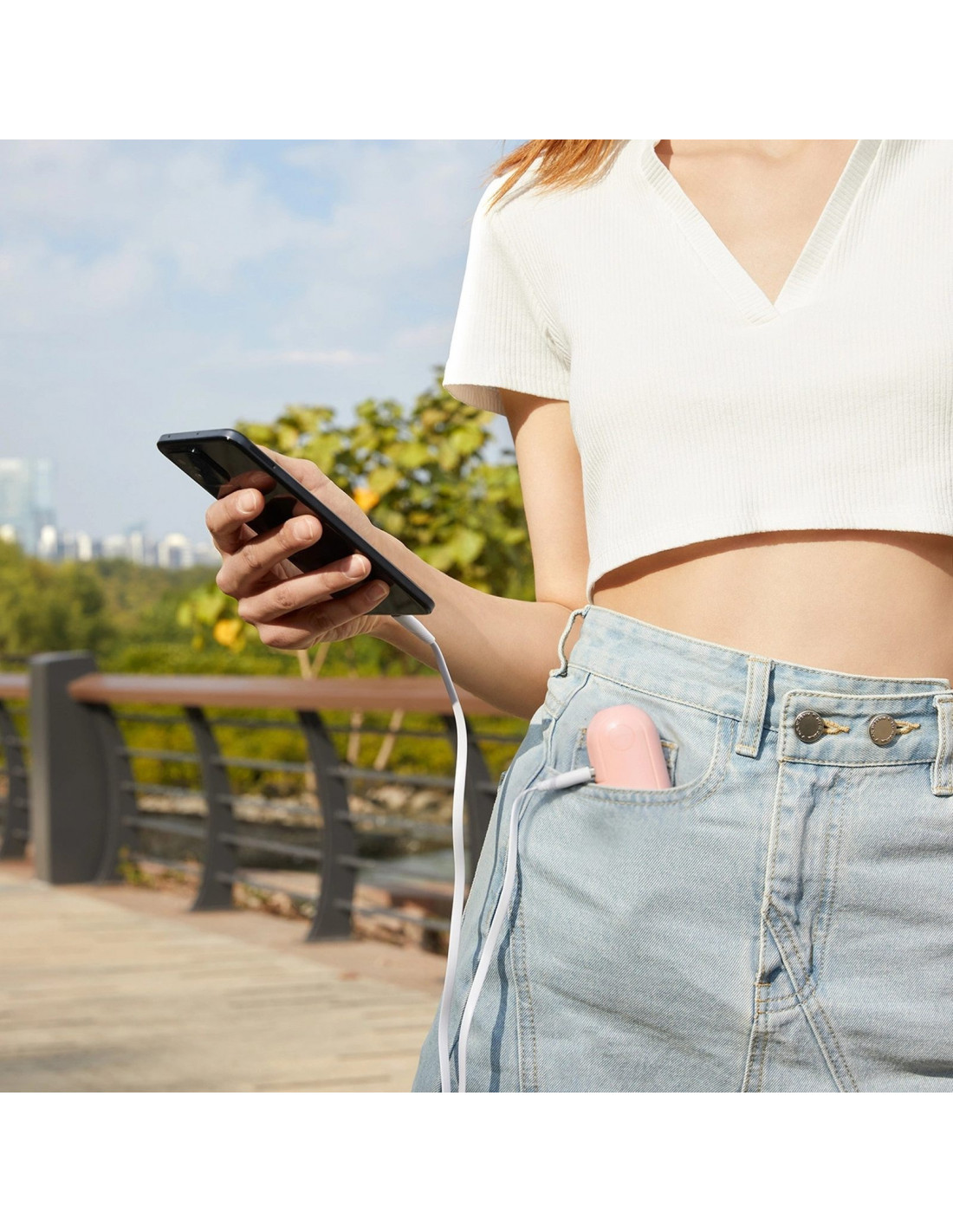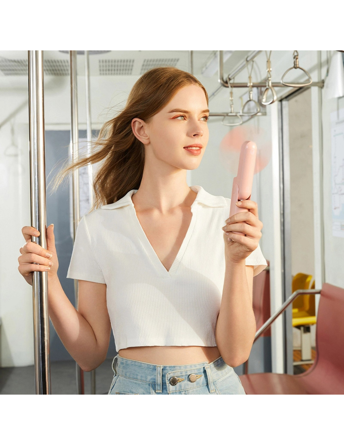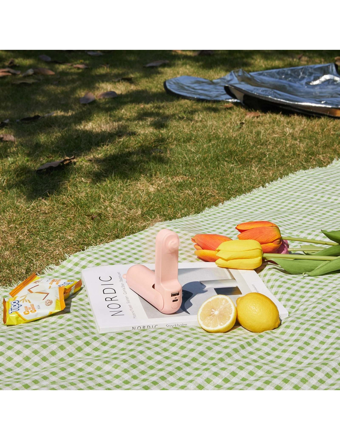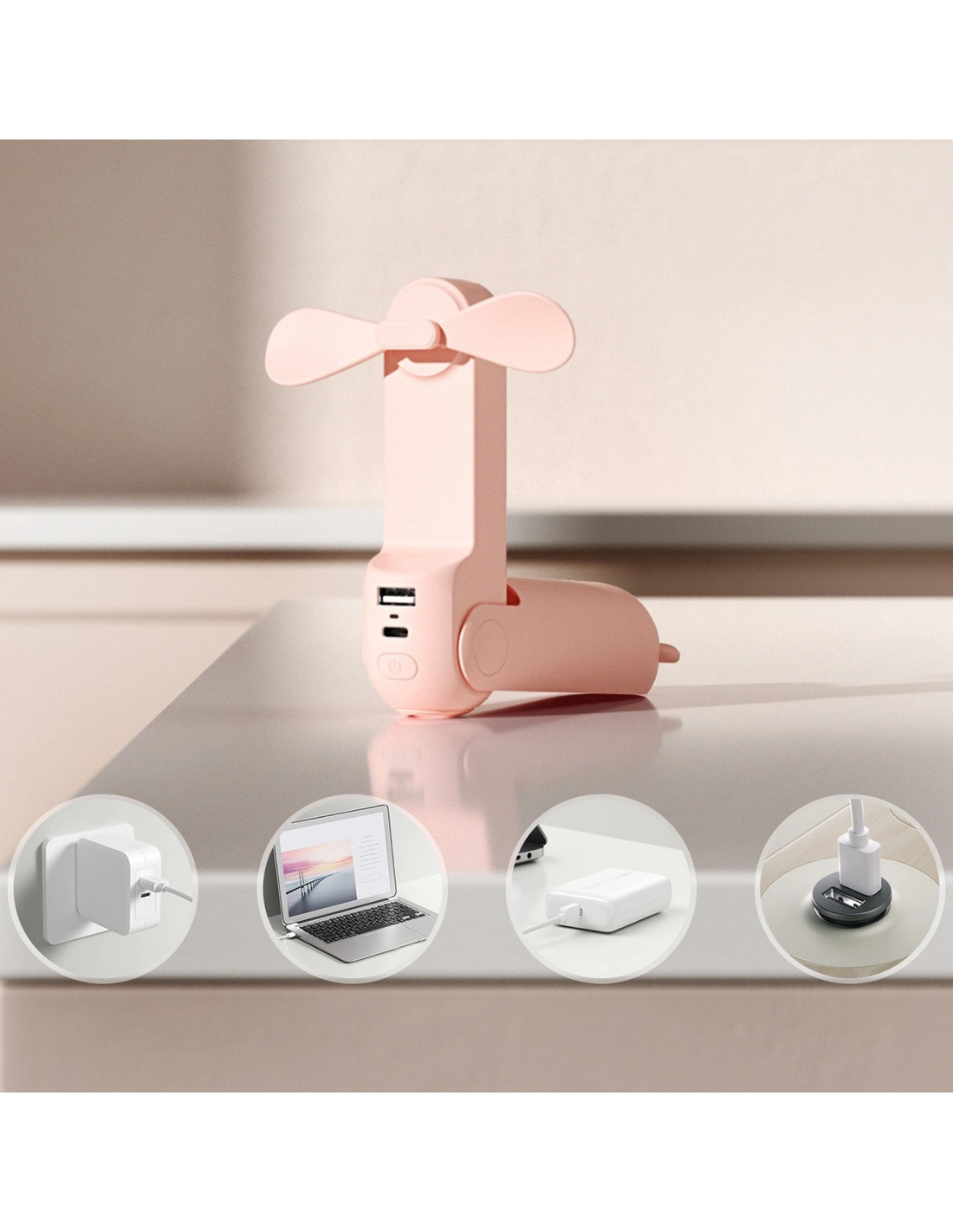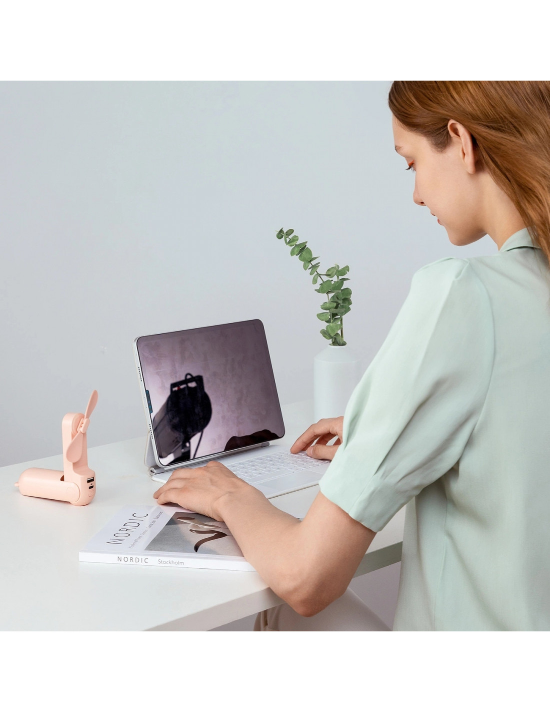 Nešiojamas mini ventiliatorius su USB-A ir USB-C žibintuvėliu, 4500 mAh, rožinis