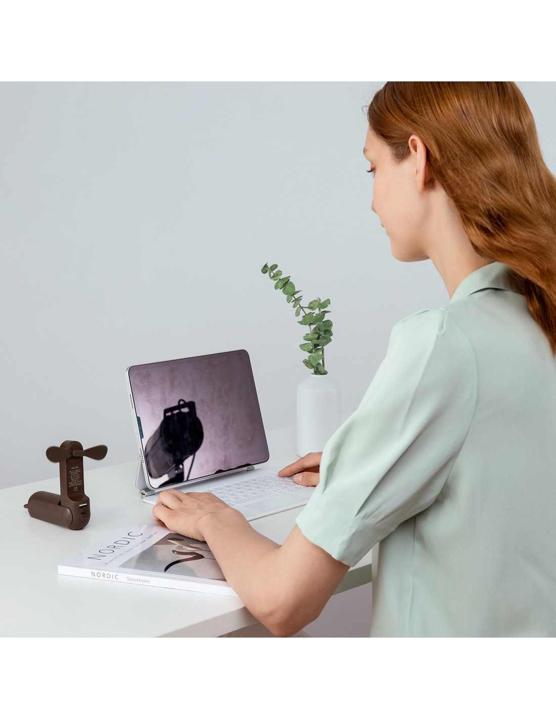 Nešiojamas mini ventiliatorius su USB-A ir USB-C žibintuvėliu, 4500 mAh, rudas