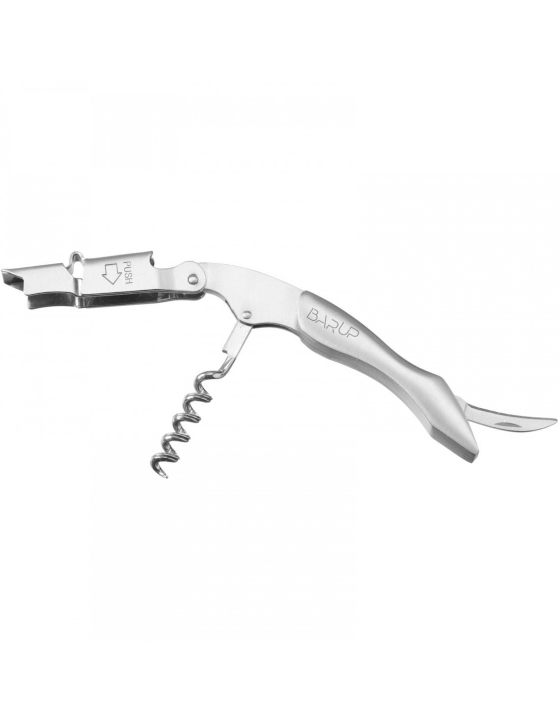 „BarUP“ padavėjo butelių atidarytuvas yra patvarus, daugiafunkcis įrankis, pagamintas iš nerūdijančio plieno su patogia rankena. Jis turi tris integruotas funkcijas: folijos pjaustytuvą, klasikinį kamščiatraukį ir butelių atidarytuvą.