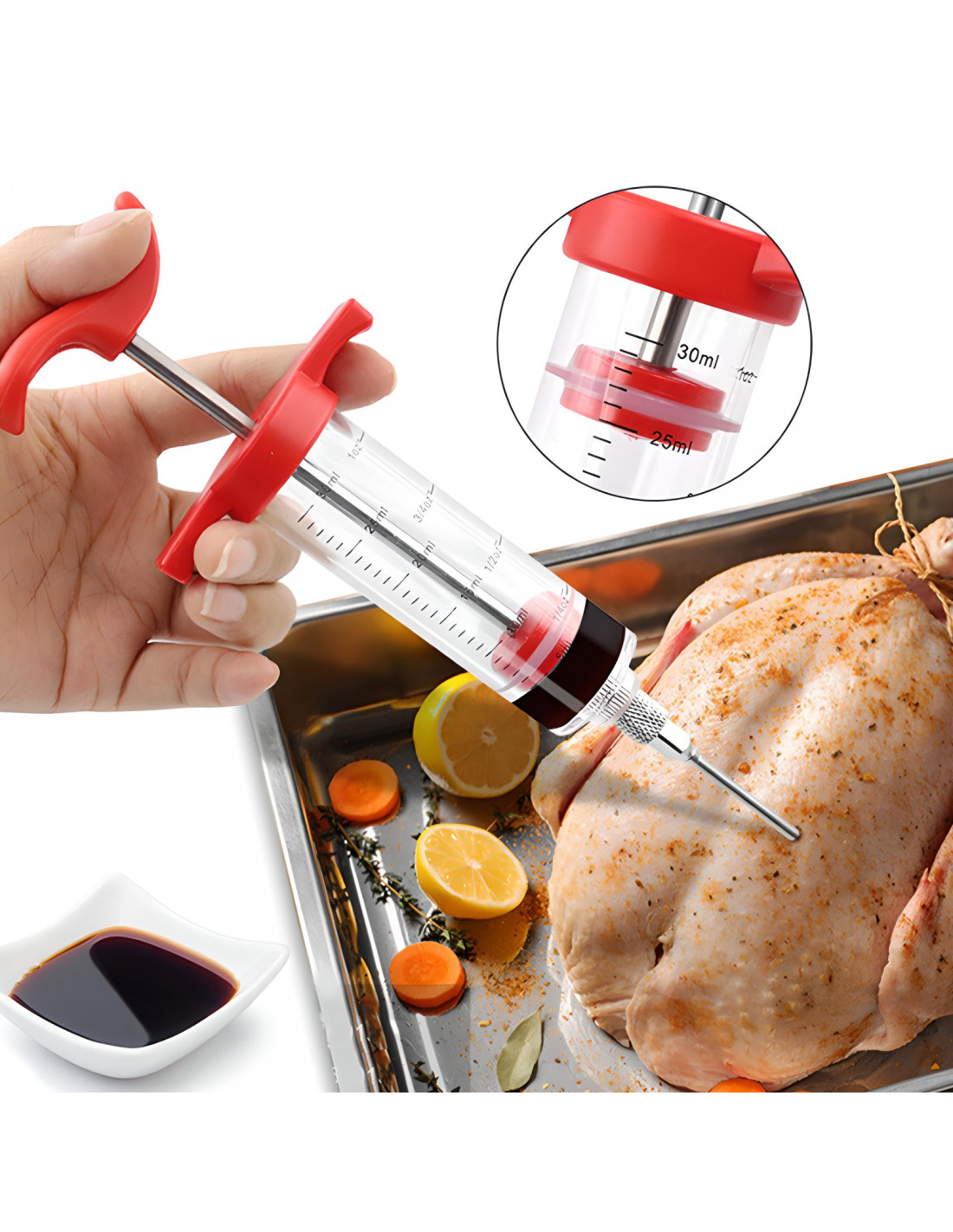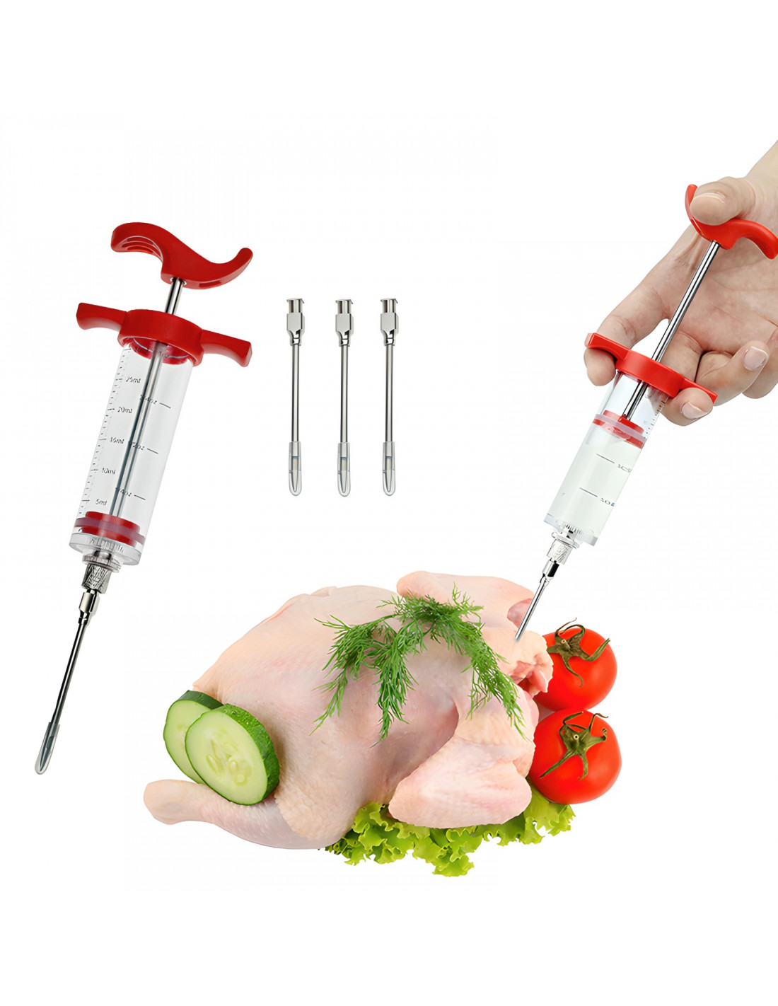 30 ml mėsos švirkštas su trimis adatomis sūdymui ir marinavimui yra nepakeičiamas įrankis naminių šaltų mėsos gaminių ir sultingų kepsnių mėgėjams. Jis leidžia greitai ir tolygiai į mėsą įpilti marinatų ir sūrymų, sutrumpinant sūdymo laiką ir suteikiant patiekalams gilų skonį bei aromatą. Dėl trijų specializuotų adatų galite naudoti tiek skystus, tiek tirštus marinatus su prieskoniais. Visas prietaisas pagamintas iš saugių medžiagų: ABS plastiko ir nerūdijančio plieno, kuris yra atsparus korozijai ir lengvai valomas.
