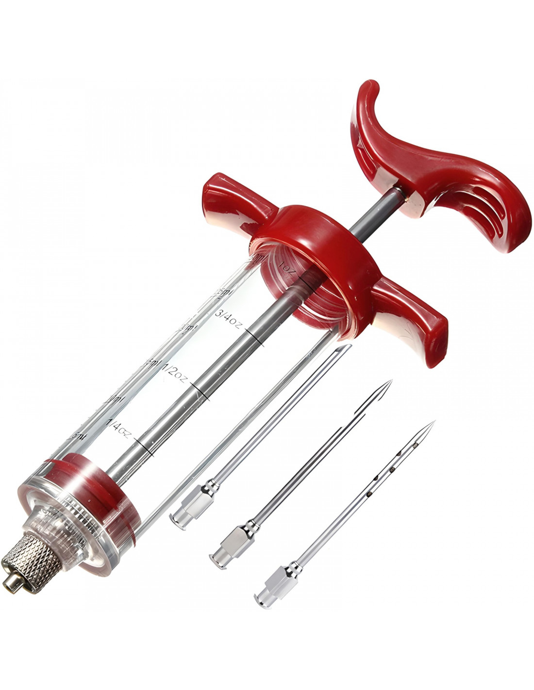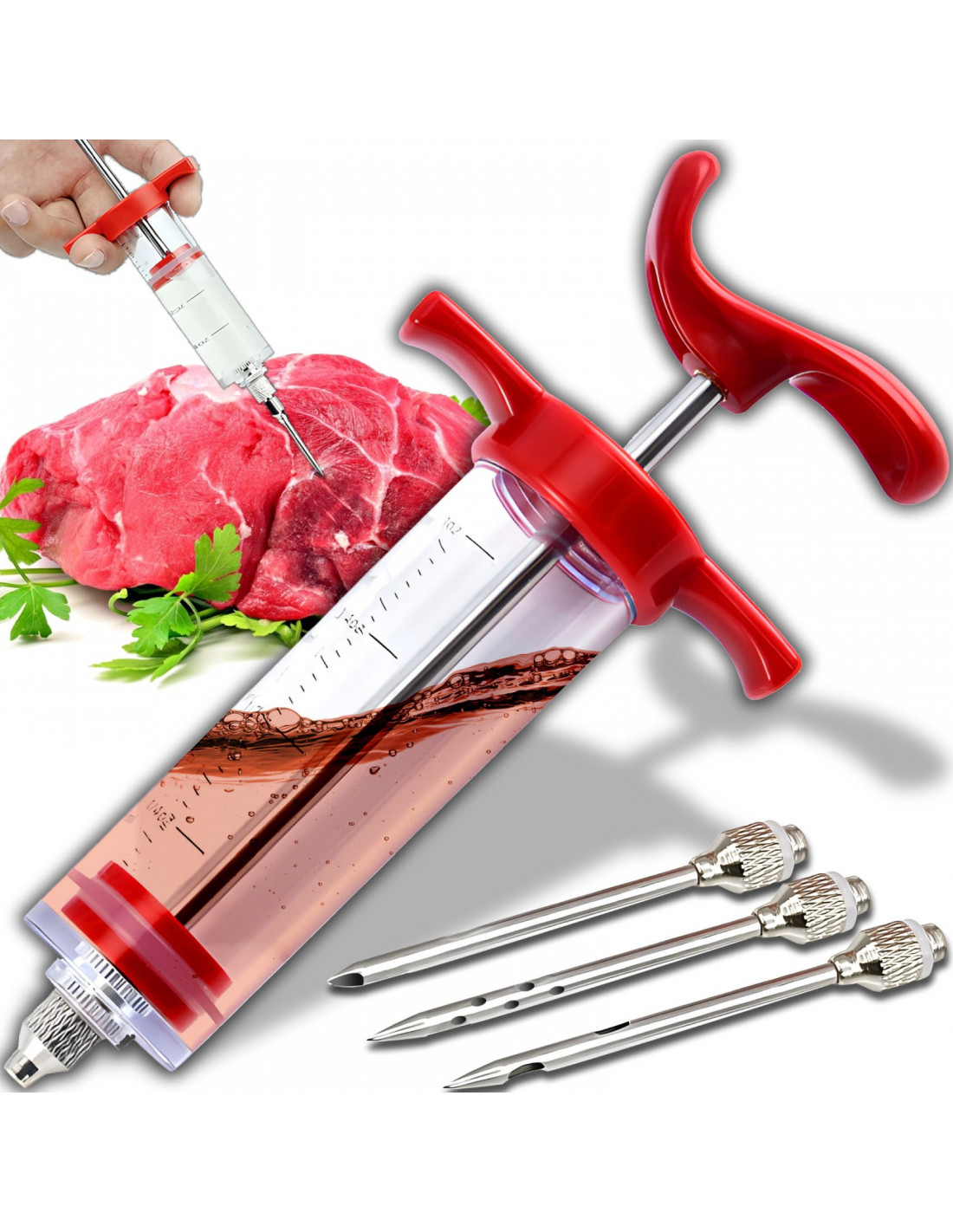 30 ml mėsos švirkštas su trimis adatomis sūdymui ir marinavimui yra nepakeičiamas įrankis naminių šaltų mėsos gaminių ir sultingų kepsnių mėgėjams. Jis leidžia greitai ir tolygiai į mėsą įpilti marinatų ir sūrymų, sutrumpinant sūdymo laiką ir suteikiant patiekalams gilų skonį bei aromatą. Dėl trijų specializuotų adatų galite naudoti tiek skystus, tiek tirštus marinatus su prieskoniais. Visas prietaisas pagamintas iš saugių medžiagų: ABS plastiko ir nerūdijančio plieno, kuris yra atsparus korozijai ir lengvai valomas.