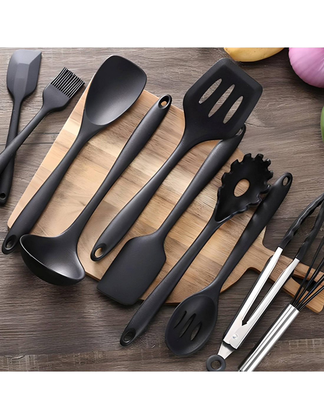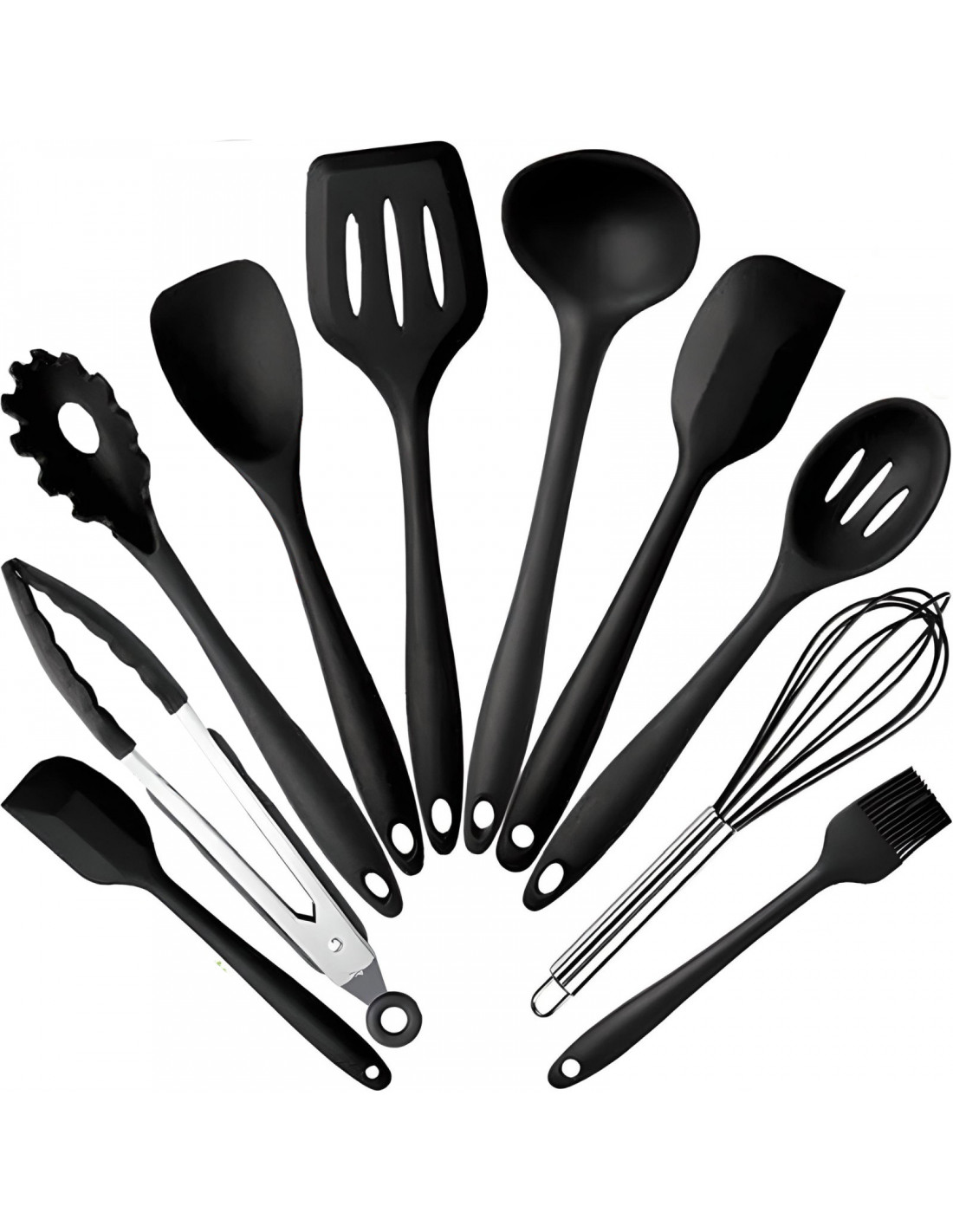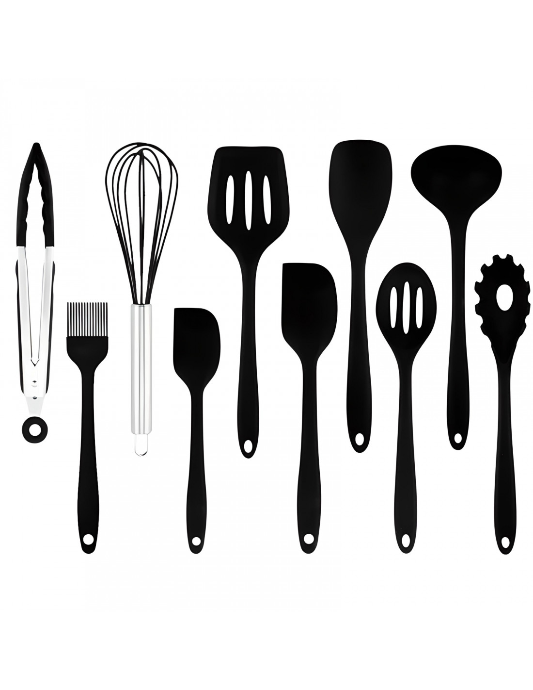 Šis 10 dalių silikoninių virtuvės įrankių rinkinys – juodas – yra praktiškas priedų rinkinys, kuris palengvina maisto gaminimą ir apsaugo virtuvės reikmenis nuo įbrėžimų. Pagaminti iš aukštos kokybės, karščiui atsparaus, be BPA silikono , šie įrankiai yra saugūs, lankstūs ir patvarūs. Jie puikiai tinka bet kuriai virtuvei – kepimui, virimui ar maisto patiekimui.