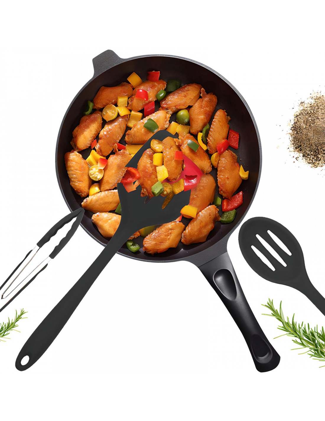 Šis 10 dalių silikoninių virtuvės įrankių rinkinys – juodas – yra praktiškas priedų rinkinys, kuris palengvina maisto gaminimą ir apsaugo virtuvės reikmenis nuo įbrėžimų. Pagaminti iš aukštos kokybės, karščiui atsparaus, be BPA silikono , šie įrankiai yra saugūs, lankstūs ir patvarūs. Jie puikiai tinka bet kuriai virtuvei – kepimui, virimui ar maisto patiekimui.