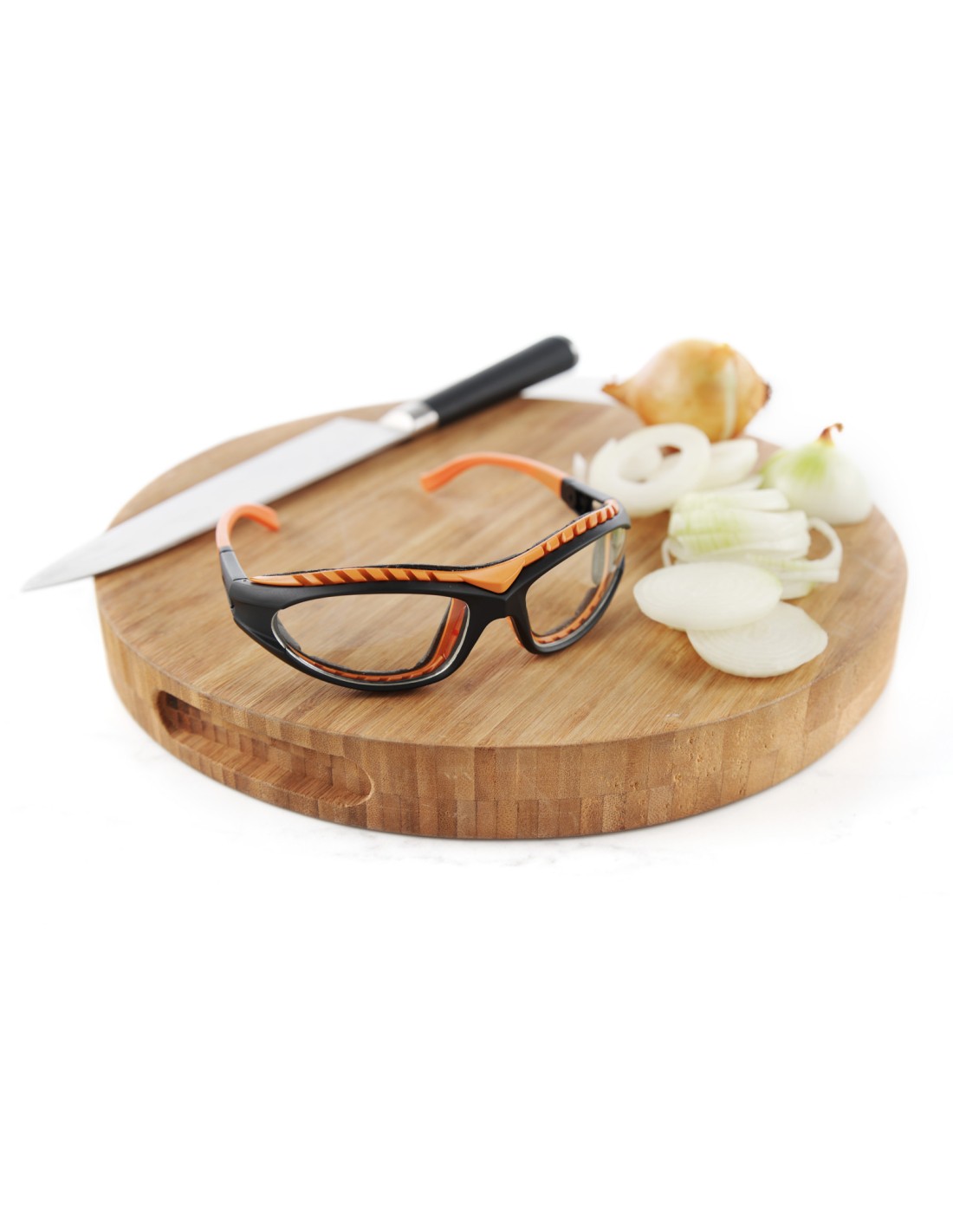 Specialūs akiniai, kurių dėka pjaunant svogūnus nemirksta akys.