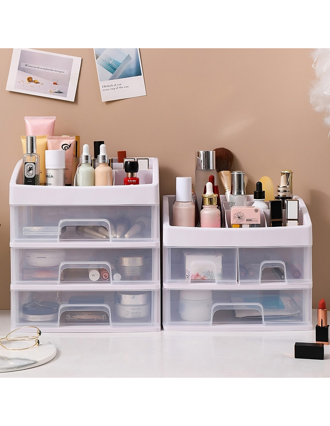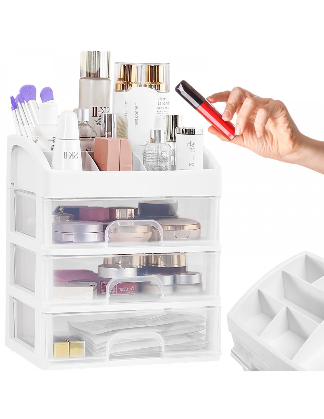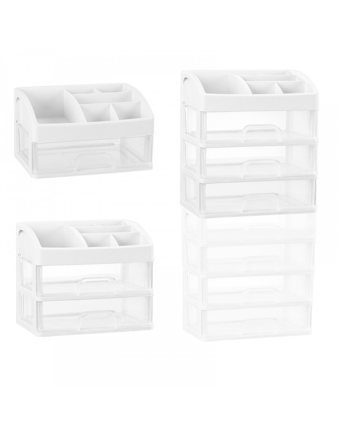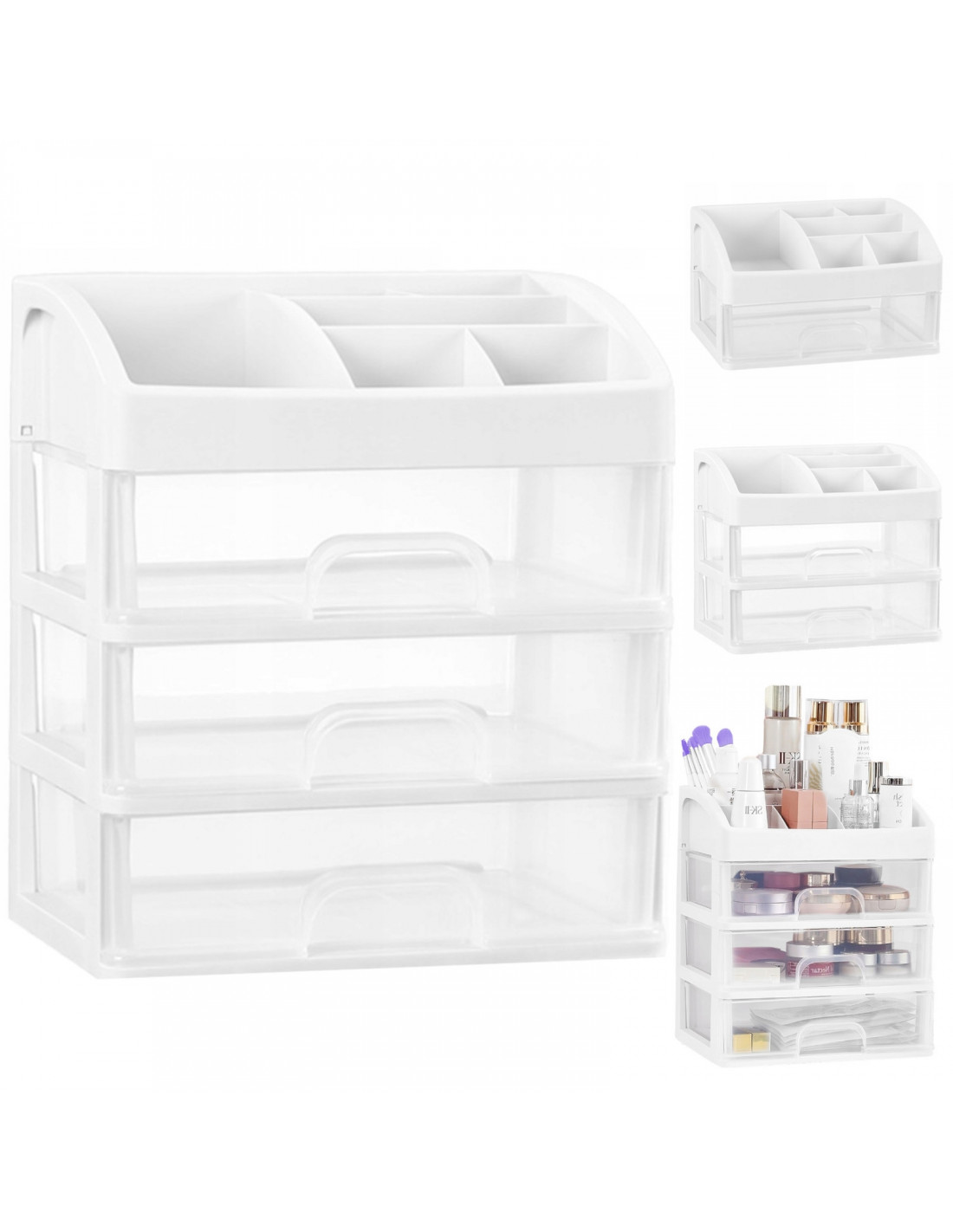 Šis kosmetikos organizatorius yra praktiškas sprendimas kosmetikai, papuošalams, biuro reikmenims ir smulkiems aksesuarams laikyti. Jis turi keturis daiktų laikymo lygius : tris erdvius stalčius ir viršutinę lentyną su šešiais skyriais, leidžiančius patogiai sutvarkyti įvairius daiktus. Pagamintas iš patvaraus, aukštos kokybės PP plastiko, jis pasižymi universaliu dizainu, kuris tinka vonios kambariui, persirengimo kambariui ar biurui.