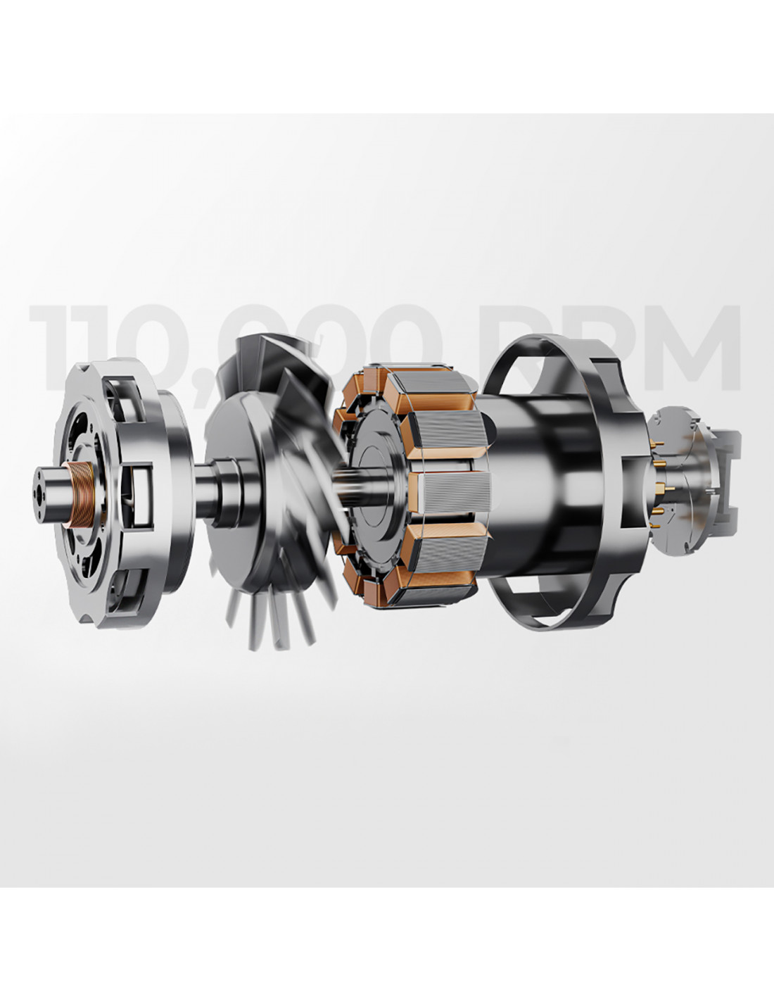 - - Didelės spartos bešepetis variklis: patentuotas 110 000 aps./min. variklis garantuoja greitą ir efektyvų oro srautą žaibiškai greitam džiovinimui,