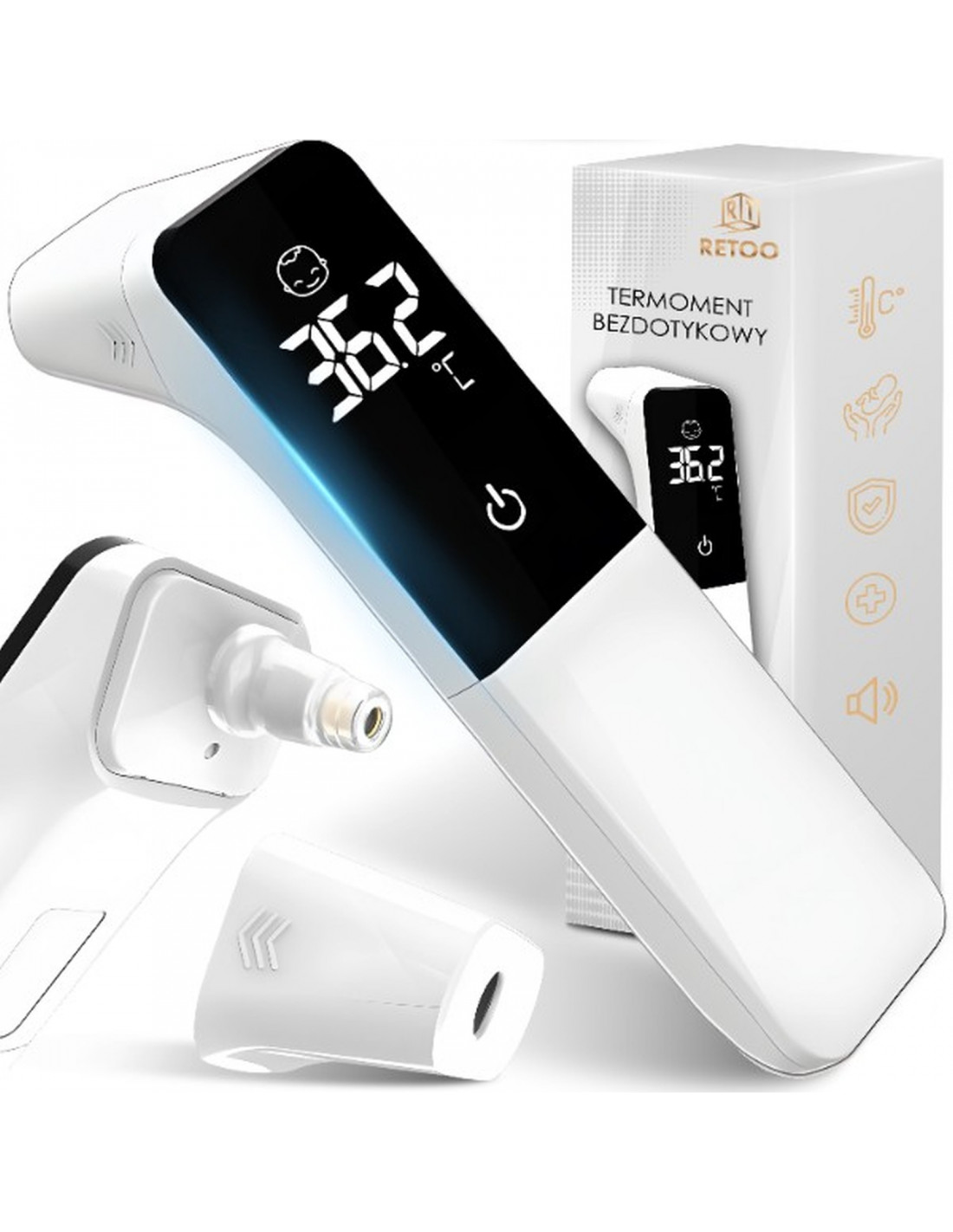 „RETOO Healthcare ER991“ bekontaktis infraraudonųjų spindulių termometras kūno ir daiktų temperatūrai matuoti yra modernus medicinos prietaisas, leidžiantis greitai, higieniškai ir tiksliai atlikti matavimus be sąlyčio su oda. Idealiai tinka naudoti vaikams ir suaugusiesiems, tiek ant kaktos, tiek ant ausies. Įrengtas aukštos temperatūros signalizacija ir aiškus LCD ekranas.